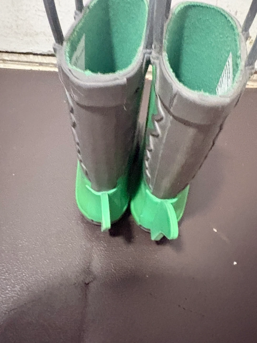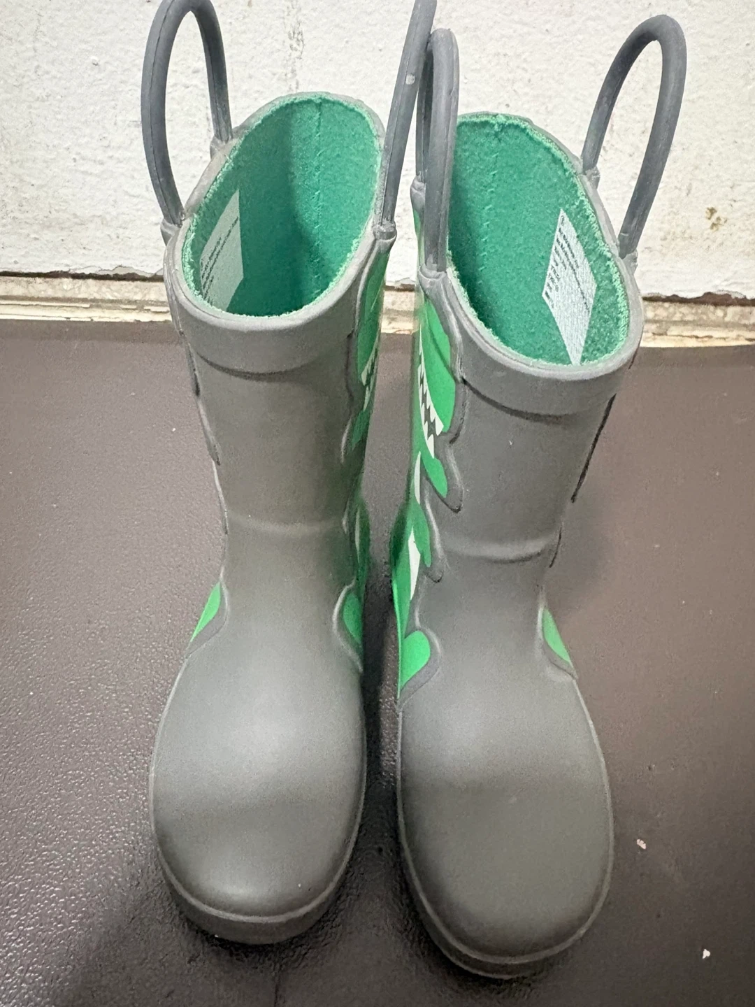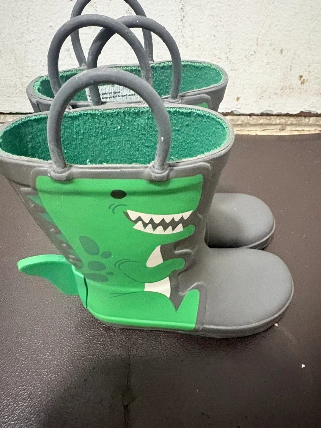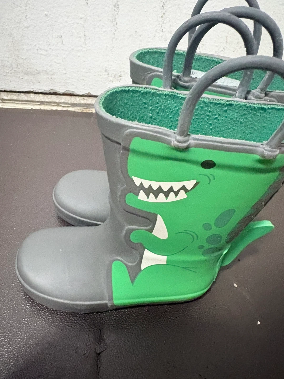 These grey and green rain boots feature a fun dinosaur design! They have easy-grip handles for little ones. Perfect for splashing in puddles!