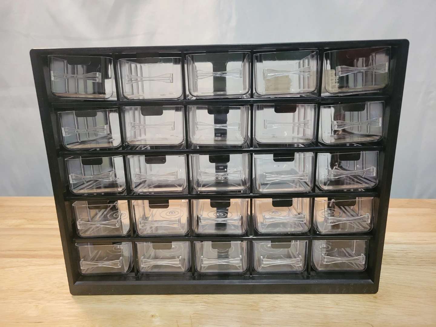 92I'm selling a black NEW small parts organizer storage cabinet. It has 25 clear drawers. Each drawer can be devided into 4 parts. Dimensions are: 11,5"×5"×9"(tall) Drawer dimensions: 4,5"×2"