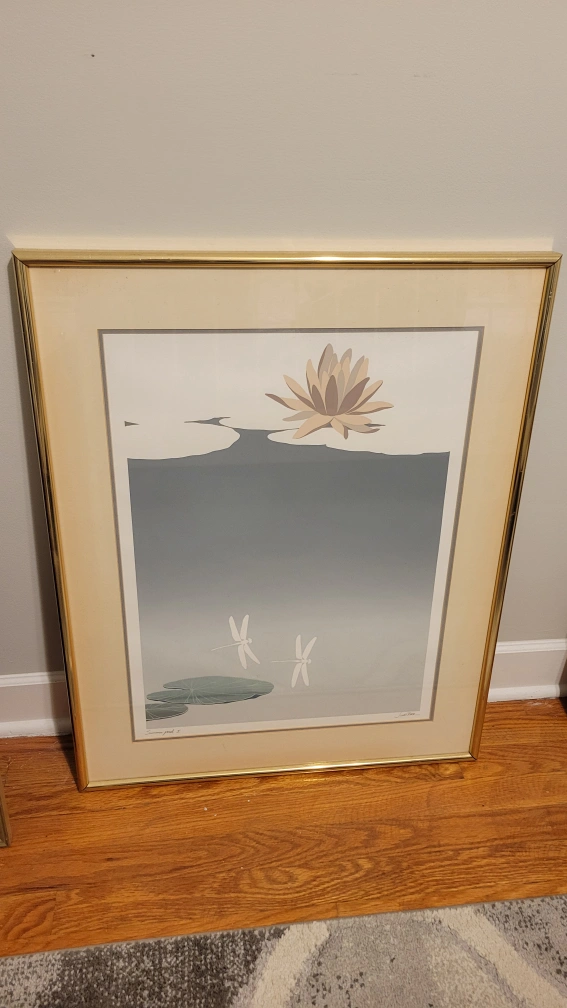 15This is a framed piece of art featuring a lily pad and dragonflies. It would make a great addition to any room! 25" x 31" Framed and Matted Prints Summer Pond I by Jung Park