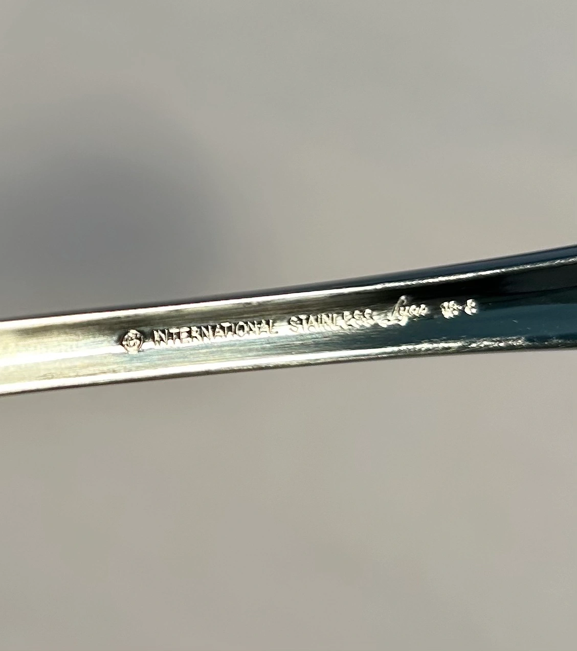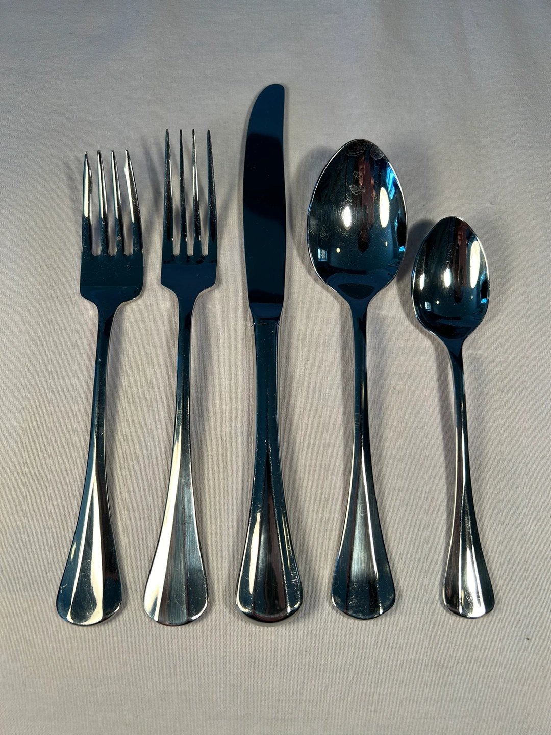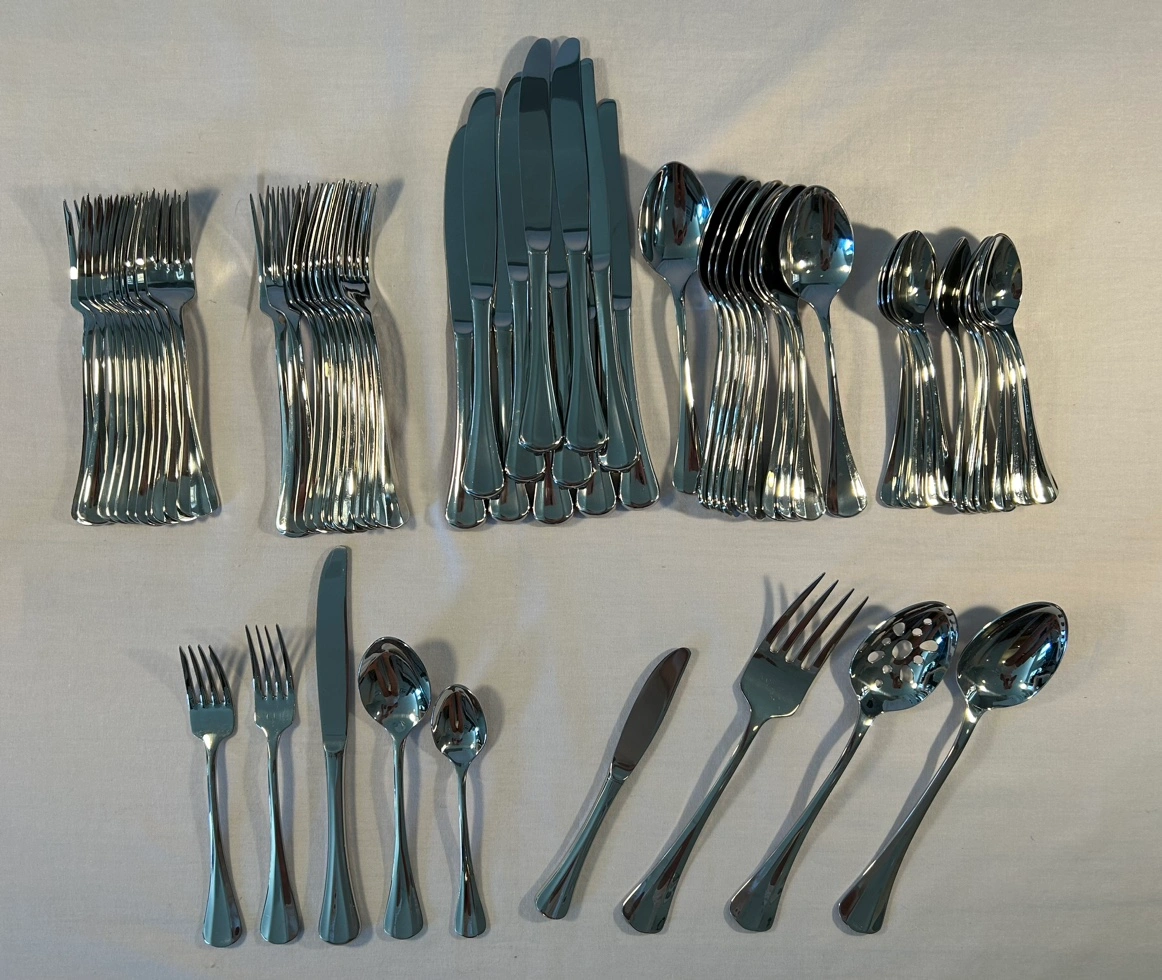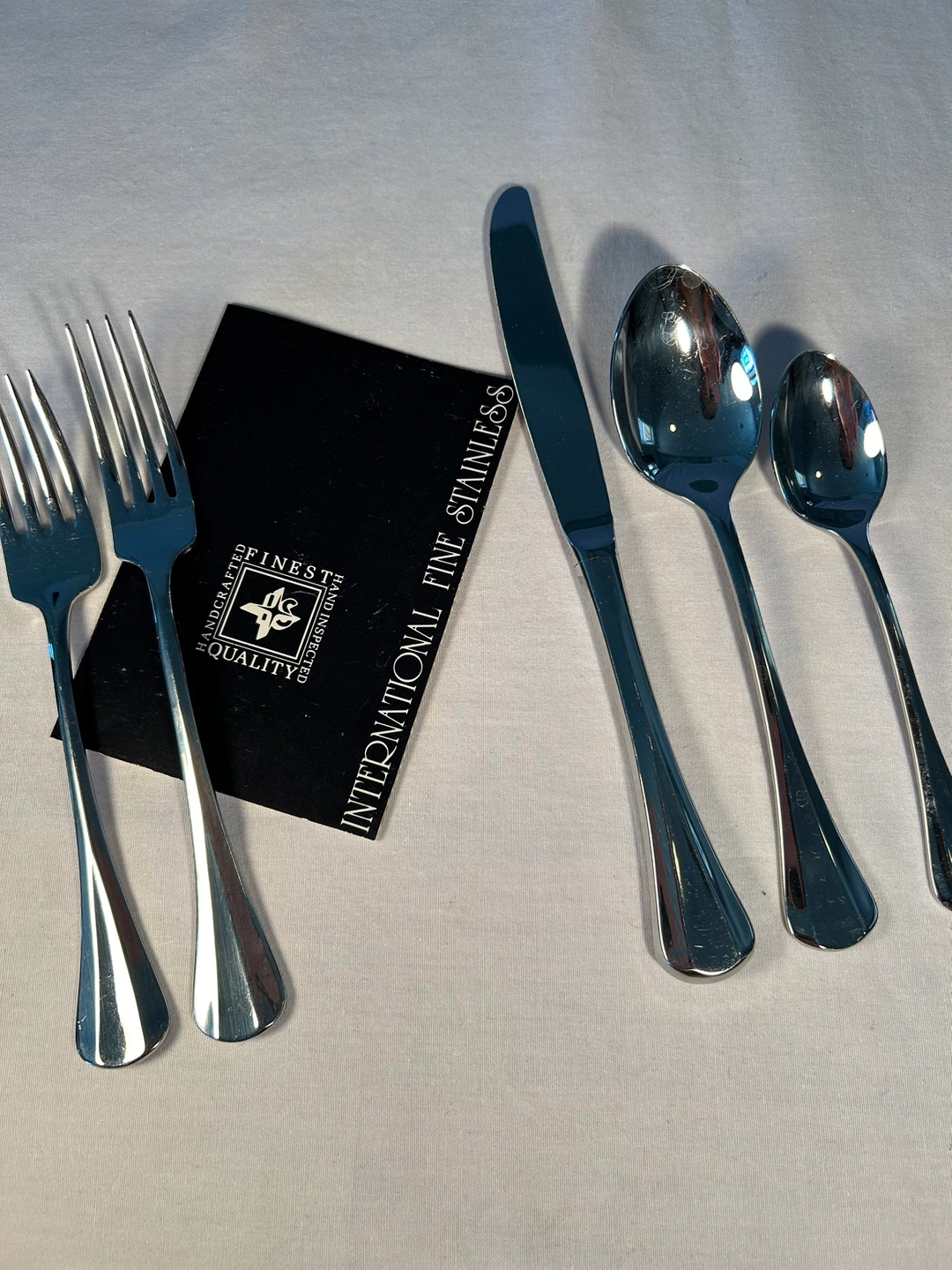 Timeless design - flatware, cutlery, contemporary. International Silver (now Wallace International) - Lyon Collection - Symmetry pattern - glossy finish. Service for 12, plus 4 serving pieces. Bridal or kitchen shower, housewarming gift. Vintage tablescape 1970. New high-end 60pcs. stainless sets range $250-$450.
