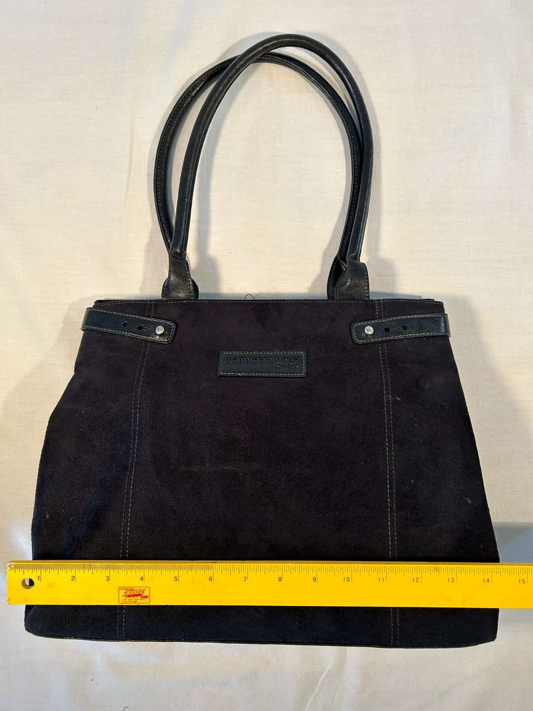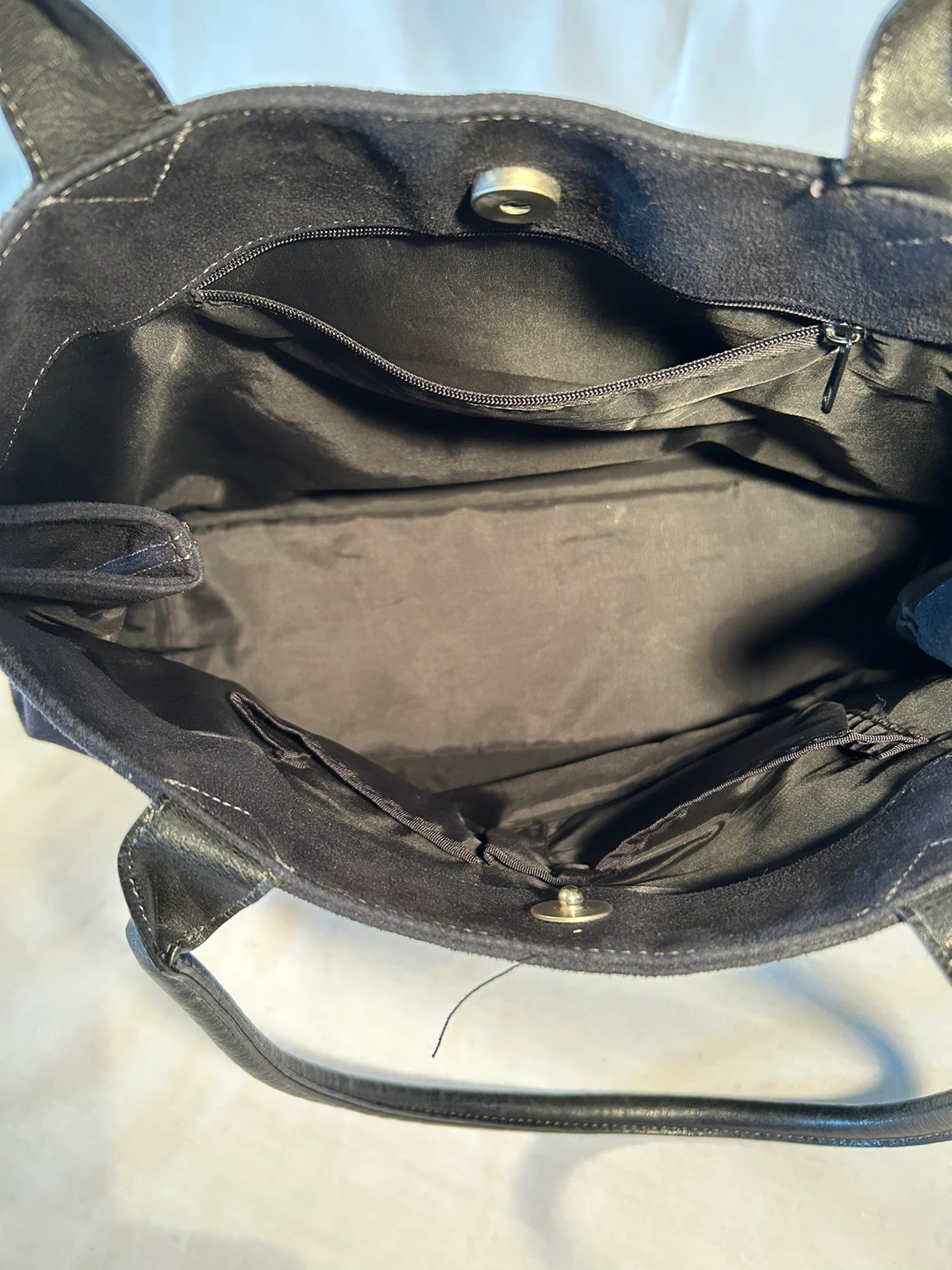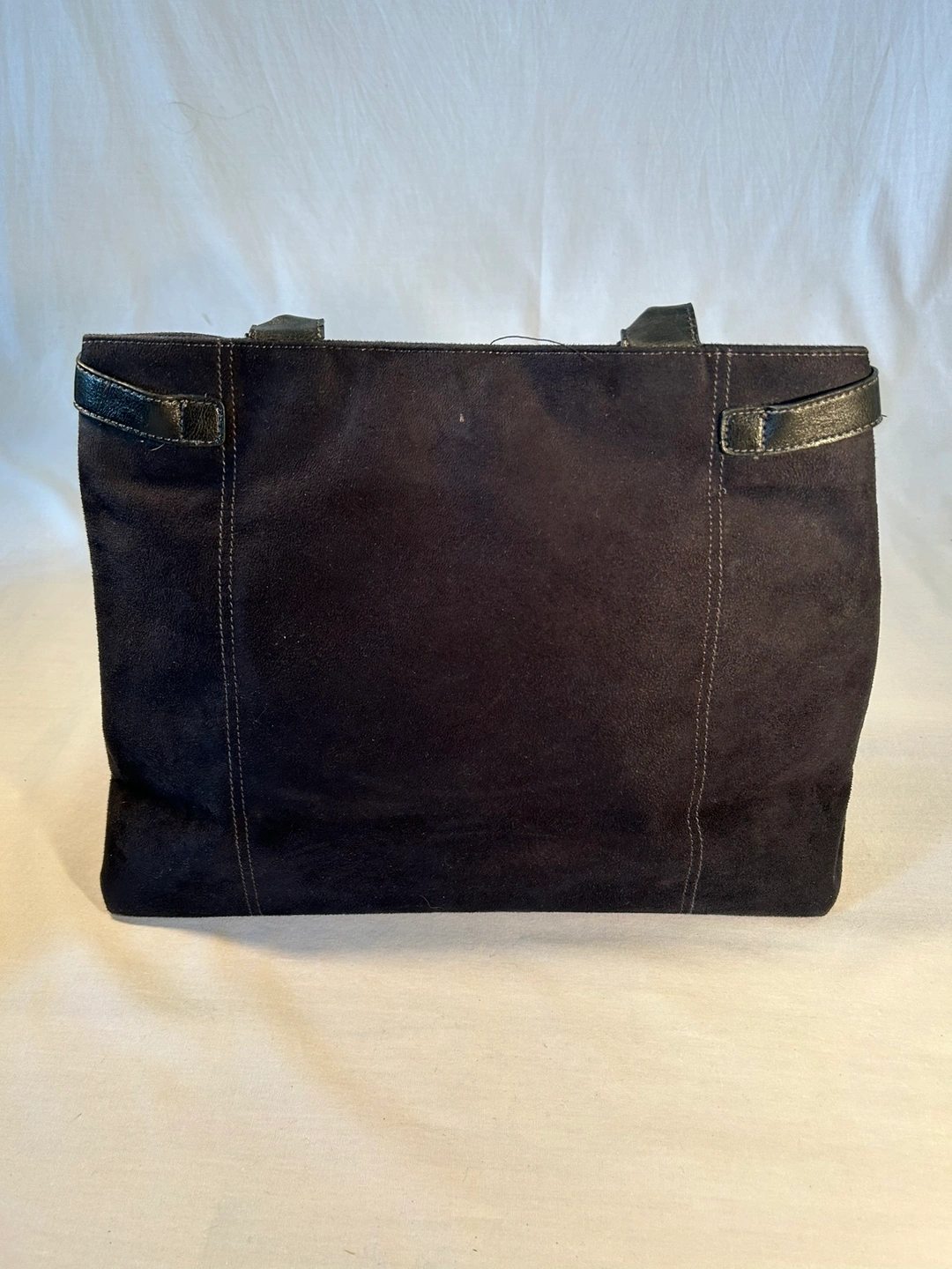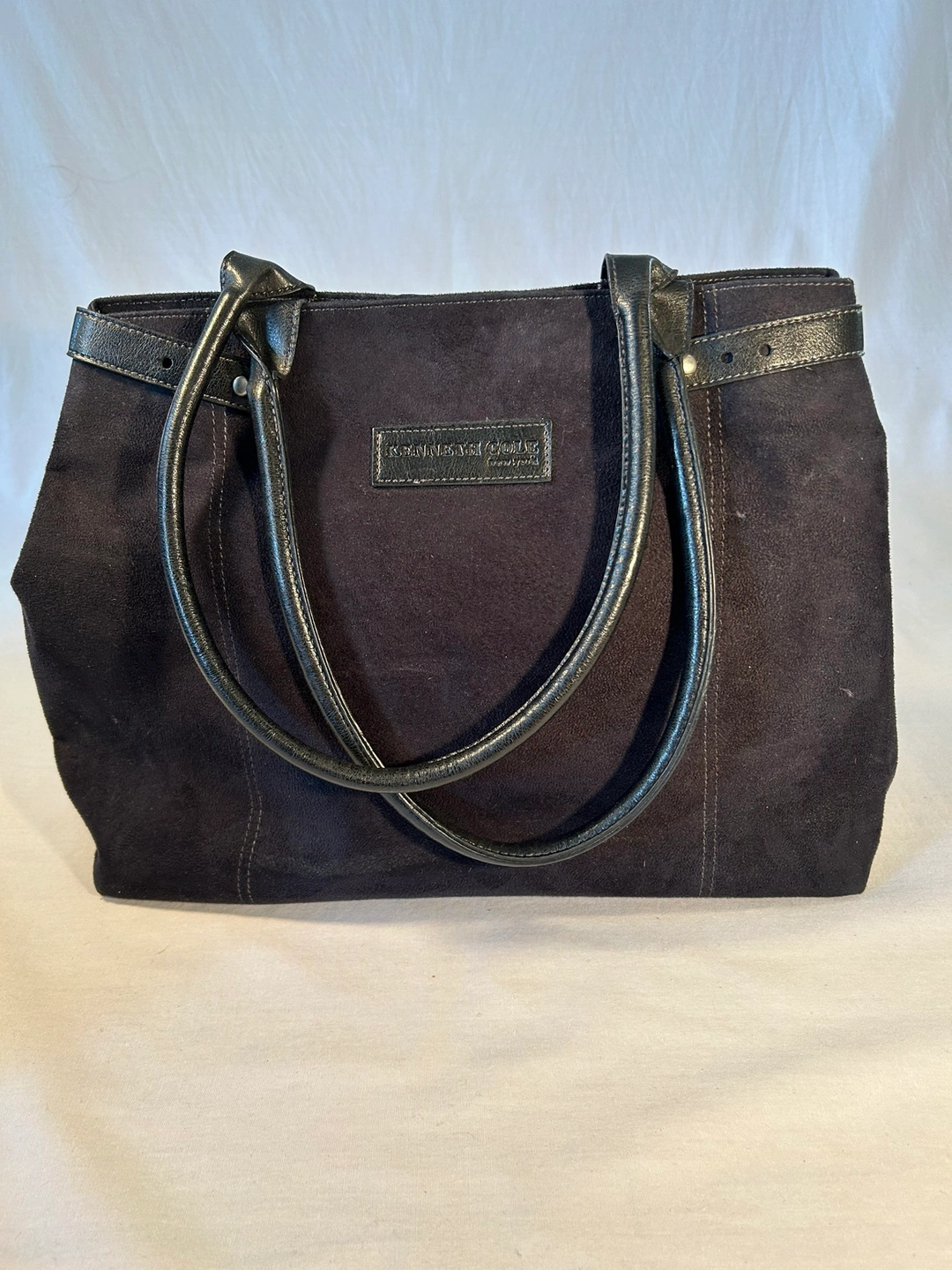 Large, roomy tote bag purse. Synthetic, soft & clean sueded material. Cool, adjustable straps to scrunch or open up top of handbag. Comfortable rolled shoulder straps, magnetic snap closure, cloth lined, 3 inside pockets (1 zips), and pen slot. Fits 13” laptop.