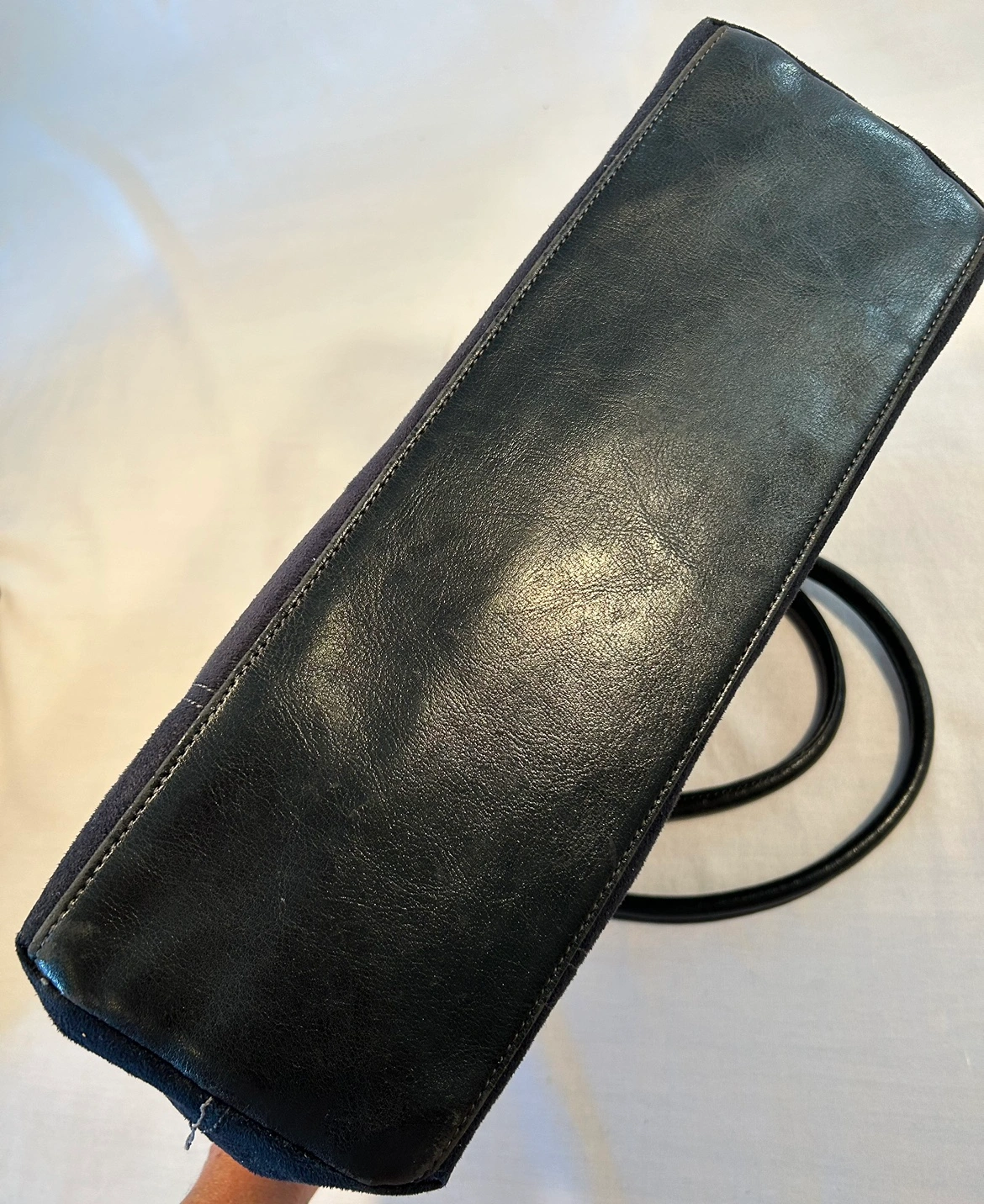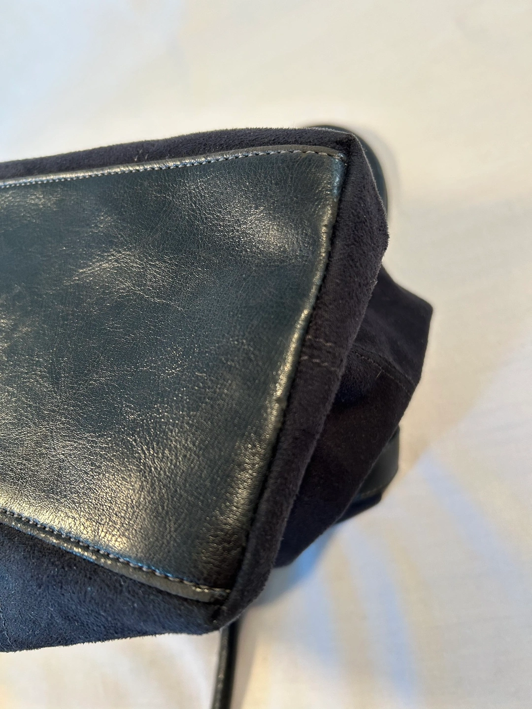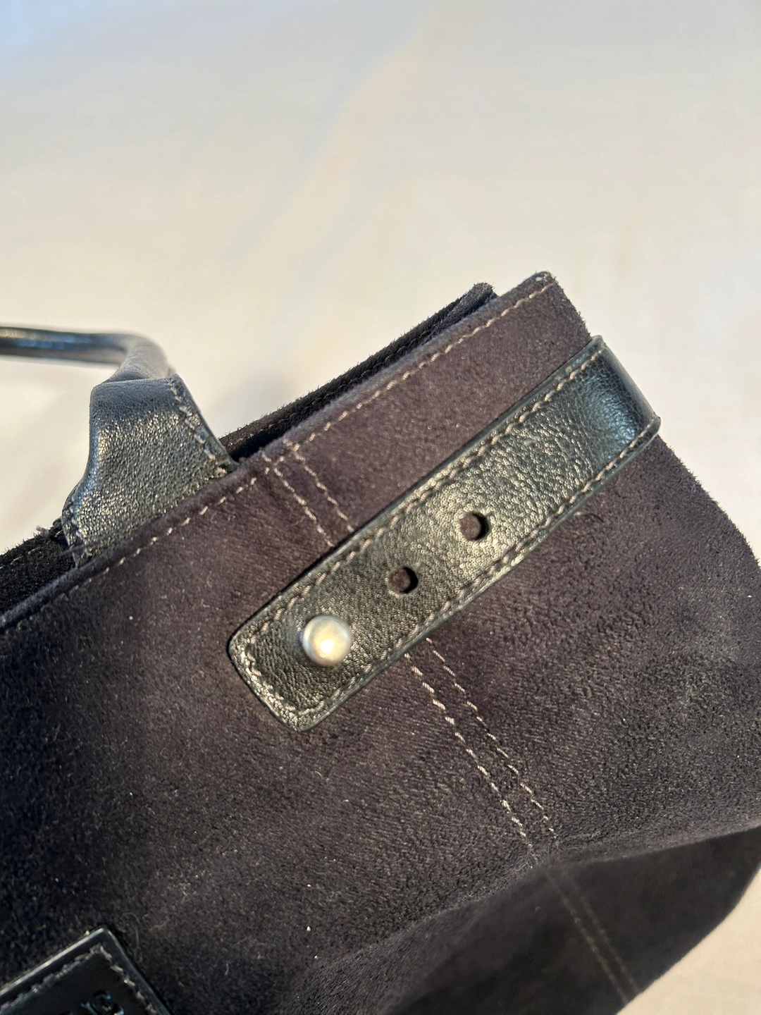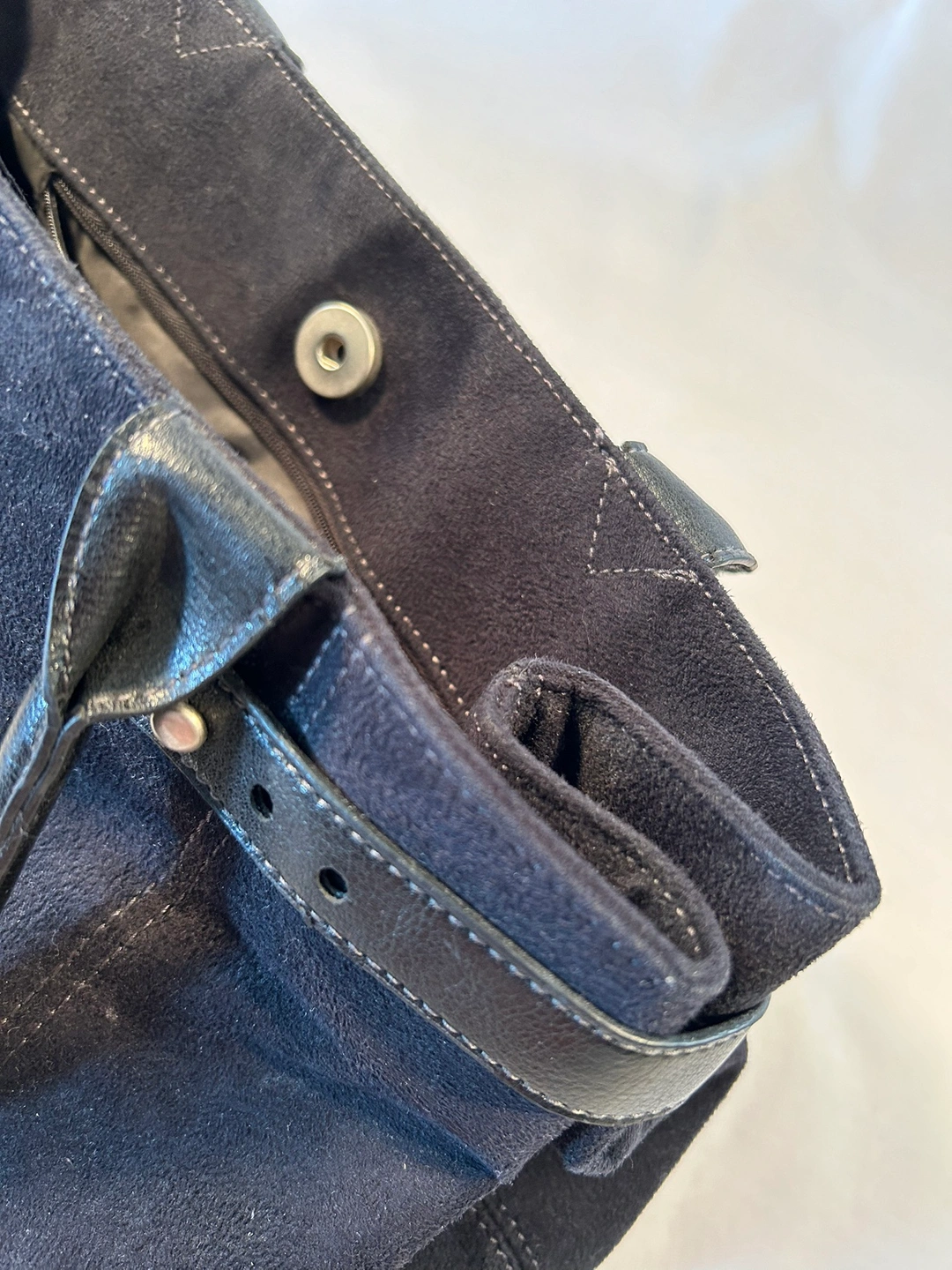 Large, roomy tote bag purse. Synthetic, soft & clean sueded material. Cool, adjustable straps to scrunch or open up top of handbag. Comfortable rolled shoulder straps, magnetic snap closure, cloth lined, 3 inside pockets (1 zips), and pen slot. Fits 13” laptop.