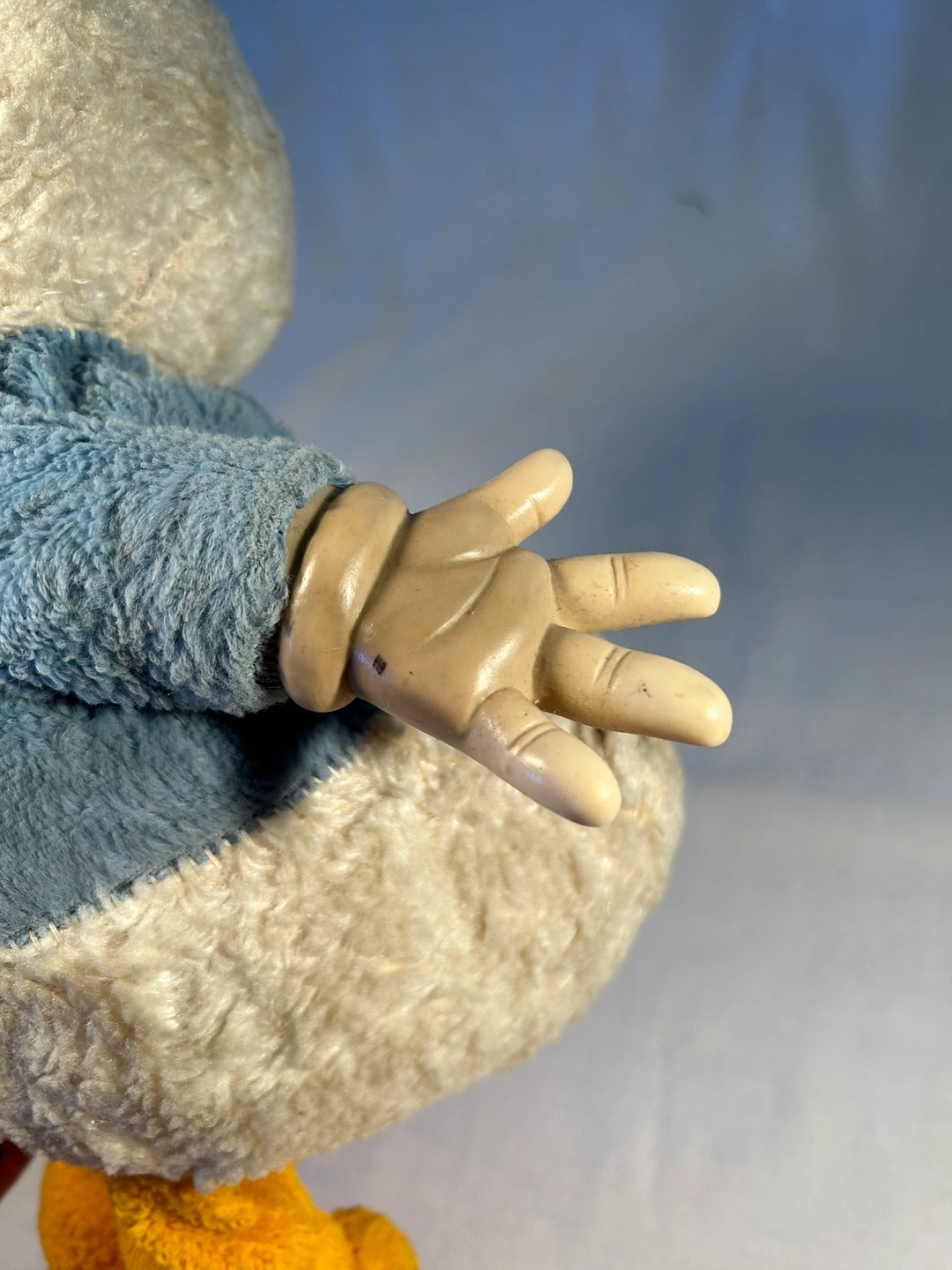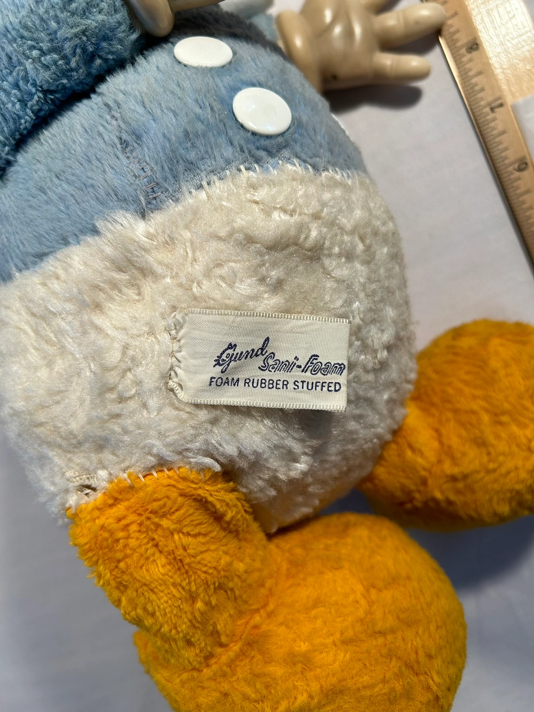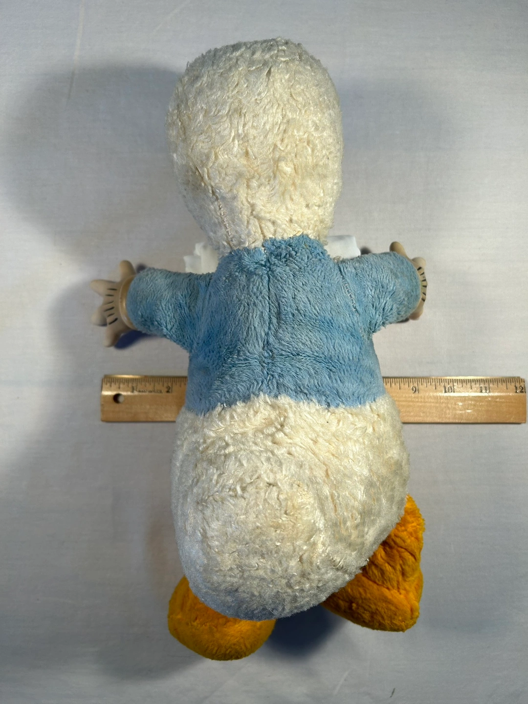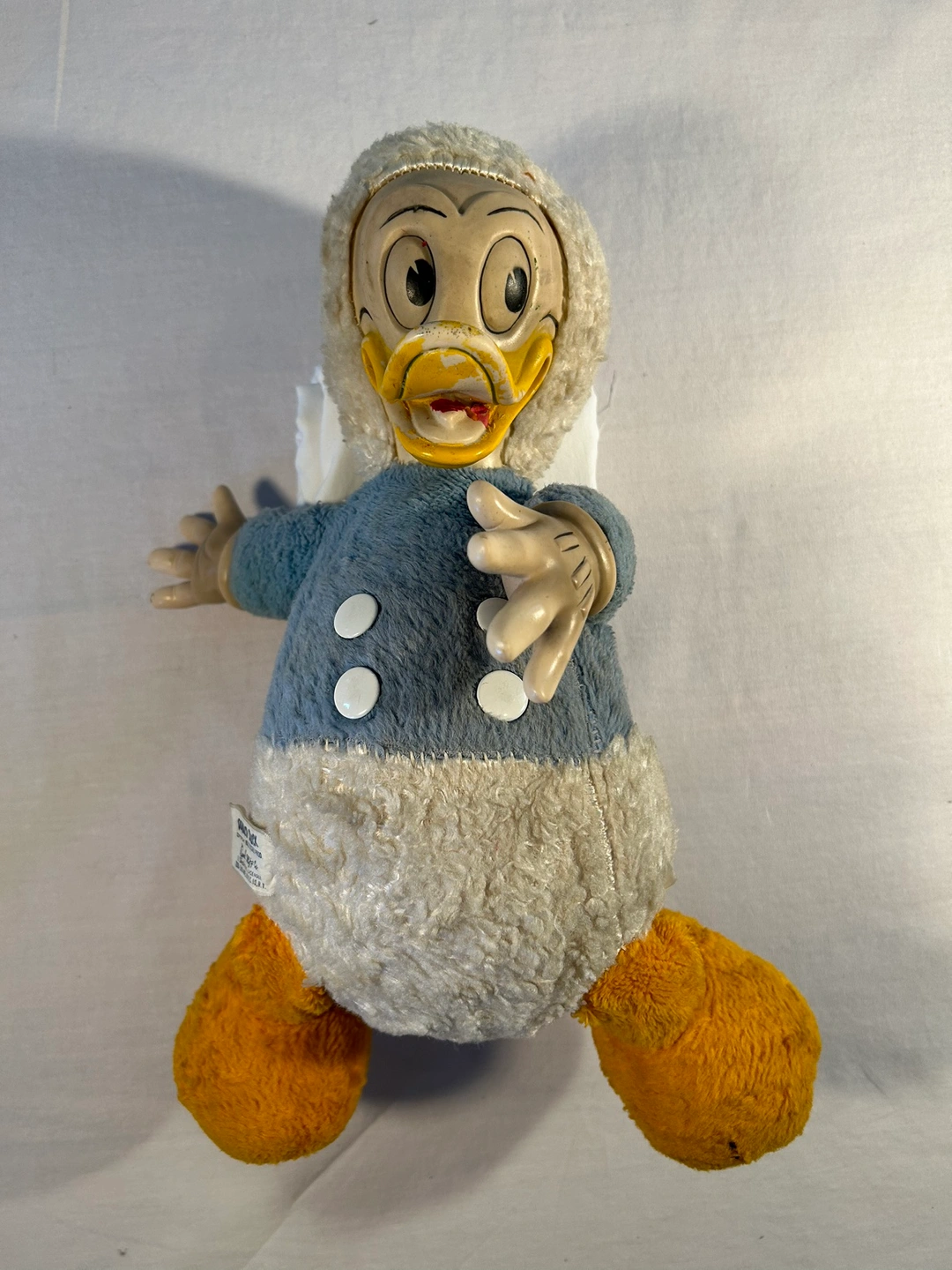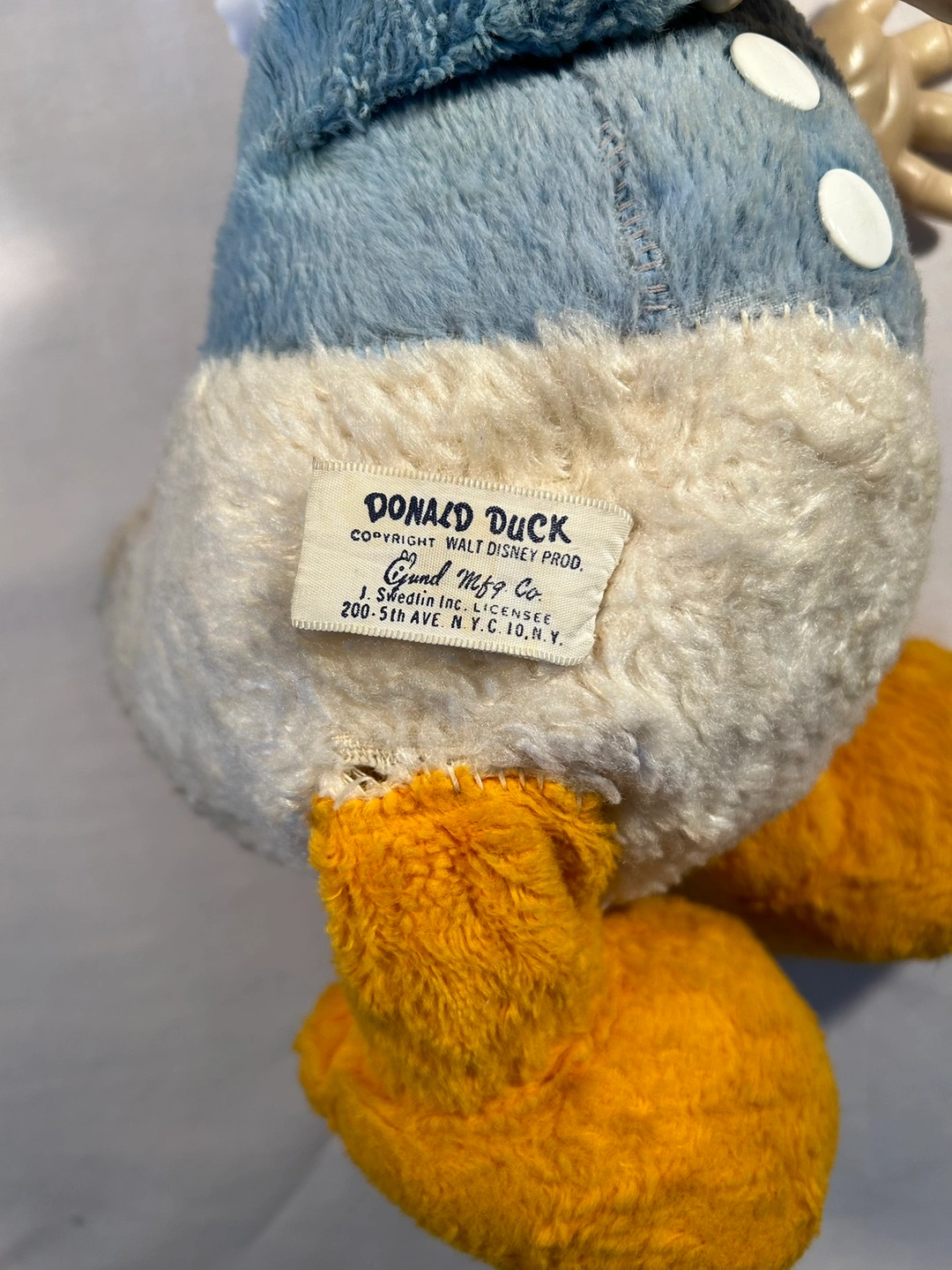Circa 1955. Collectible GUND antique plush, foam-stuffed Walt Disney Donald Duck character. Original licensed version with blue label. Donald lost his hat along the way. Similar on eBay at $85-$115. Antique collectors RARE ITEM.
