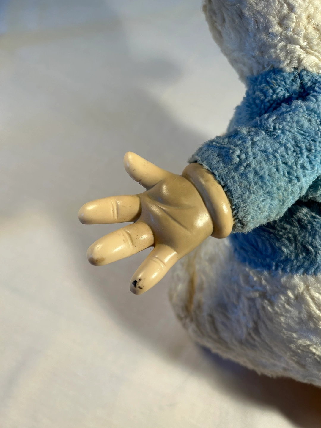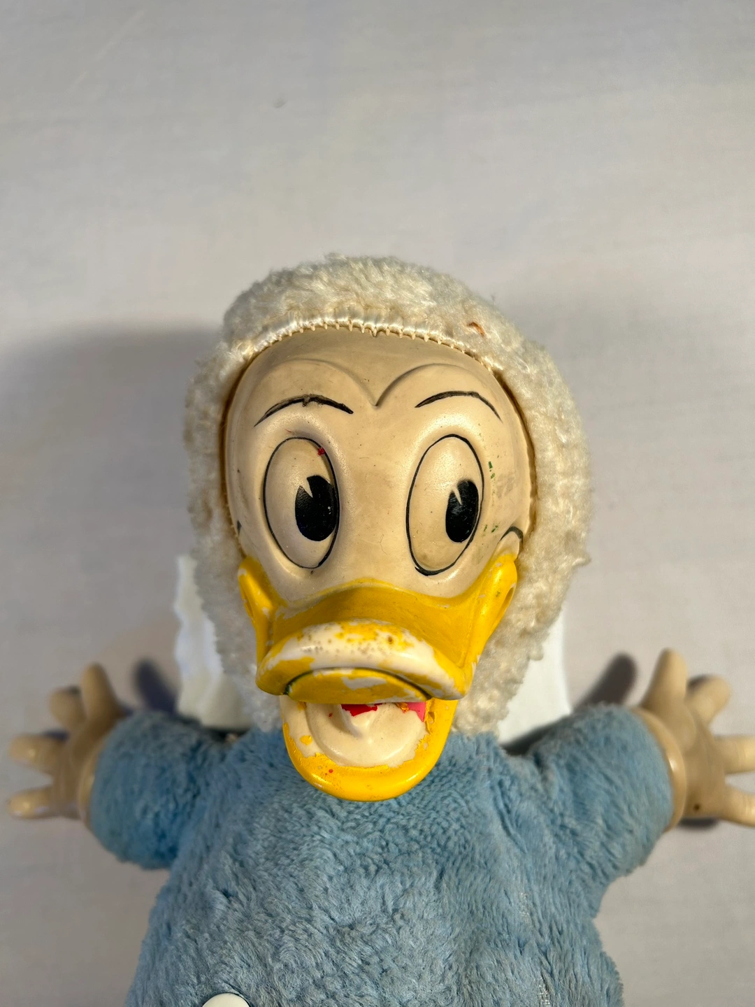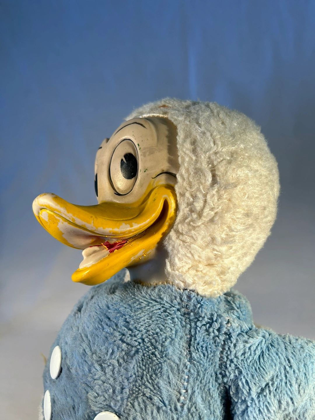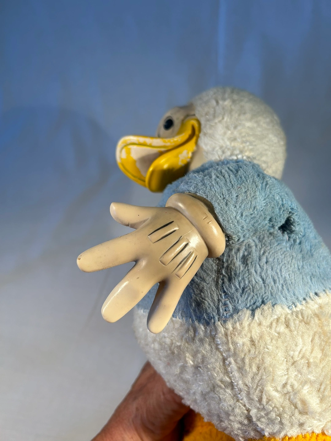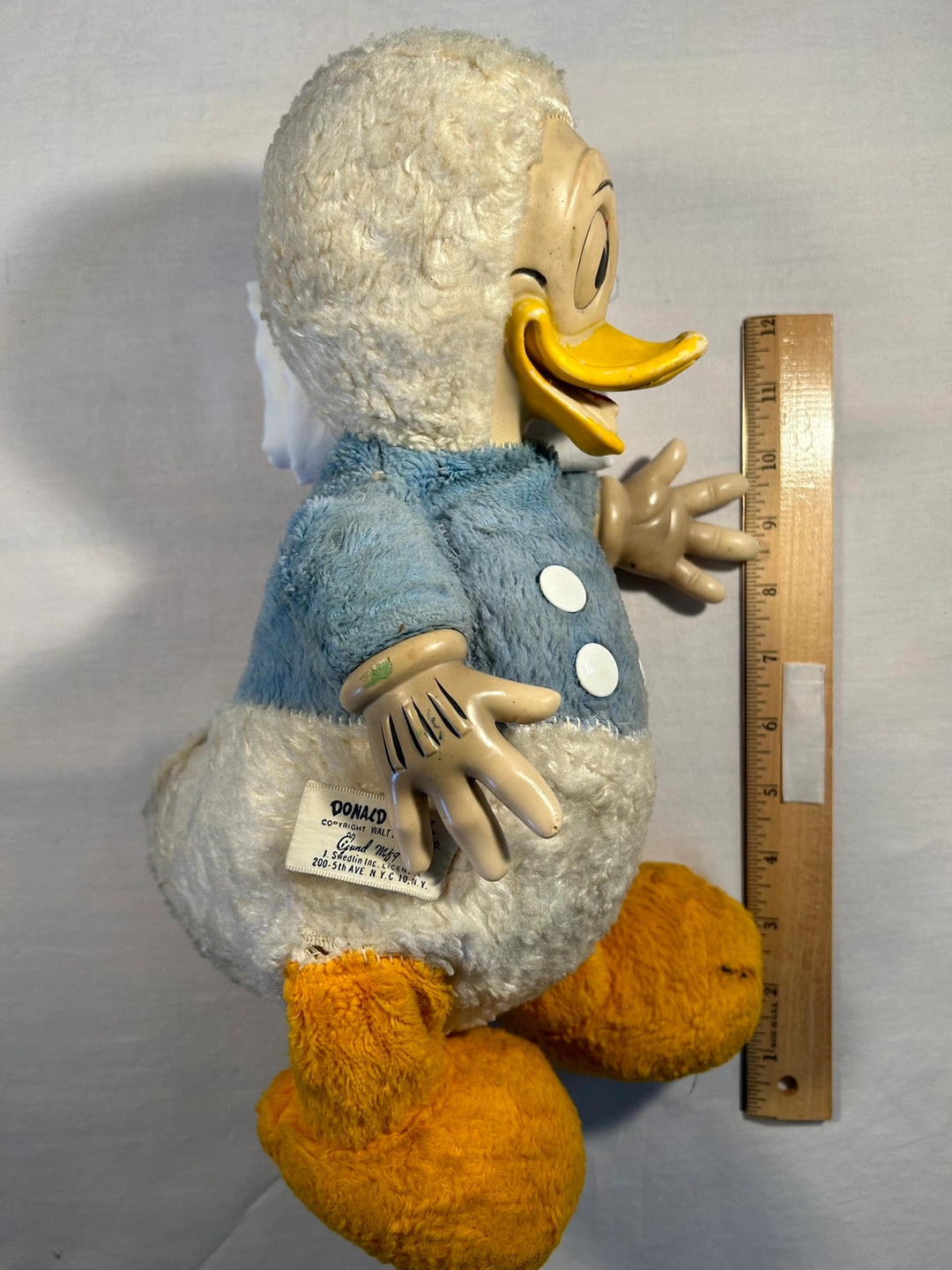 Circa 1955. Collectible GUND antique plush, foam-stuffed Walt Disney Donald Duck character. Original licensed version with blue label. Donald lost his hat along the way. Similar on eBay at $85-$115. Antique collectors RARE ITEM.