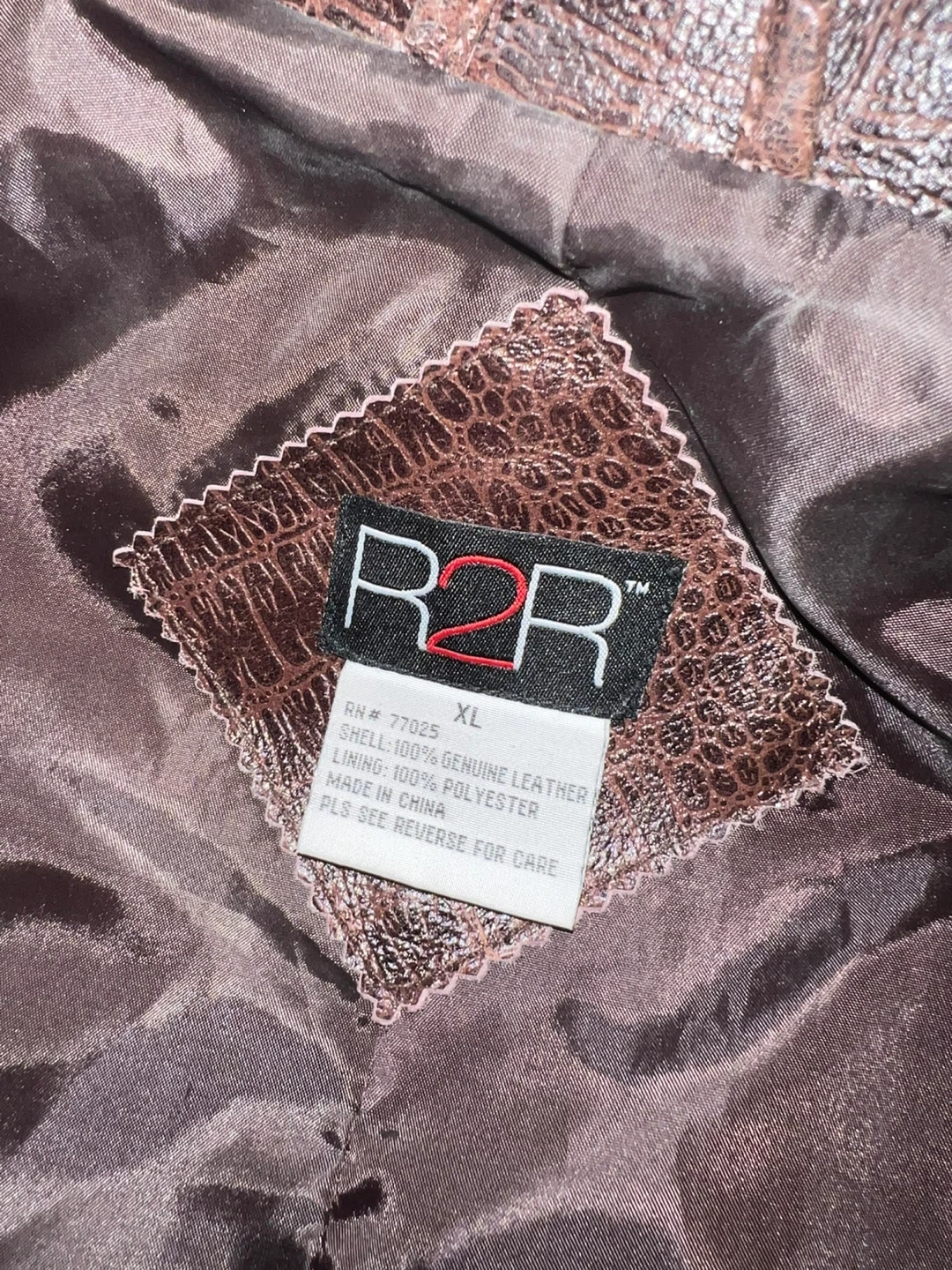 This R2R trench coat is made of 100% genuine leather with a crocodile embossed finish. It features a polyester lining and a double-breasted closure. Size XL.