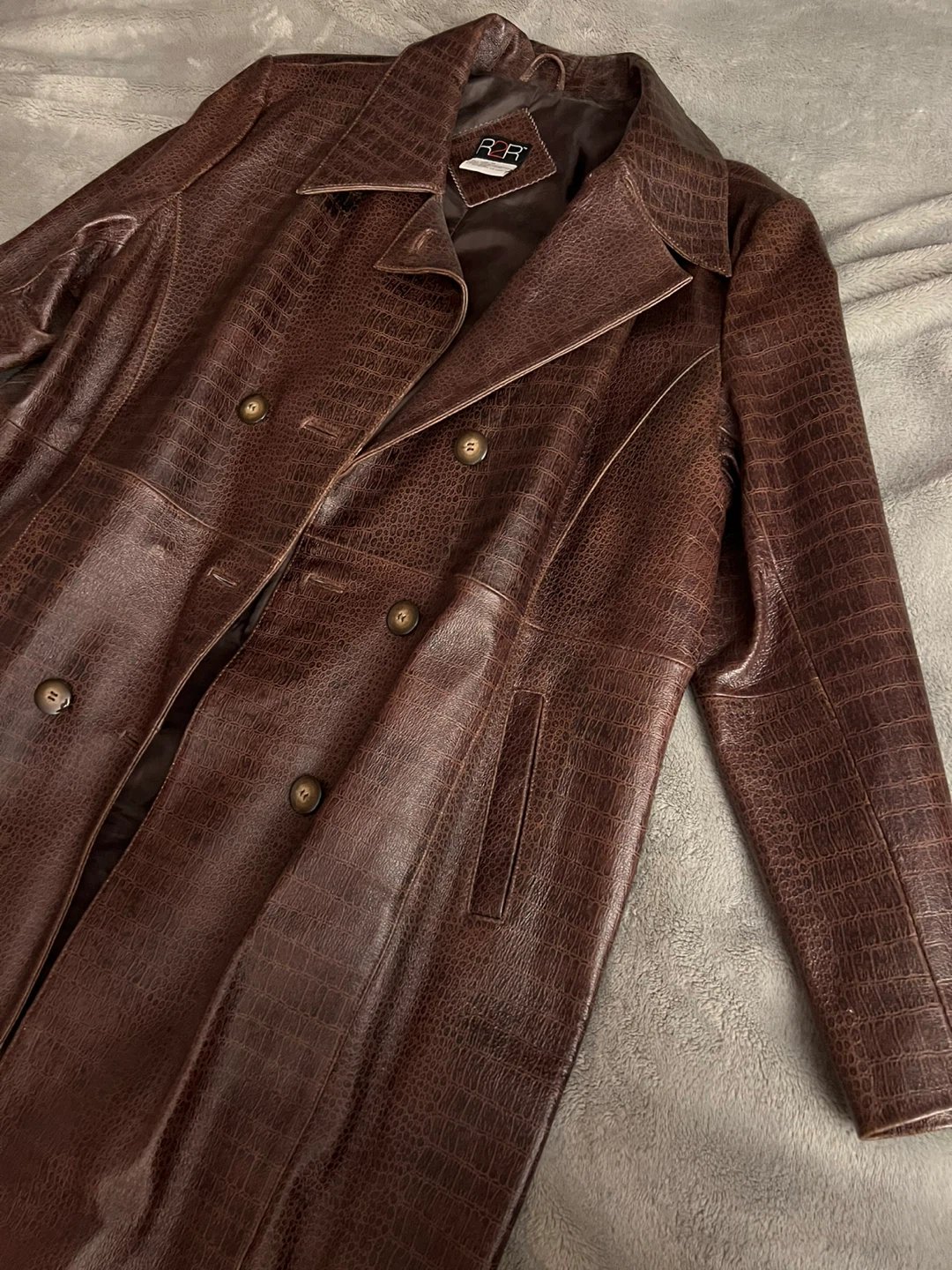 This R2R trench coat is made of 100% genuine leather with a crocodile embossed finish. It features a polyester lining and a double-breasted closure. Size XL.