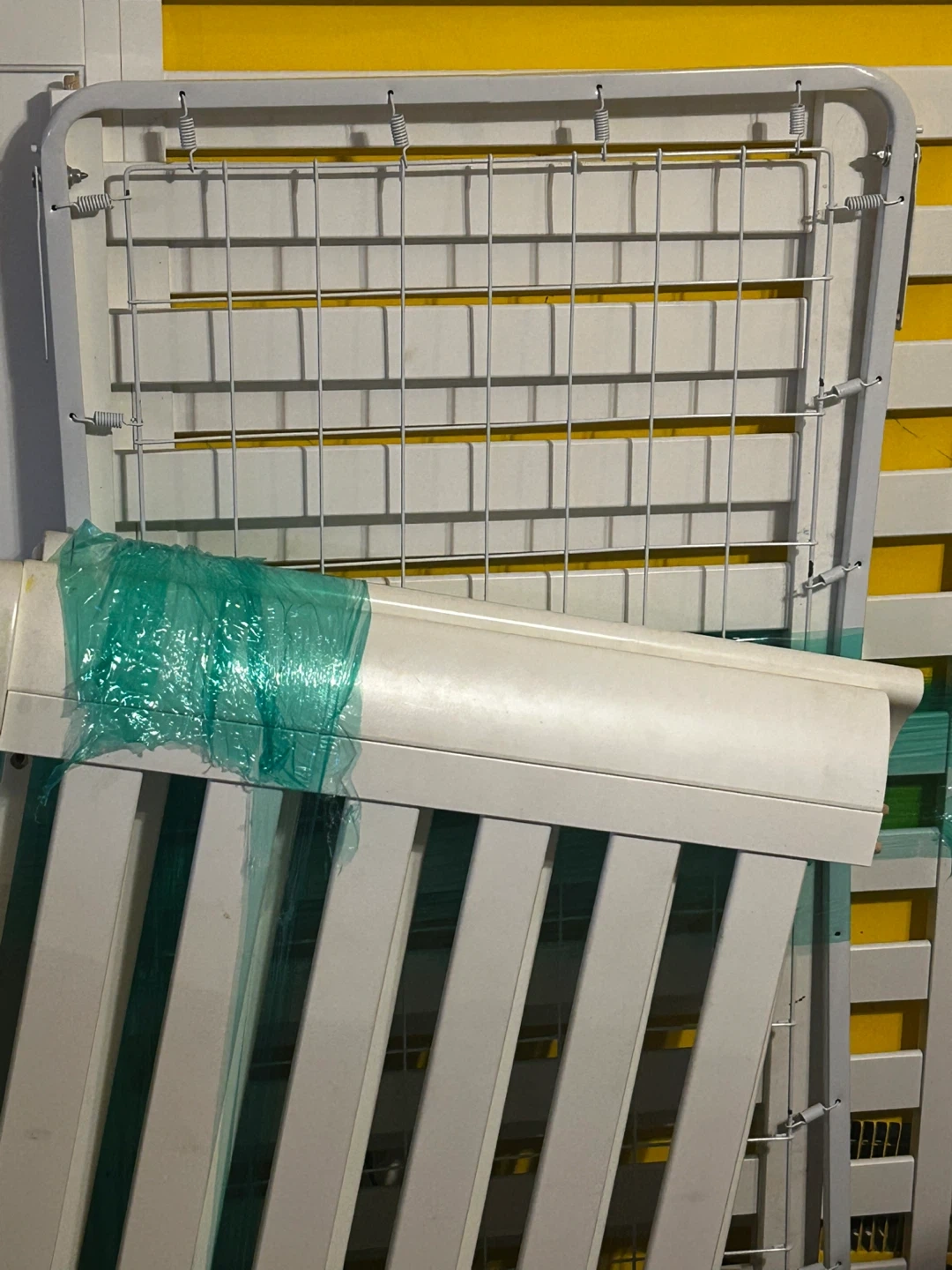 This is a white crib or toddler bed side rail. It's made of metal and plastic. It's covered in green plastic wrap for protection. Measures approximately 35 inches long.