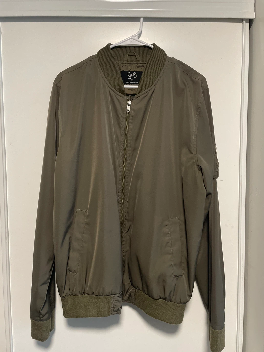 This is a super light Men’s Spring jacket in an olive green colour. It's made with a smooth material and features ribbed cuffs, collar, and hem. It has a zippered front closure and two front pockets. Perfect for spring months!!