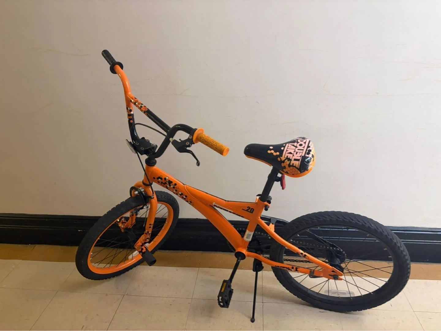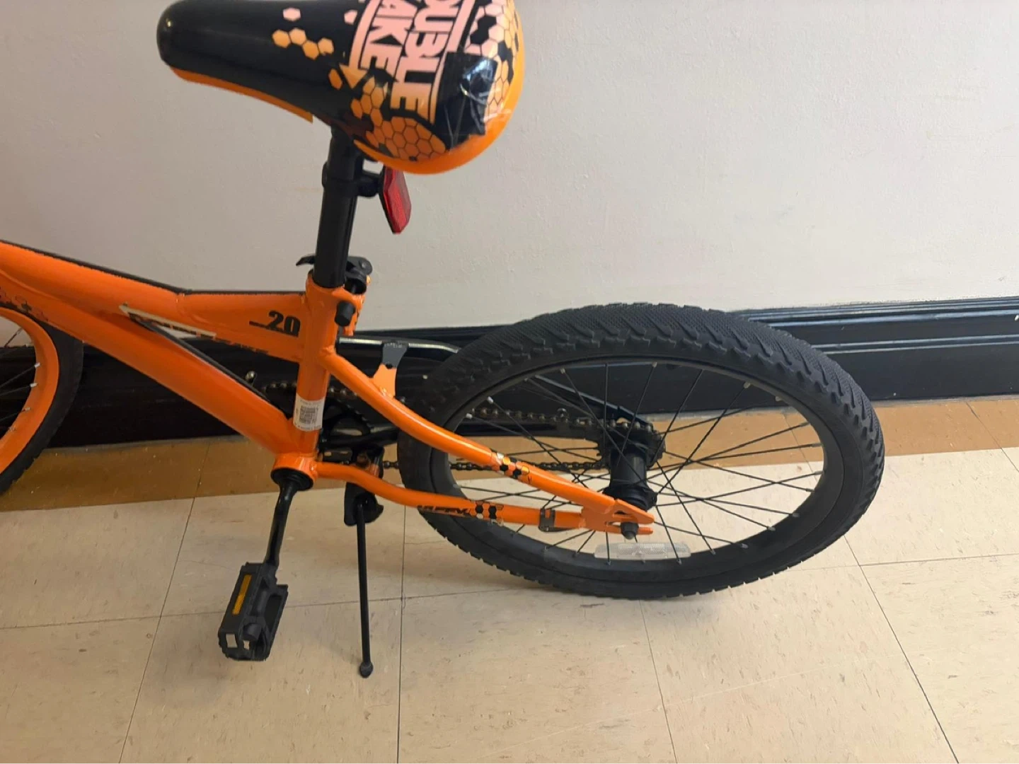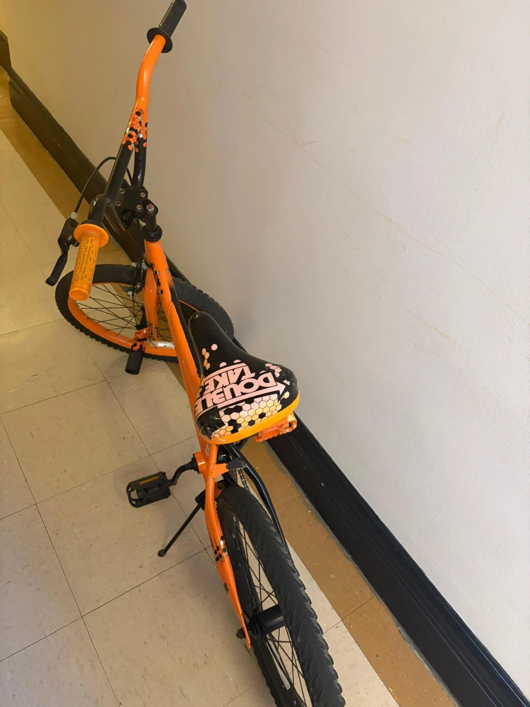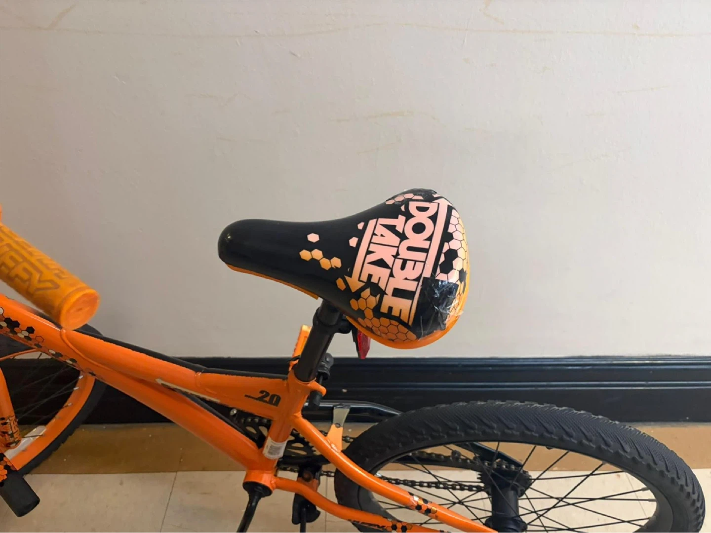 Design: A BMX-style frame with a distinctive orange and black color scheme and patterned seat.