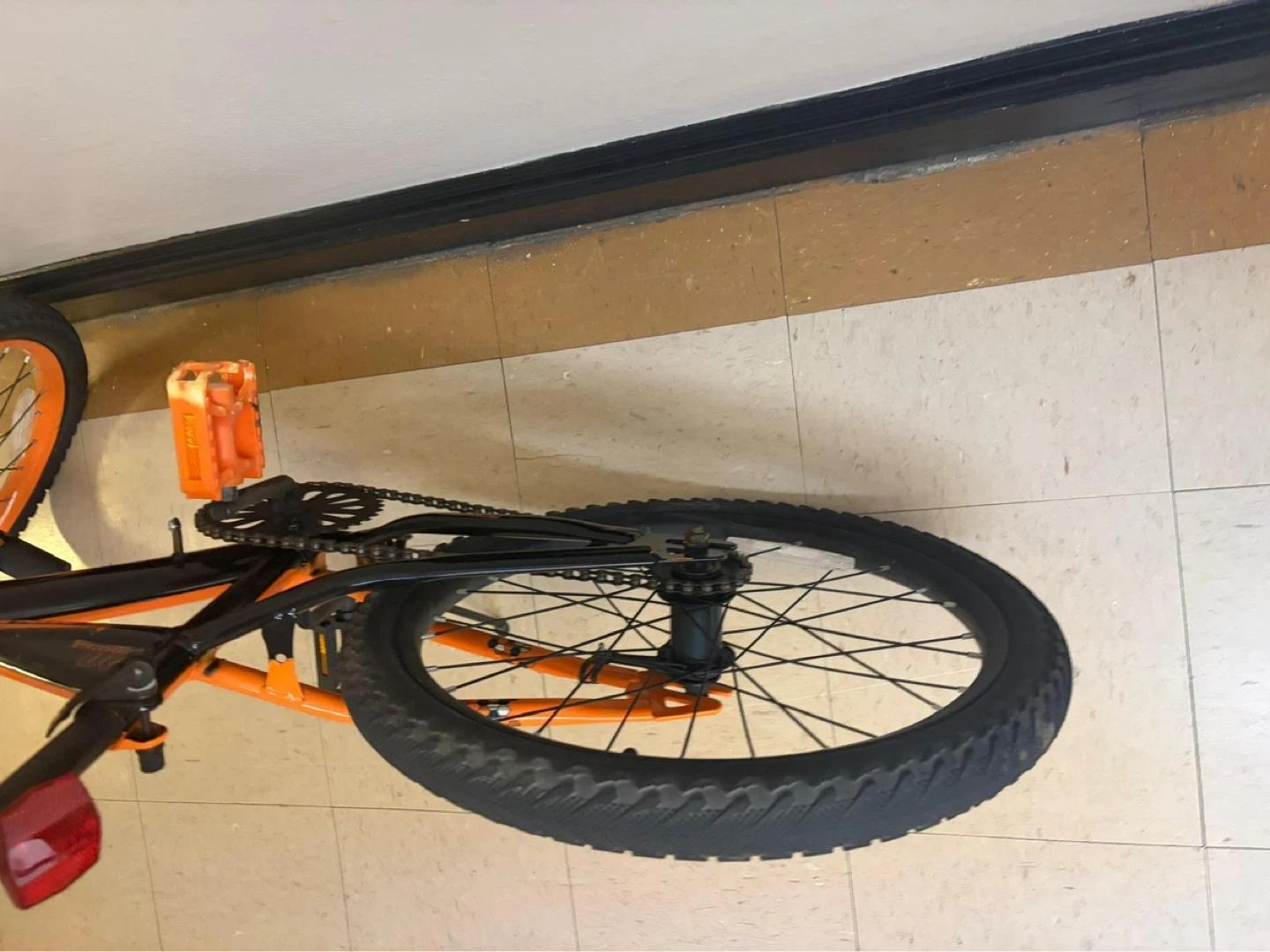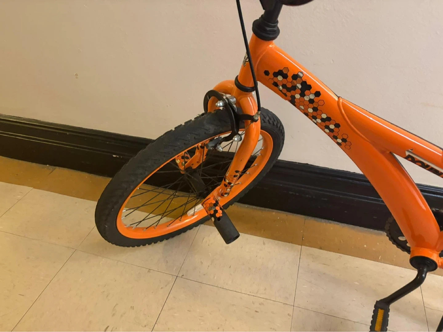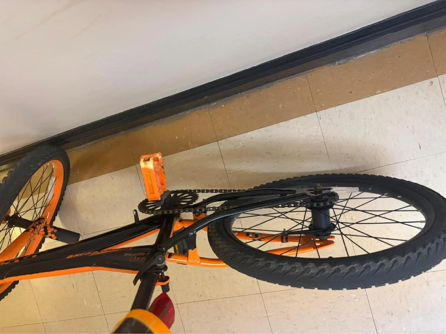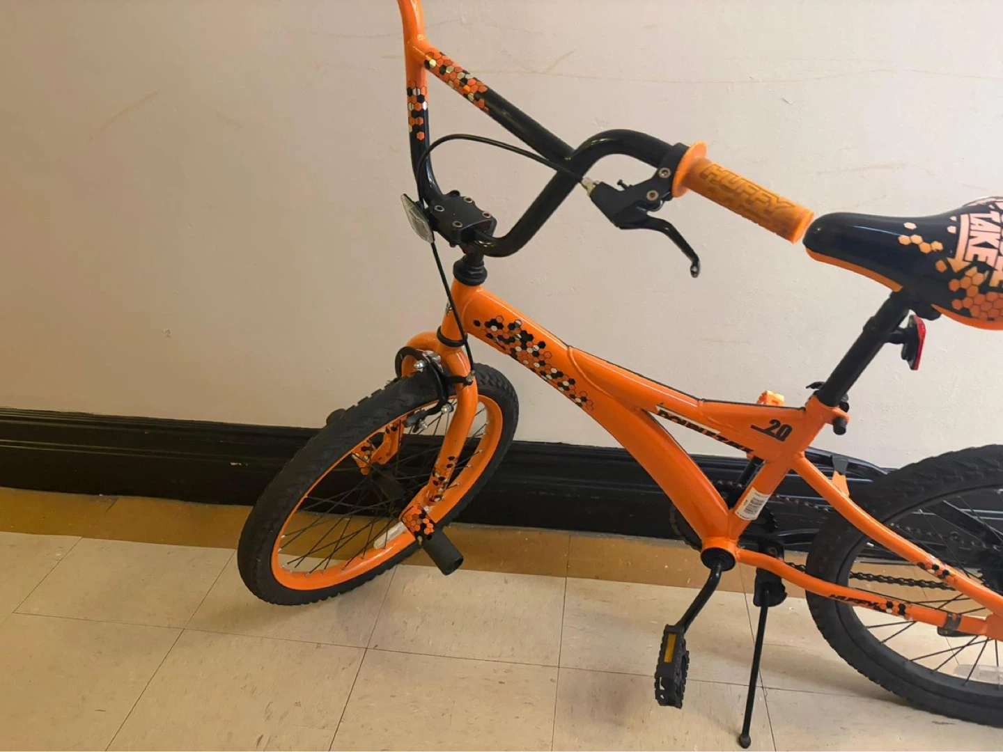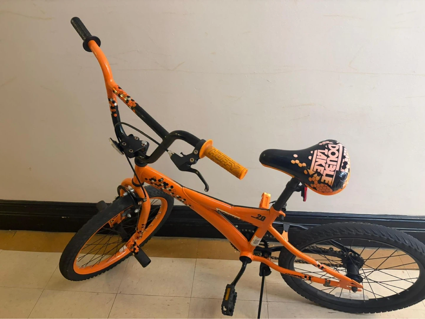 Design: A BMX-style frame with a distinctive orange and black color scheme and patterned seat.