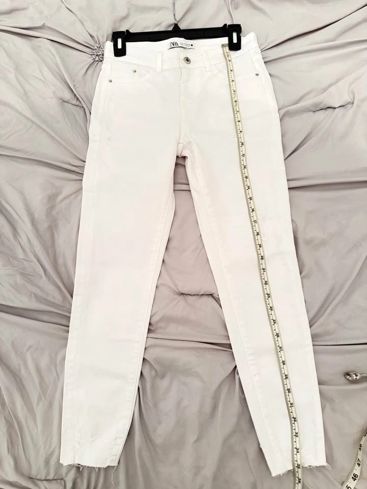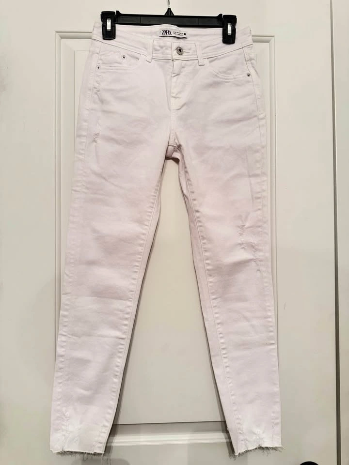 Crisp white Zara jeans in like-new condition (5/5). High-rise fit with a flattering skinny leg and raw/frayed hem + subtle distressed details. Classic 5-pocket style—perfect for spring/summer outfits.