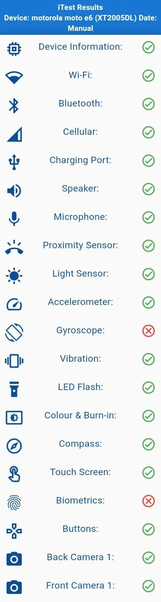 Motorola Moto E6 - This phone is in okay cosmetic condition with a couple of scratches on the back, a couple of marks on the left side and on the top, major marks on the right side, as well as noticable scratches on the screen. All functions do work, including the gyroscope. This phone doesn't have a Google lock, but is carrier locked to TracFone, meaning that this phone won't receive cell service, unless you insert an active TracFone SIM card, in which the phone will receive cell service. Other than that, this phone is reset and is ready to go. IMEI is shown in the 9th photo.