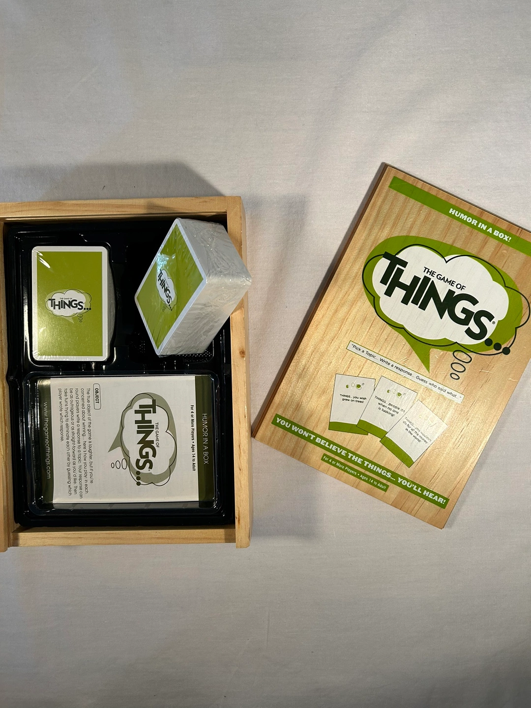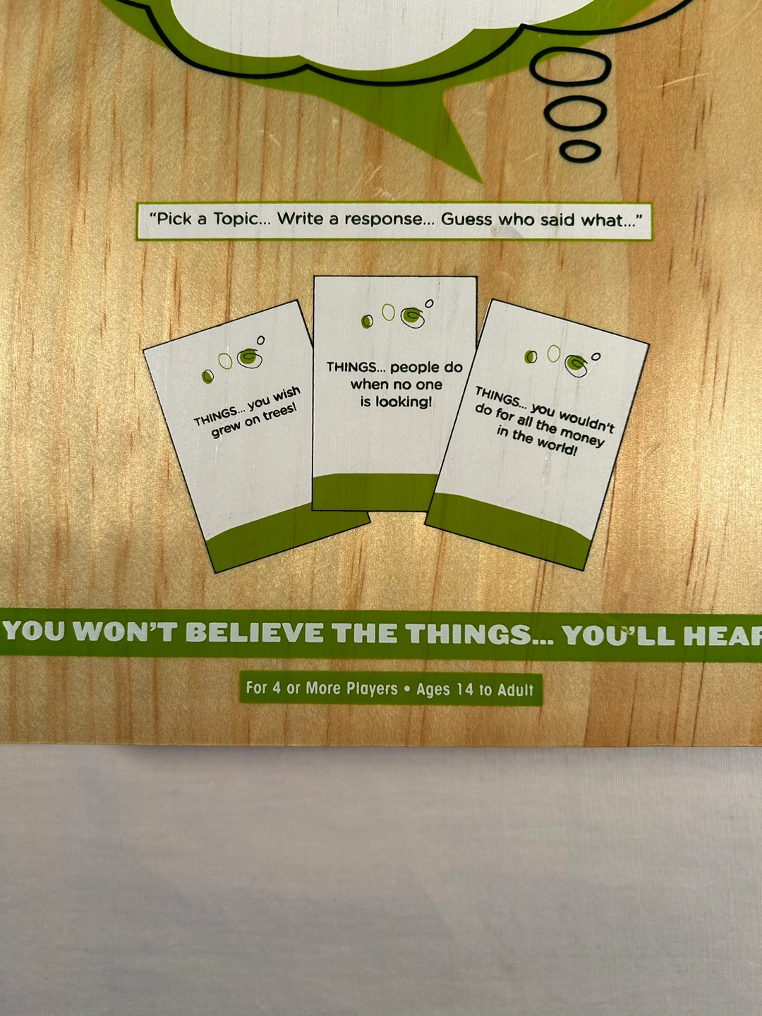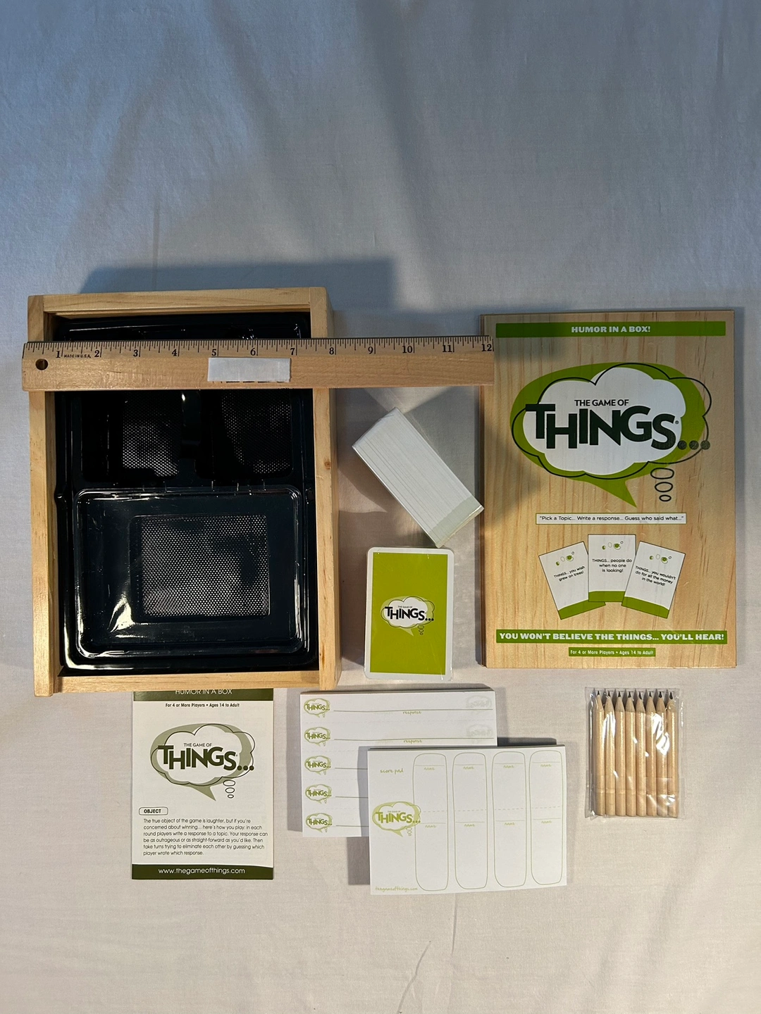 Fun game for 4 or more over 14yrs old. (We’ve played with 3 incl a 10yr old and had a blast. Family reunions, BBQs, fire pit circle, company picnic, or any gathering. Really great ice breaker / conversation starter, lotsa’ laughs. Brand new, unopened. Wood box 10 1/2”X 7 3/4” X 2 1/4. New on Amazon is $47.50!