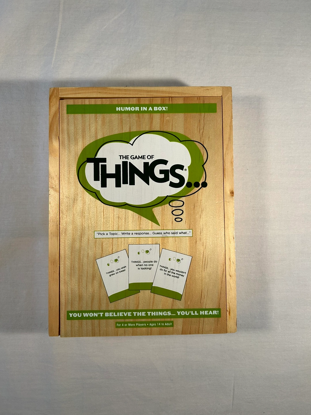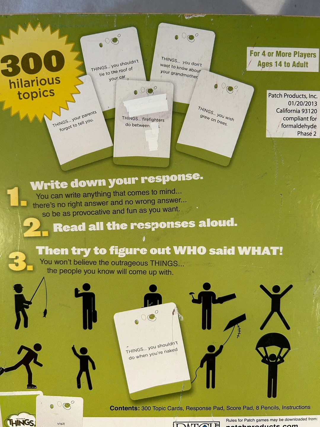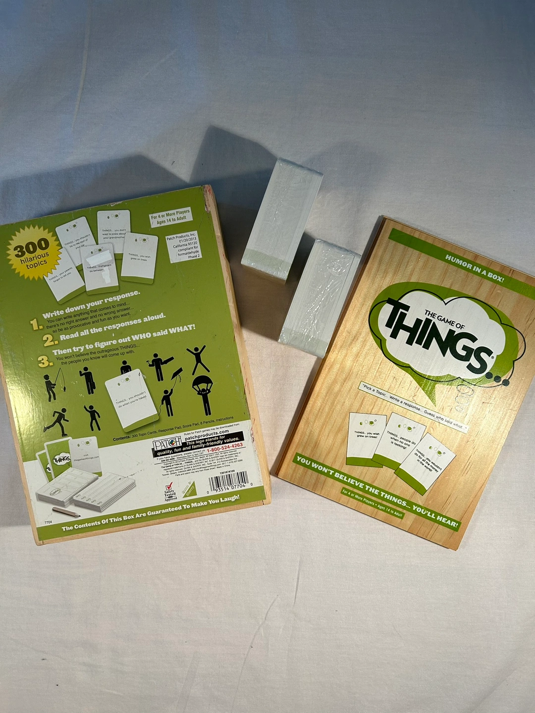 Fun game for 4 or more over 14yrs old. (We’ve played with 3 incl a 10yr old and had a blast. Family reunions, BBQs, fire pit circle, company picnic, or any gathering. Really great ice breaker / conversation starter, lotsa’ laughs. Brand new, unopened. Wood box 10 1/2”X 7 3/4” X 2 1/4. New on Amazon is $47.50!
