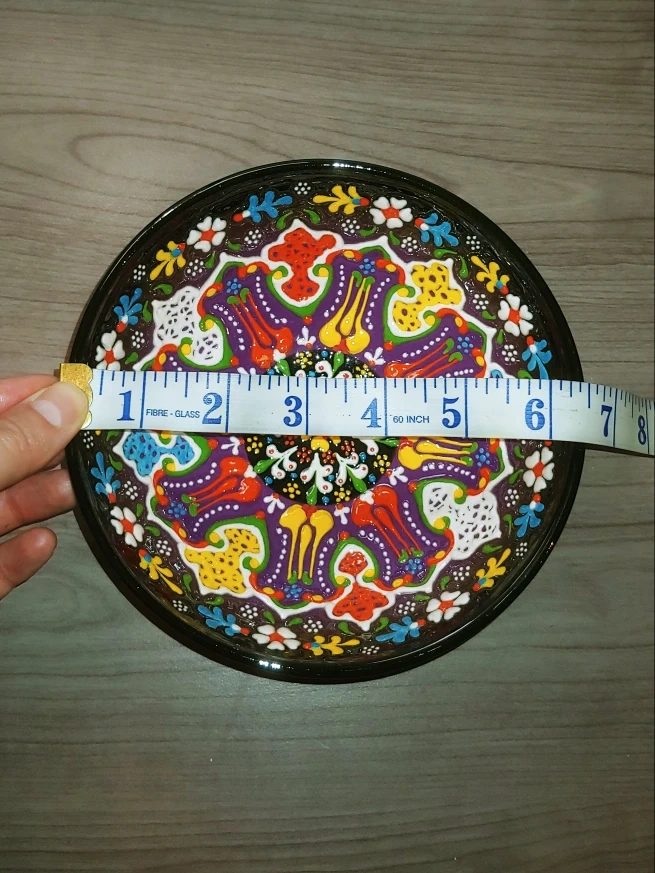 This is a hand painted ceramic bowl with a colorful floral design. It measures approximately 6.5 inches in diameter. It is in good condition.