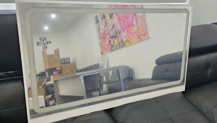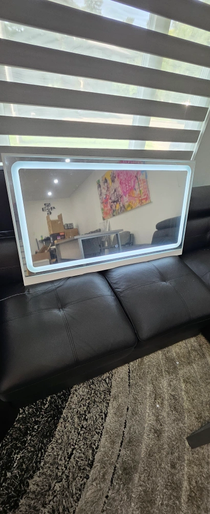 A large wall mirror in a white frame. The mirror is rectangular with a silver backing.