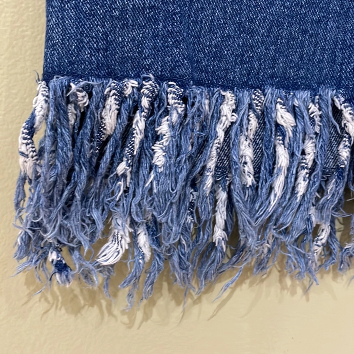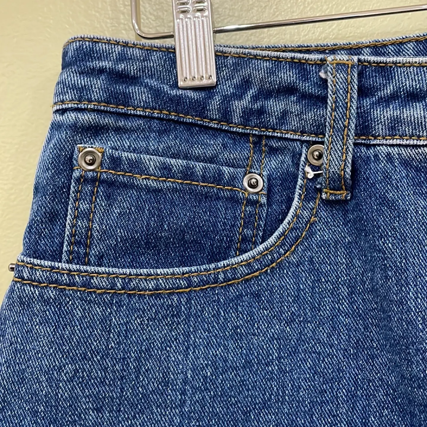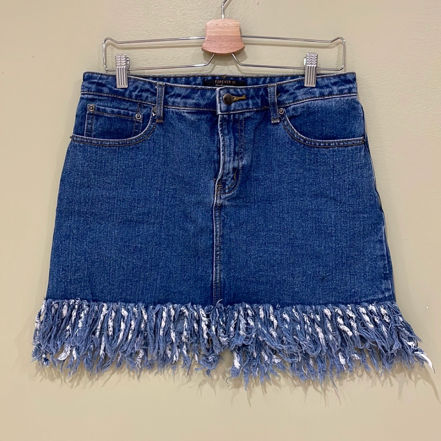 FOREVER 21 blue denim mini skirt with bottoms frills, 5 pockets, zipper/button front, in great condition-has slight dark spot that was there when purchased (bottom right)! 19” in length