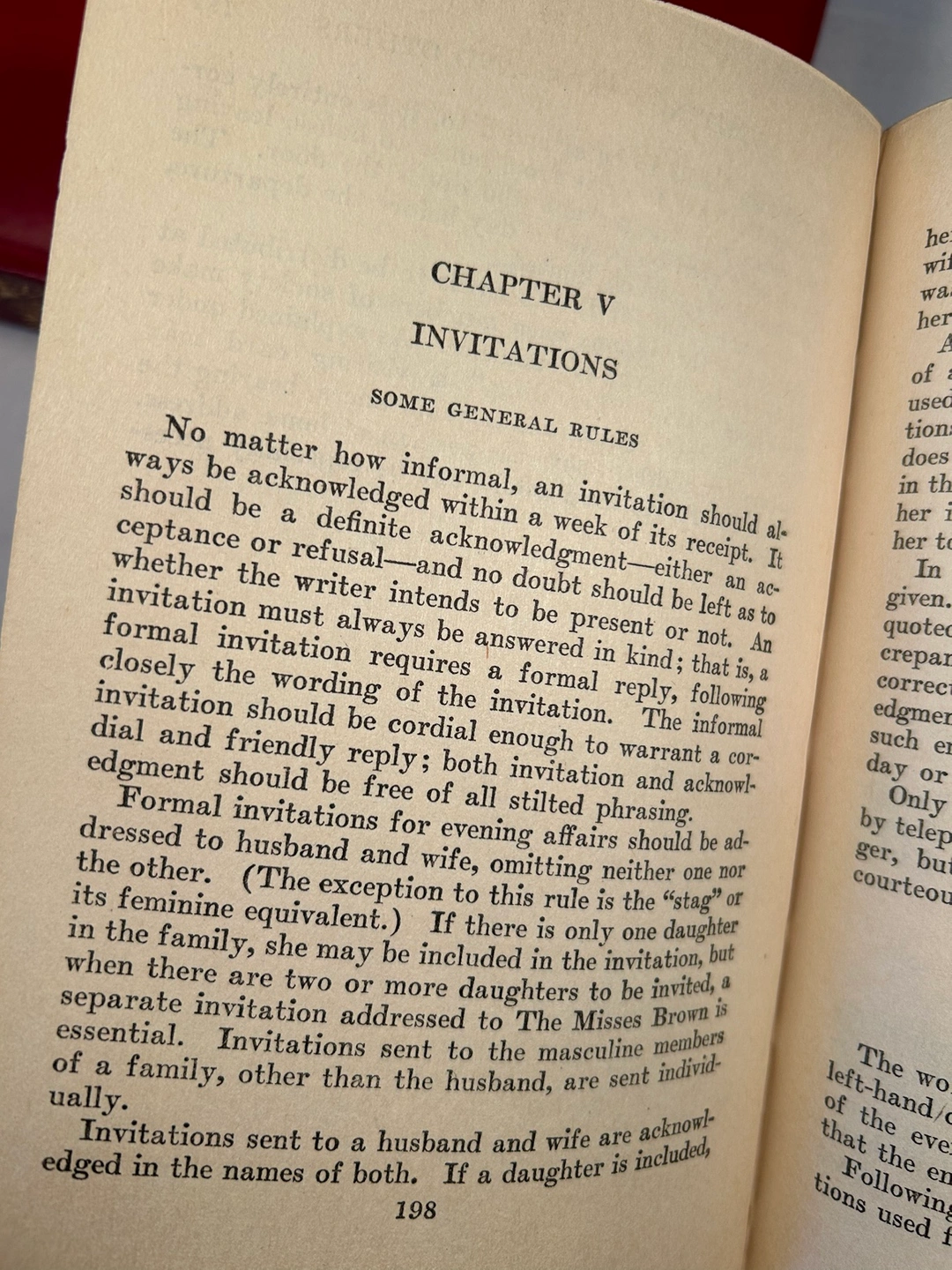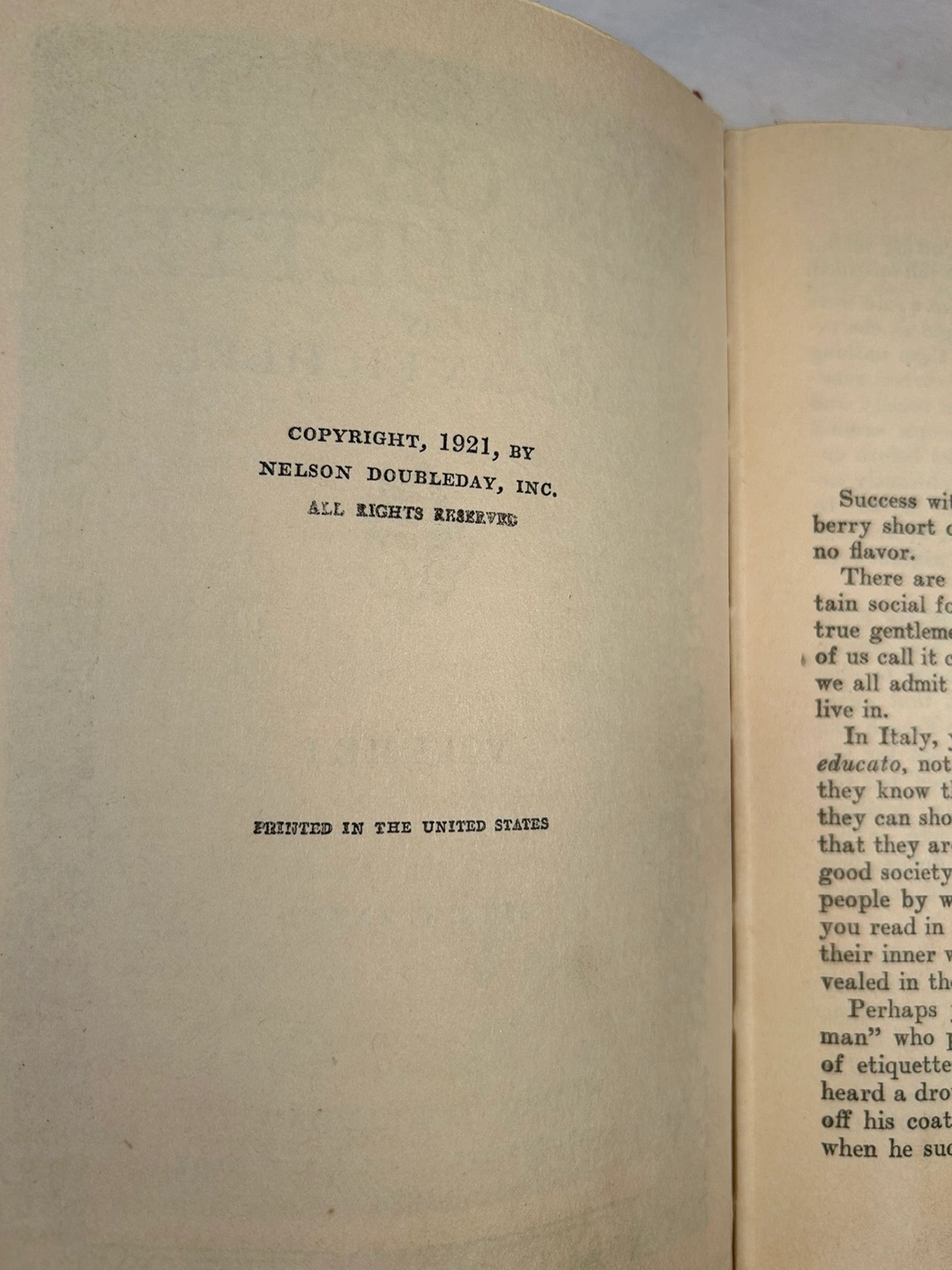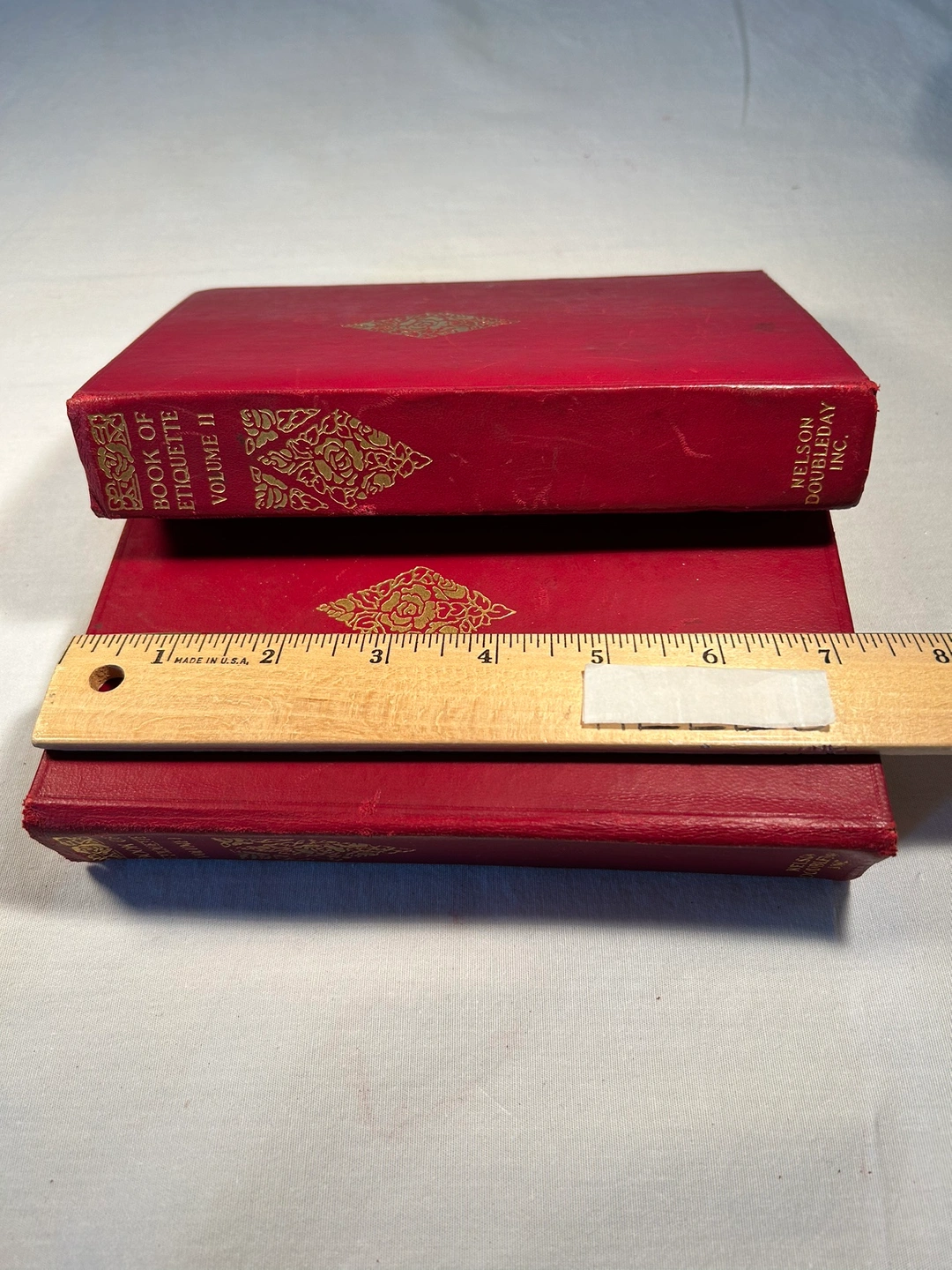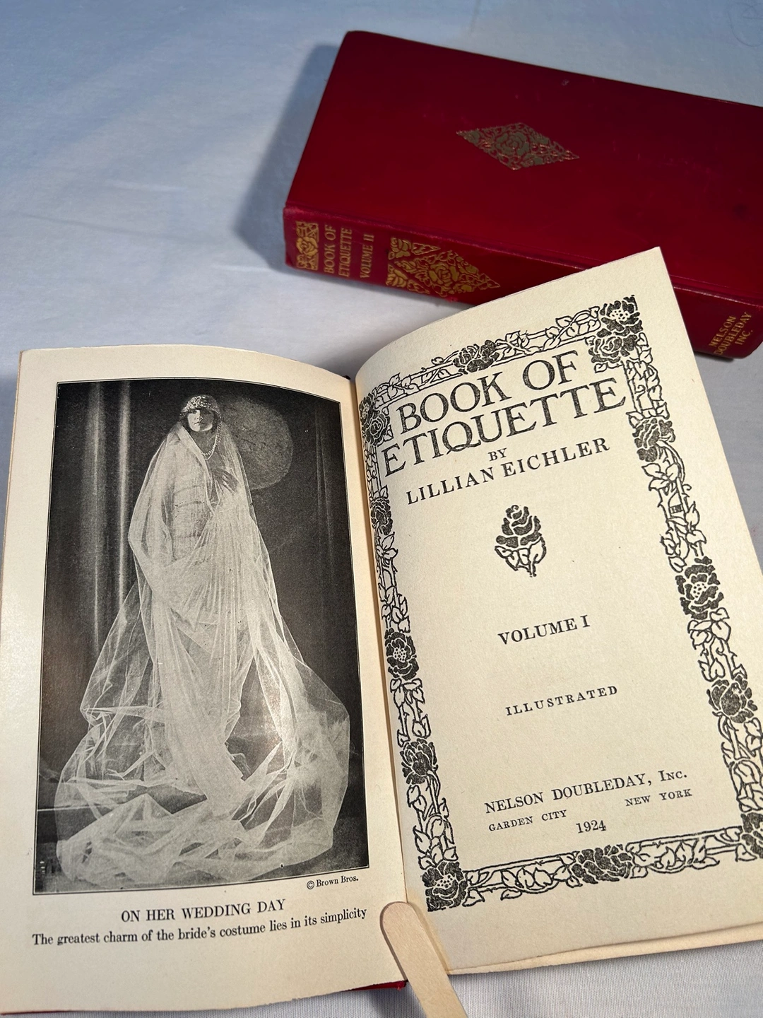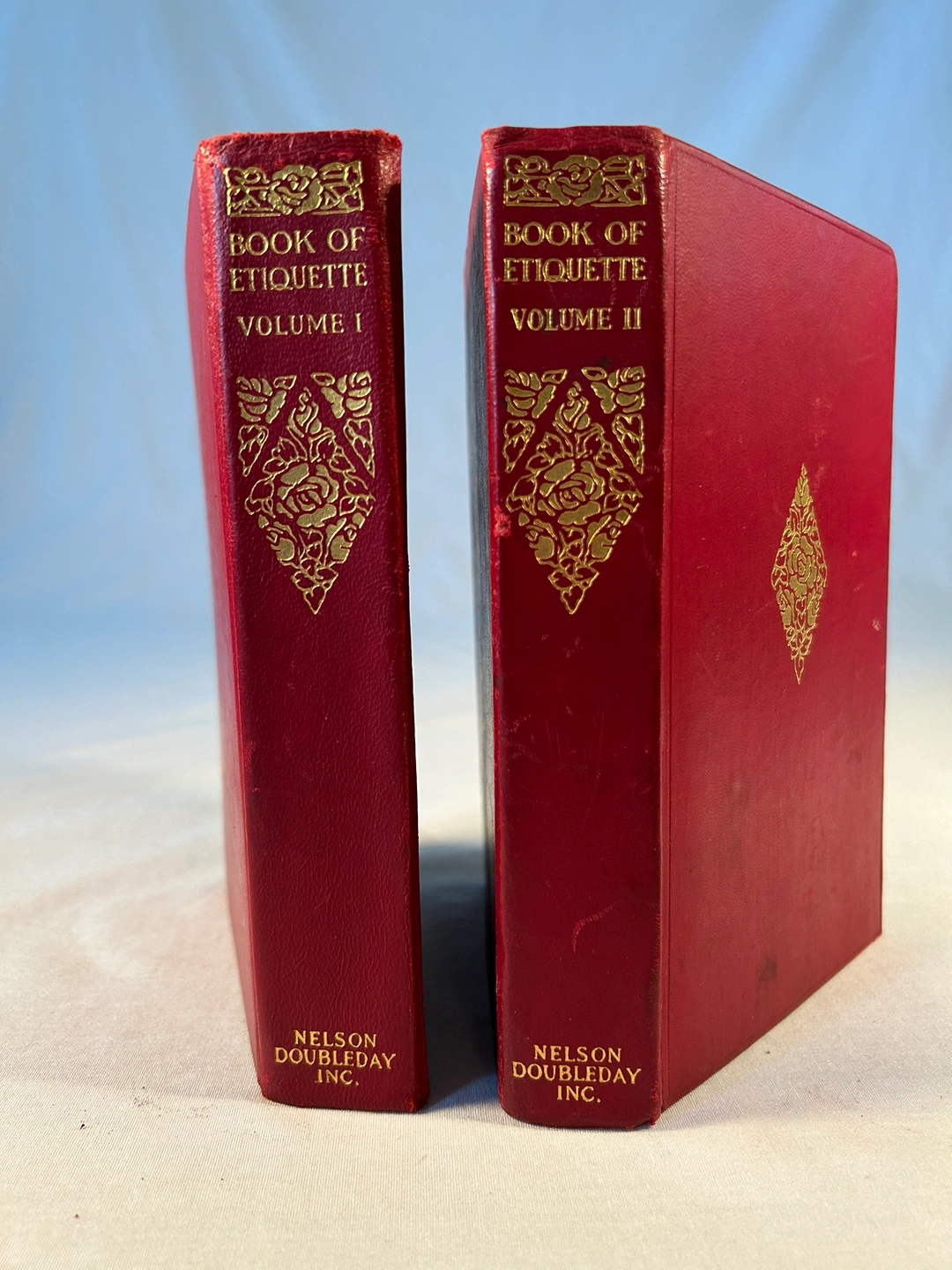 Beautifully illustrated books, two volumes, bound in deep, dark red color with gold detailed embellishment & gold leaf gilt edging. Guide to good manners for all aspects of life in the roaring 20s. Interesting commentary on 20s version of feminism. NEAR FINE. 1921 version printed in 1924 in US by Doubleday, NY. Collectors take note‼️