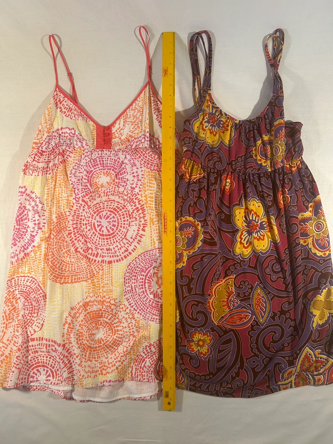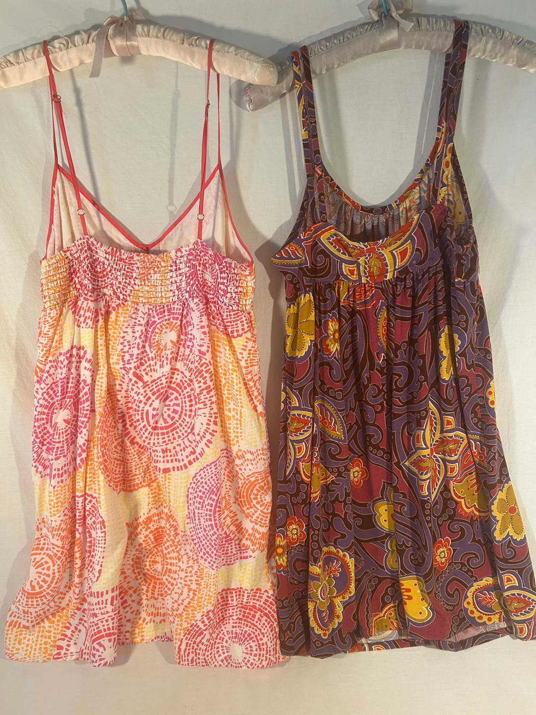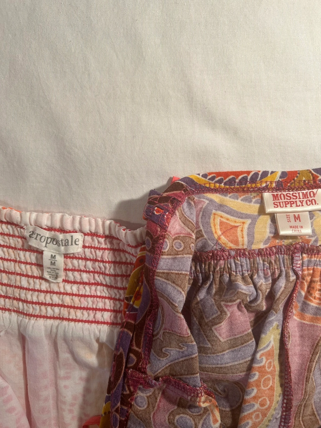 aeropostale - 100% light woven cotton, tie dye-esque design in pinks, oranges, yellow; lined in white cotton; soft elastic scrunched across back. Mossimo - high elastic waist, double spaghetti straps, paisley design in purples, golds, red; good condition. Both wash cold, dry low, remove promptly, hang.
