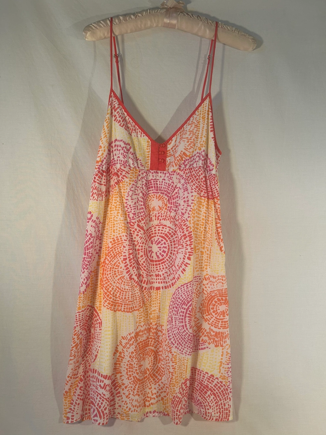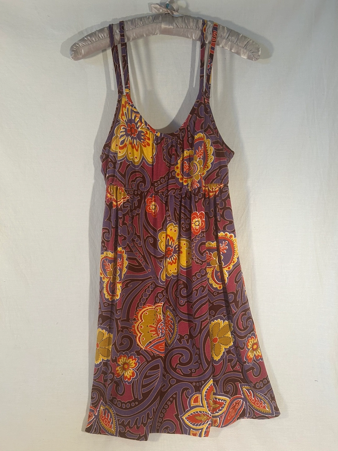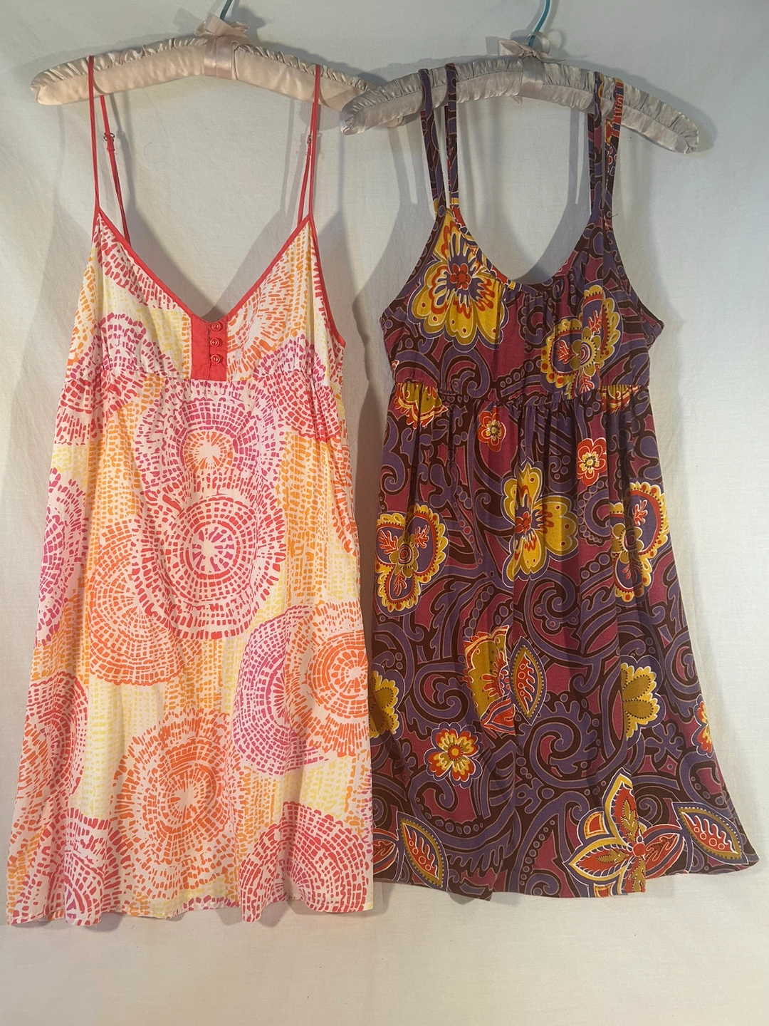 aeropostale - 100% light woven cotton, tie dye-esque design in pinks, oranges, yellow; lined in white cotton; soft elastic scrunched across back. Mossimo - high elastic waist, double spaghetti straps, paisley design in purples, golds, red; good condition. Both wash cold, dry low, remove promptly, hang.