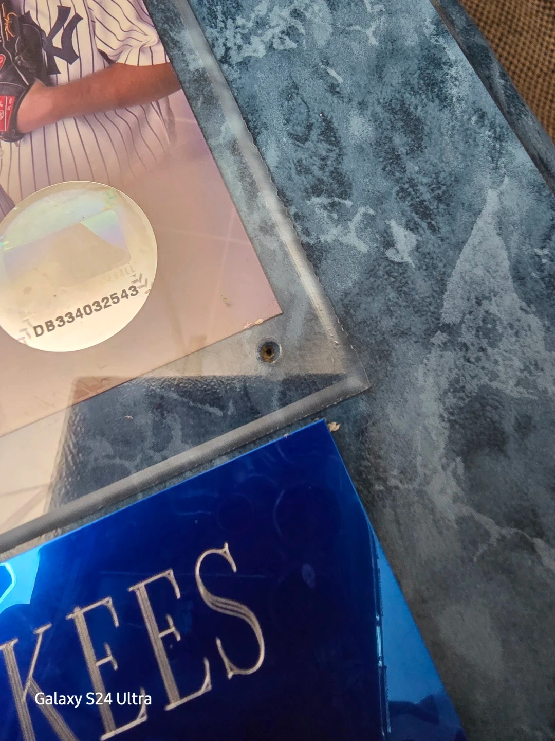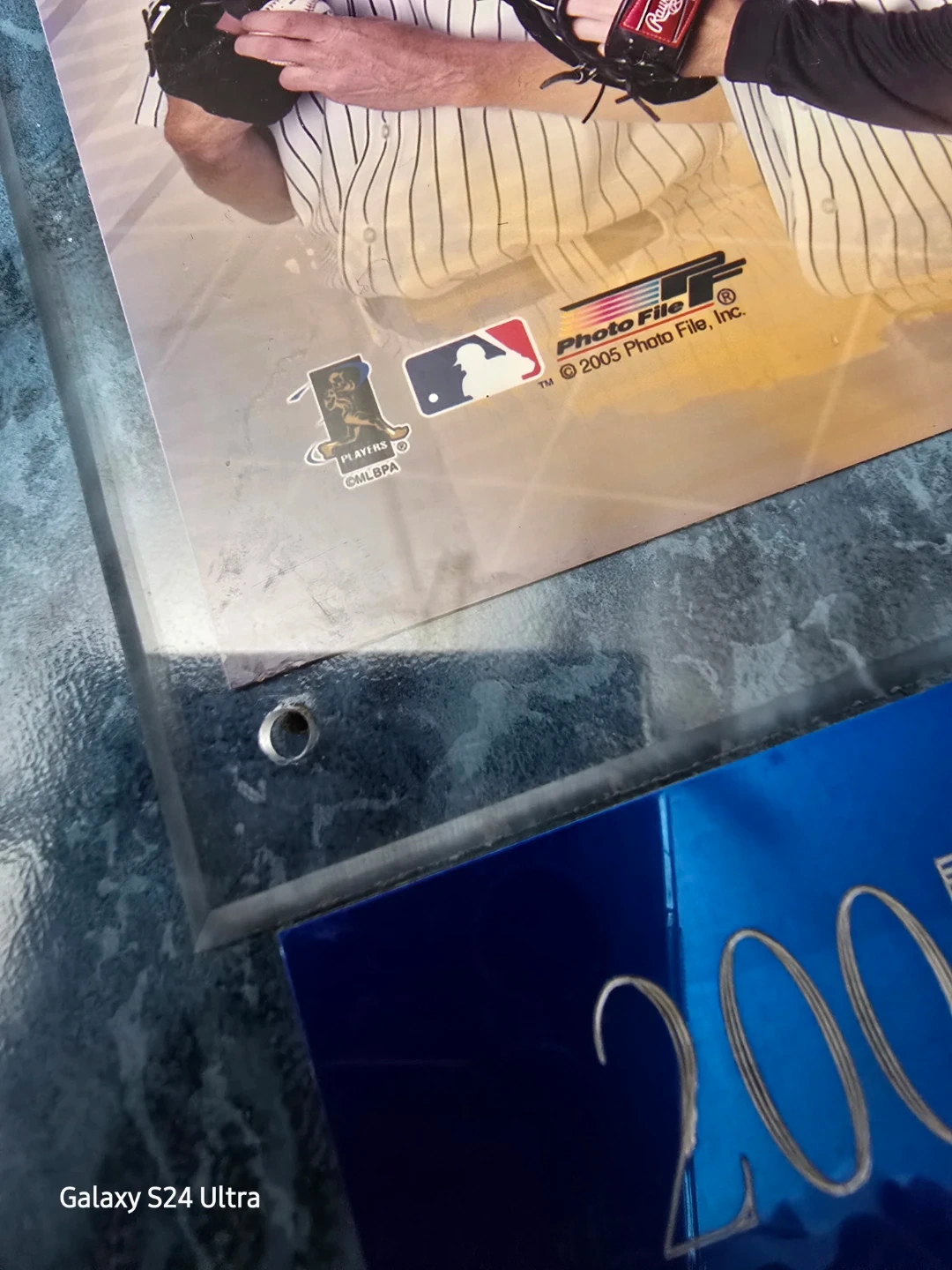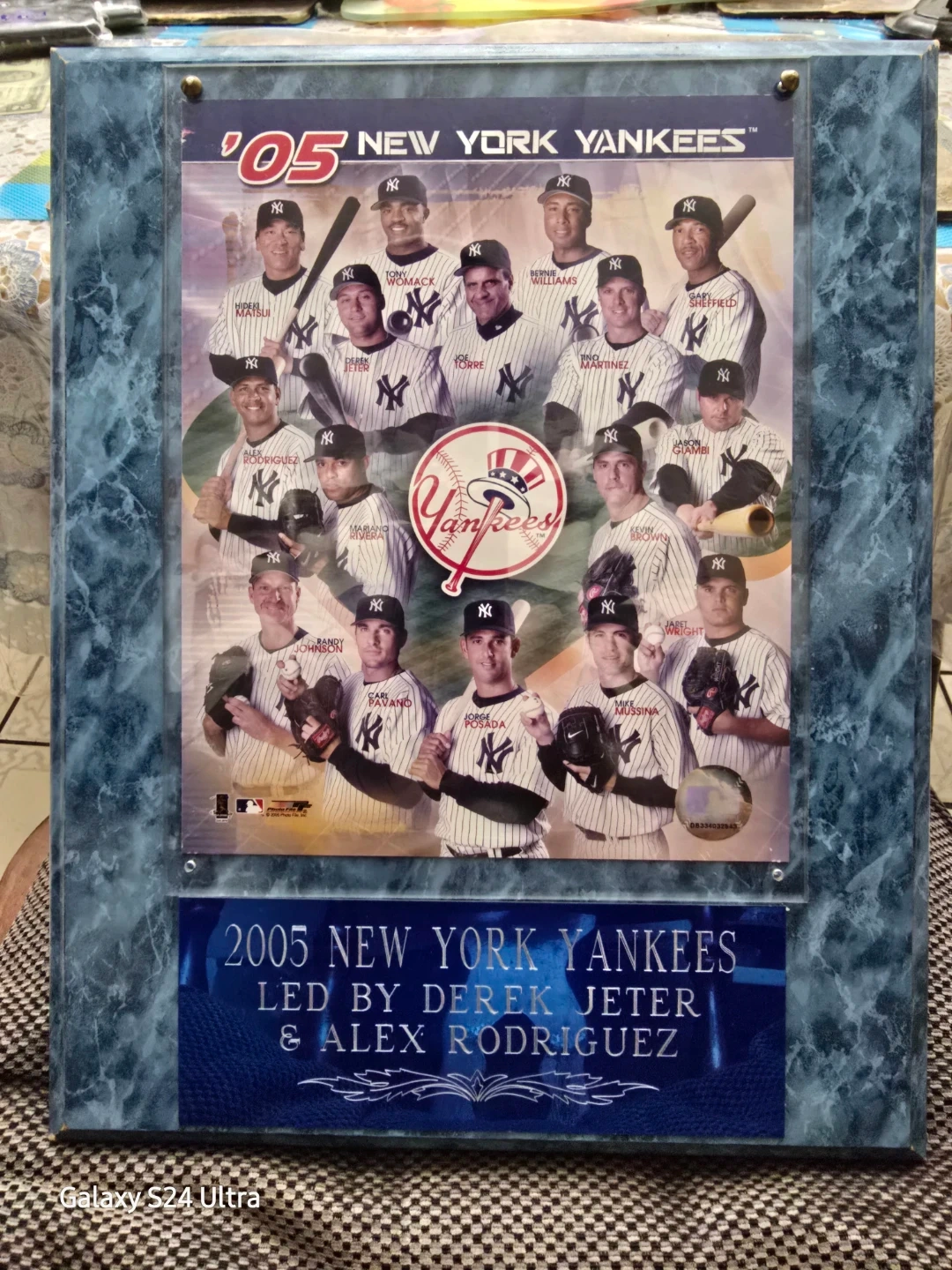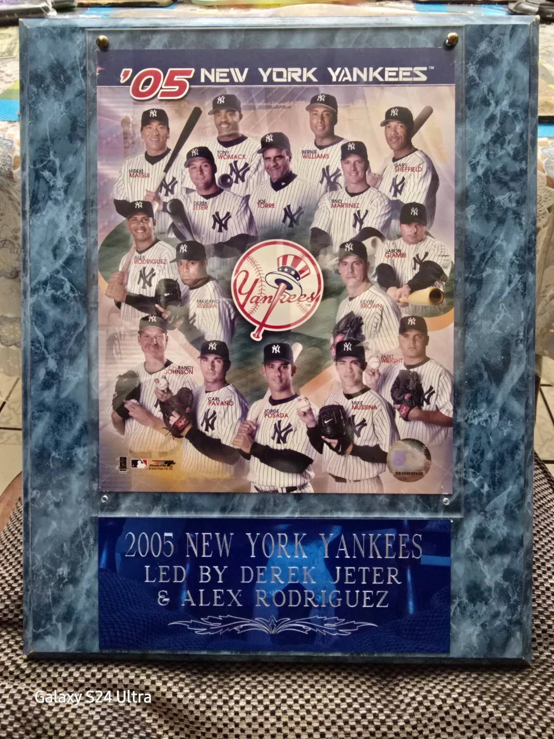 2005 New York Yankees team plaque, featuring a collage of players in a blue faux-marble frame.