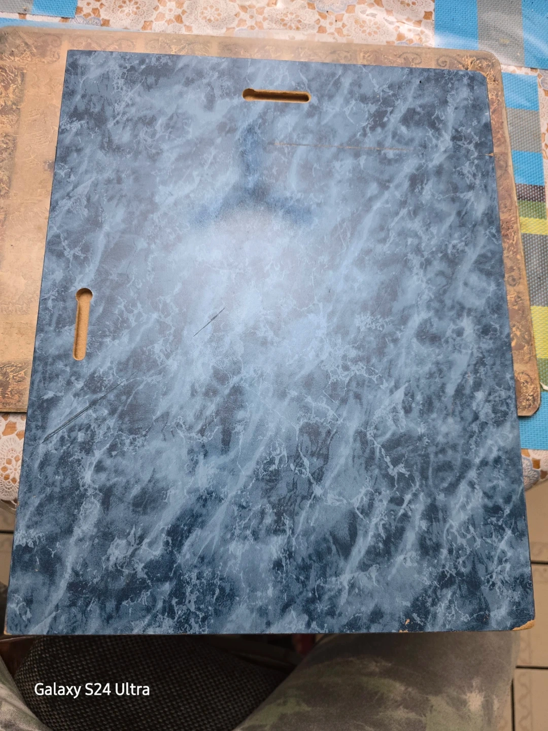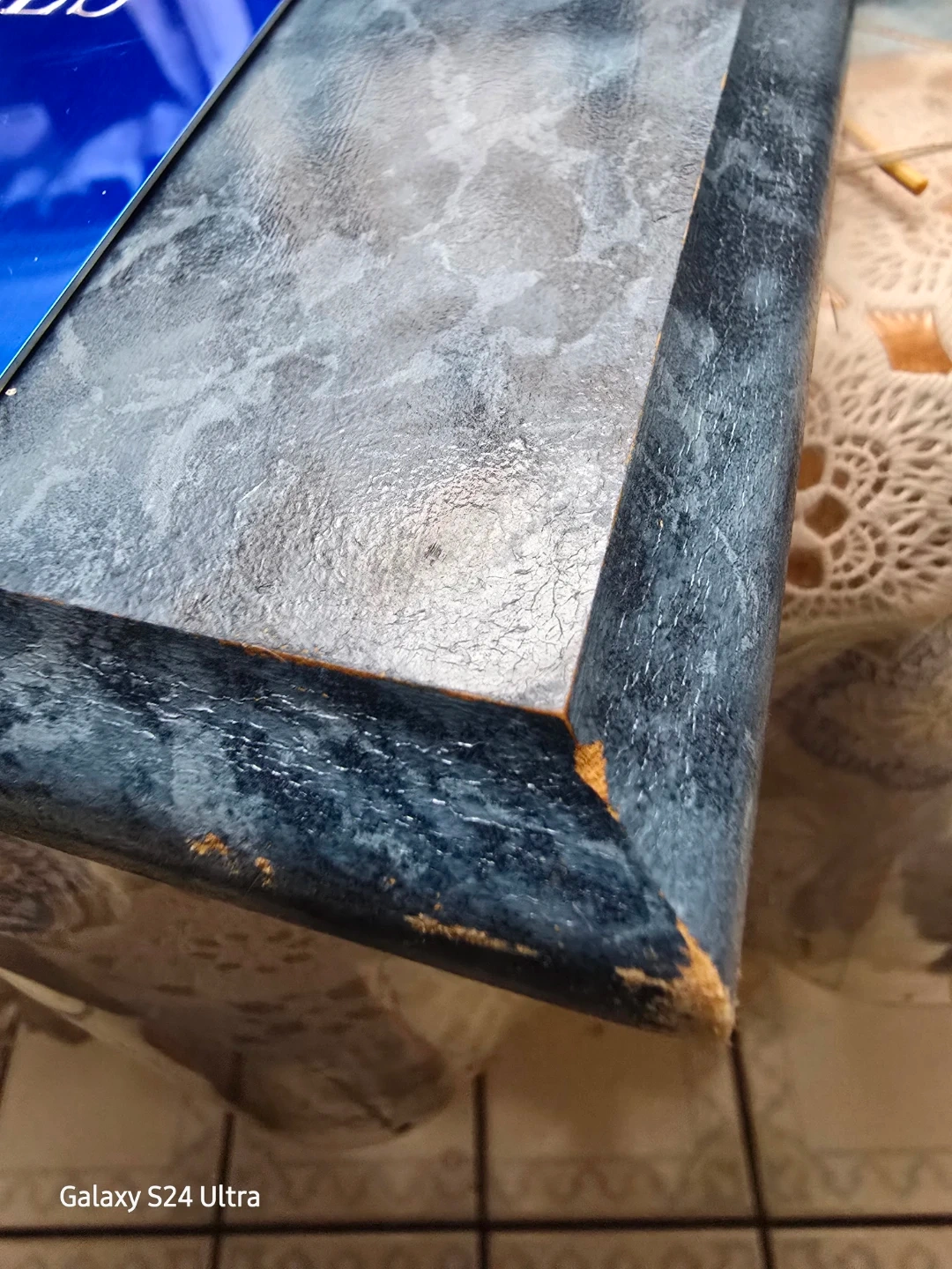 Note: Bruised corners of the wood frame (see pictures), missing 2 bottom brass tacks that hold the plexiglass against the faux marble frame.
