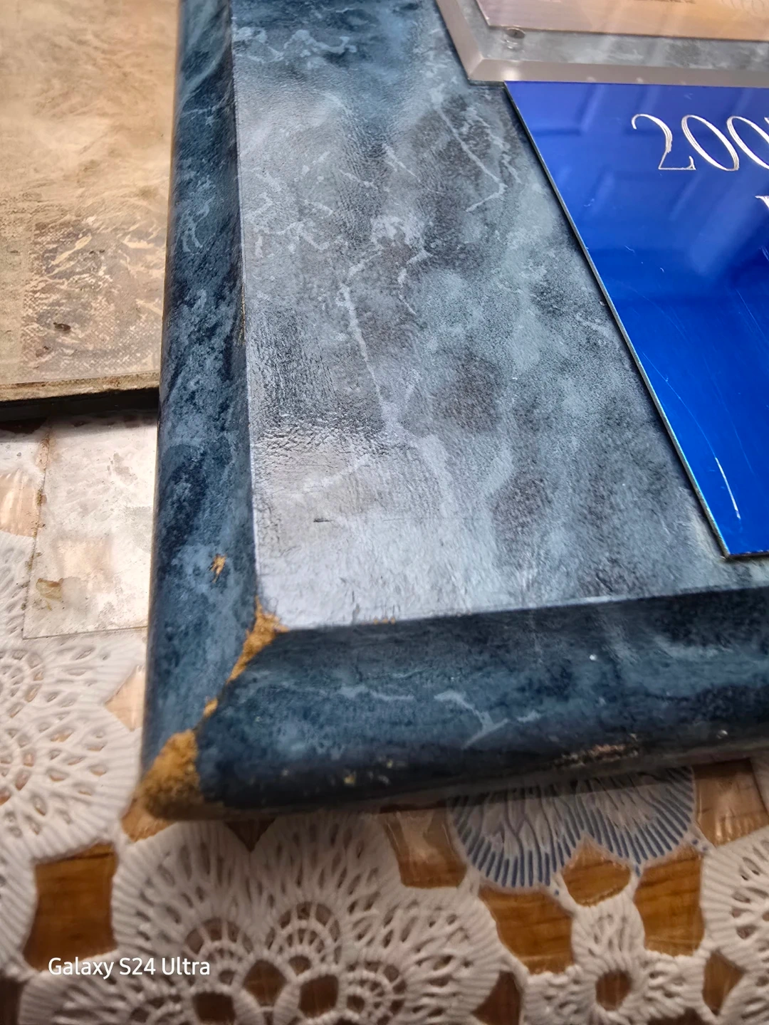 ● Framing: The photo is protected under plexiglass and set into a textured blue marble-look plaque.