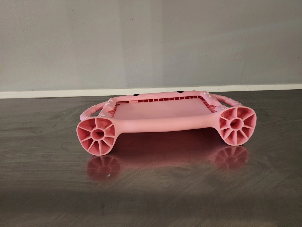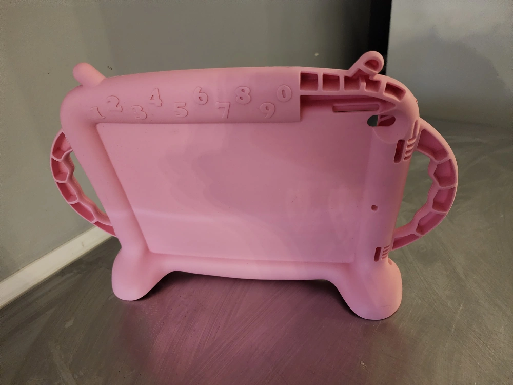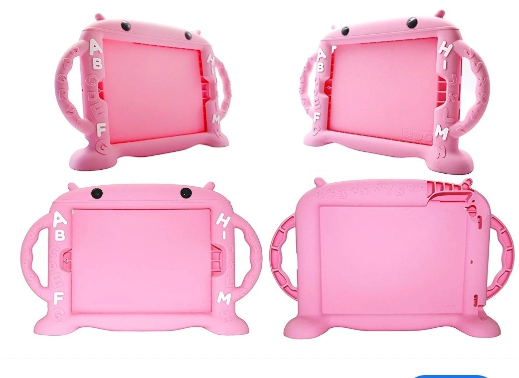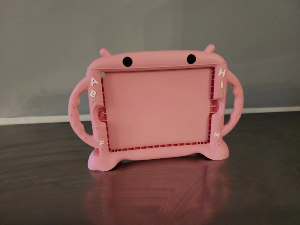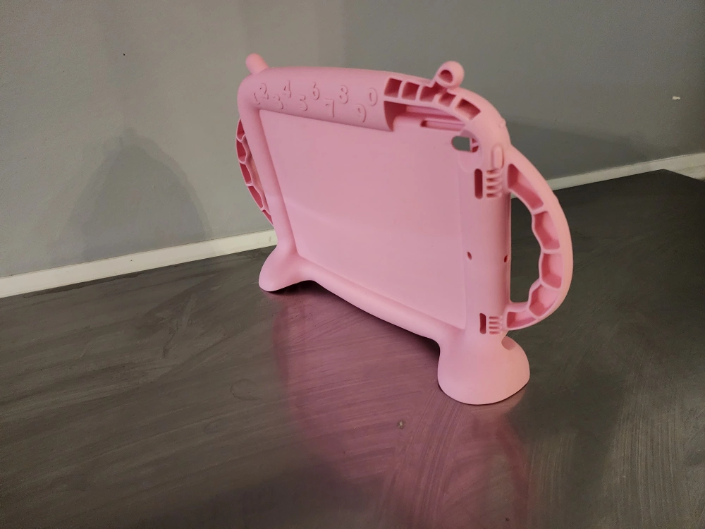 120This is a pink tablet case with built-in handles and a kickstand. The case has letters and numbers printed on it.