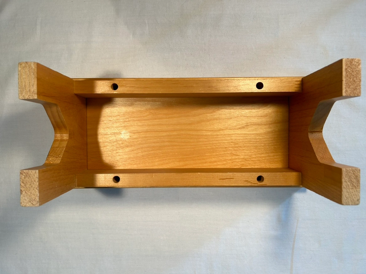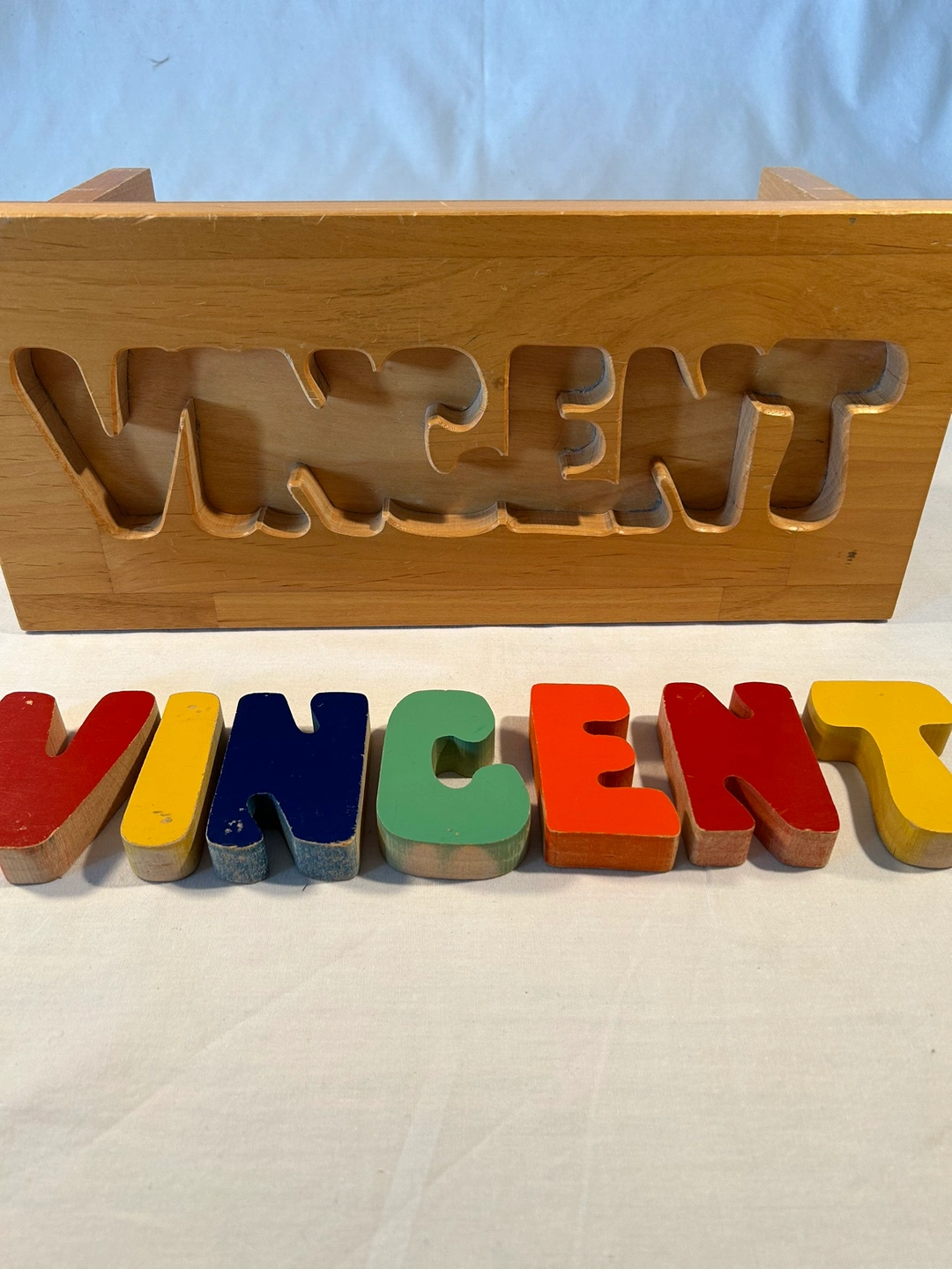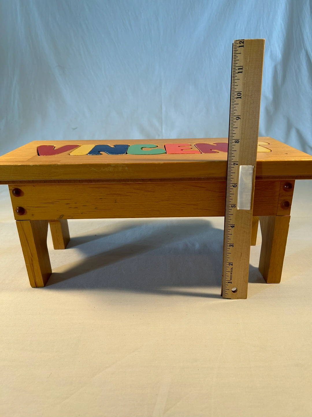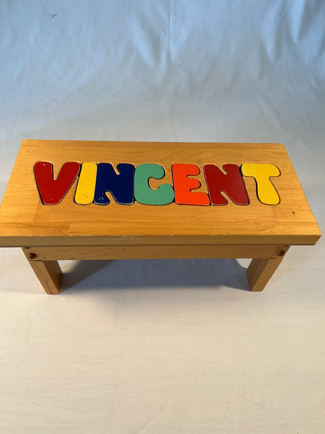 Wooden step stool with “VINCENT” colorful puzzle letters. Includes the letters to fit into the cutout. Solid oak. 15 1/2” X 7” X 7”; letters 3” X 3/4” thick.