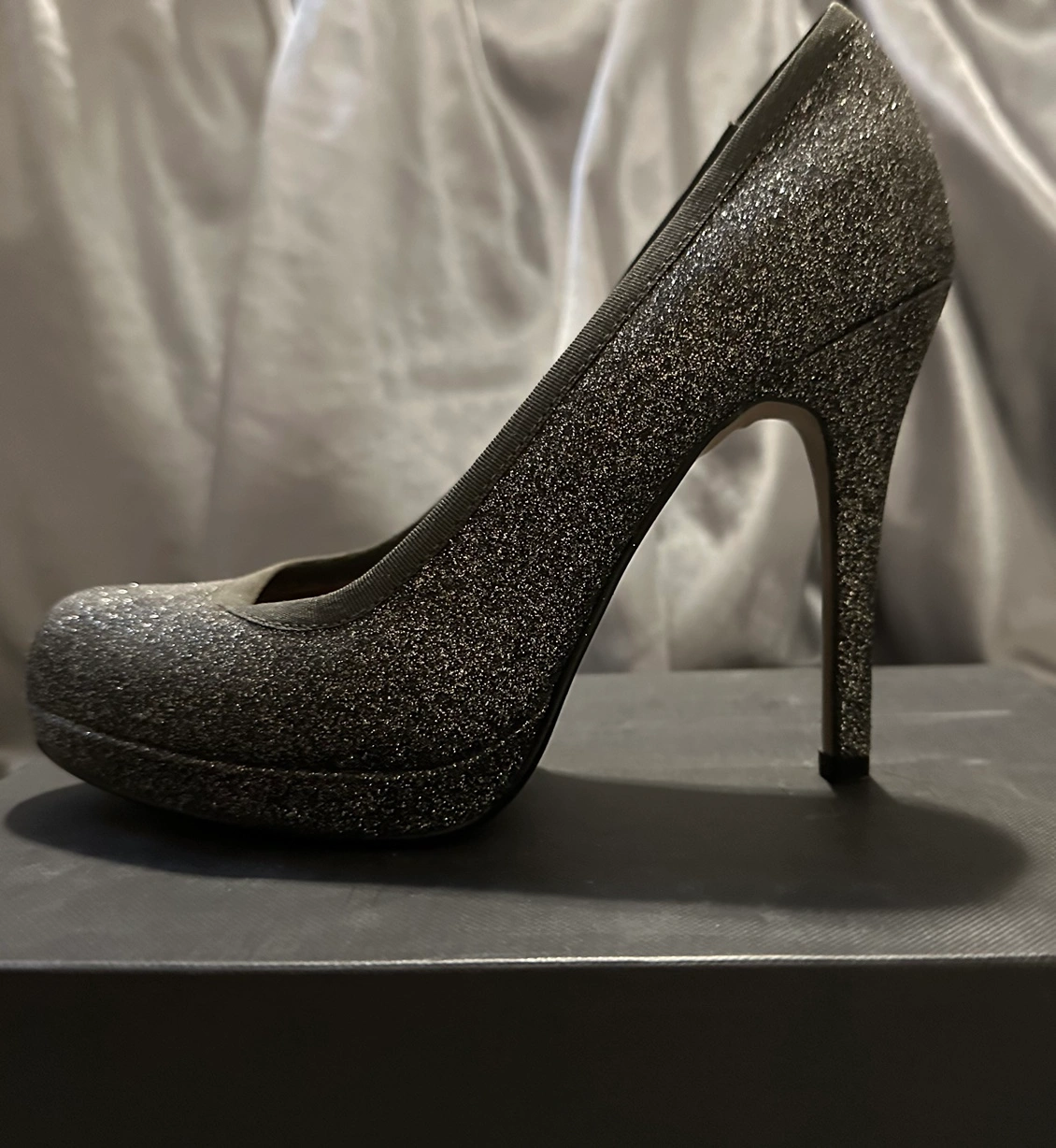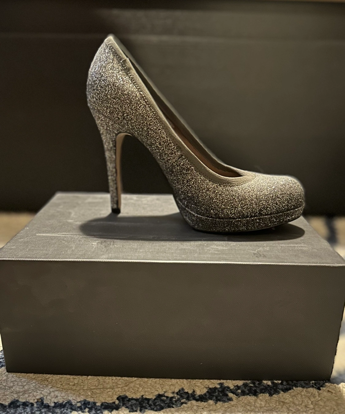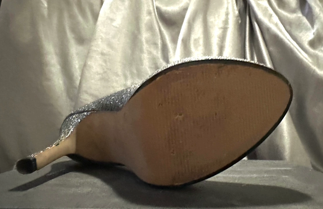 123This pair of sparkling silver over gunmetal color base is perfect for an eventful evening. Add some brilliance to your look on a night out or formal event. Heel measures 4”height, cushioned sole interior ,and a rounded tip at the front.There is a 1/4” nylon binding in color dark gray around the entire top edge of the shoe. The smooth gold metallic leather interior lining feels comfortable as well. The shoes were worn one time which matched a bridesmaid dress the bride picked out. The shoes are very pretty but not something that goes well with my typical casual wear. If you wish to dress to impress, these shoes will definitely achieve that! Stilettos Elegant Glitter Sparkling Women’s heels Women’s Shoes
