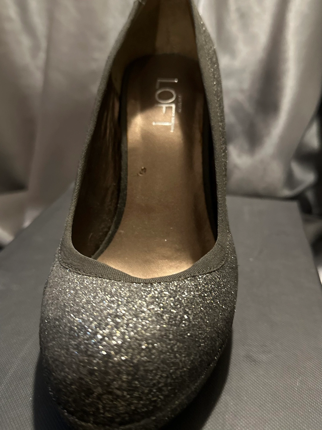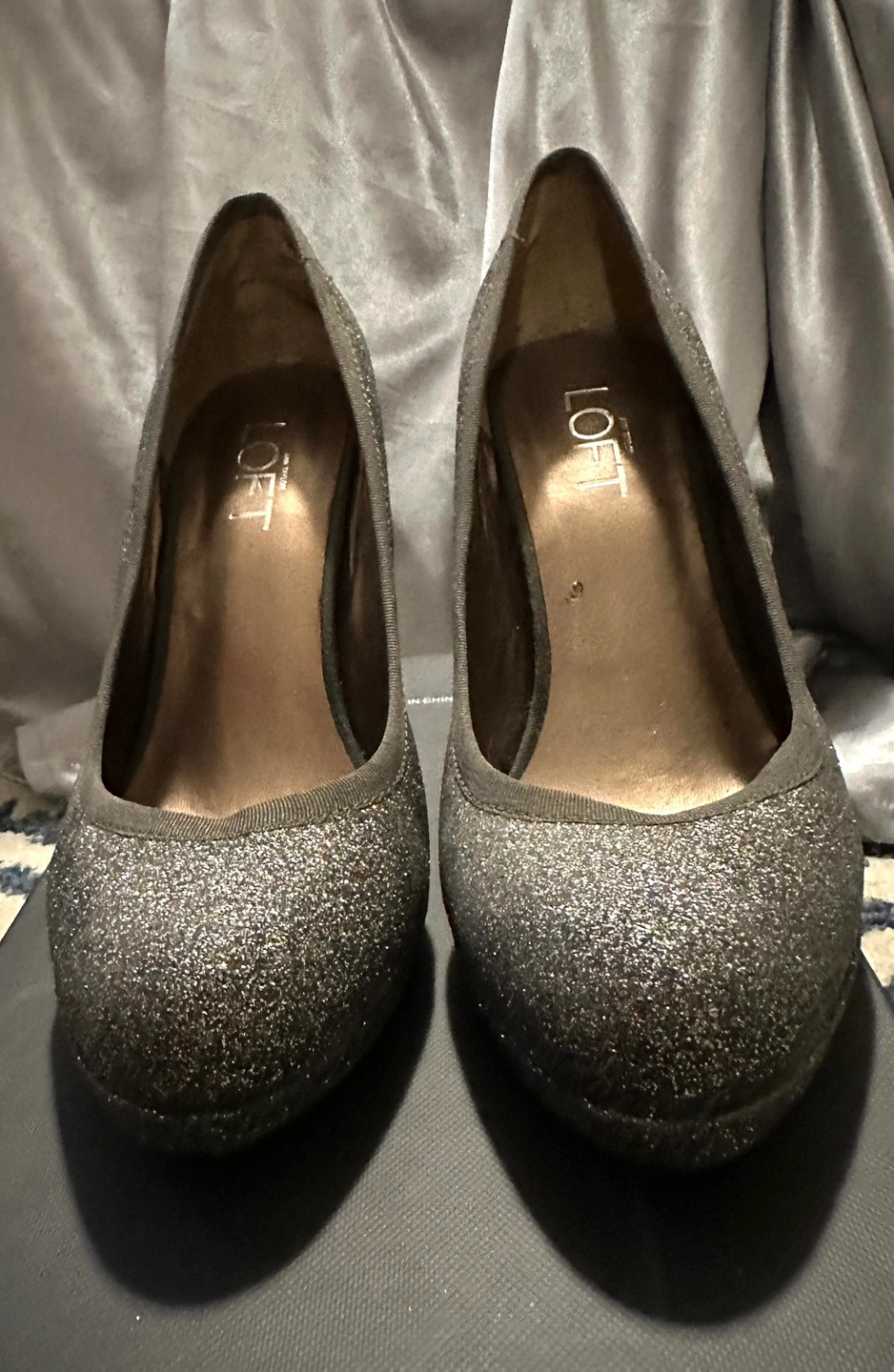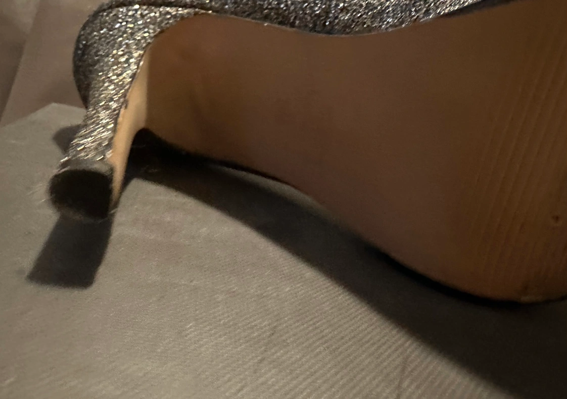 123This pair of sparkling silver over gunmetal color base is perfect for an eventful evening. Add some brilliance to your look on a night out or formal event. Heel measures 4”height, cushioned sole interior ,and a rounded tip at the front.There is a 1/4” nylon binding in color dark gray around the entire top edge of the shoe. The smooth gold metallic leather interior lining feels comfortable as well. The shoes were worn one time which matched a bridesmaid dress the bride picked out. The shoes are very pretty but not something that goes well with my typical casual wear. If you wish to dress to impress, these shoes will definitely achieve that! Stilettos Elegant Glitter Sparkling Women’s heels Women’s Shoes