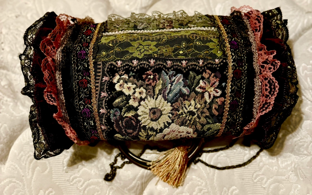 Antique and Rare Vintage Floral Victorian Lace Handmade Bag, This is a vintage handbag with a floral print and gold detailing. It features a top handle and a clasp closure. It is made of a tapestry fabric and has a tassel on the zipper. New Never Used Ready to Ship/ Pick up ๐