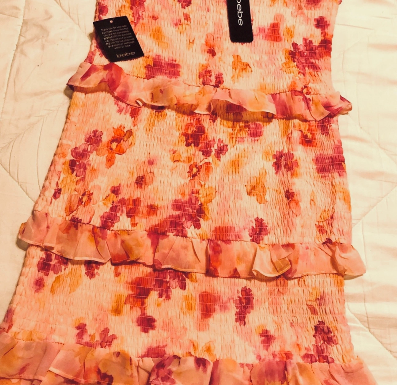 Bebe floral mini dress with adjustable straps and a tiered ruffle hem. New with tag Ready to ship/pick up π