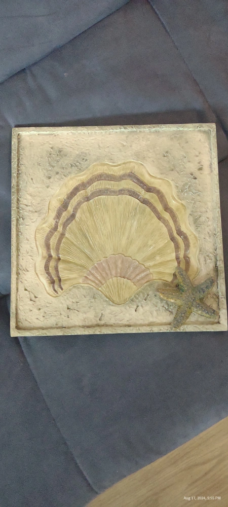 381This is a wall decor piece featuring a large seashell with a starfish. It is made of a hard ceramic material.