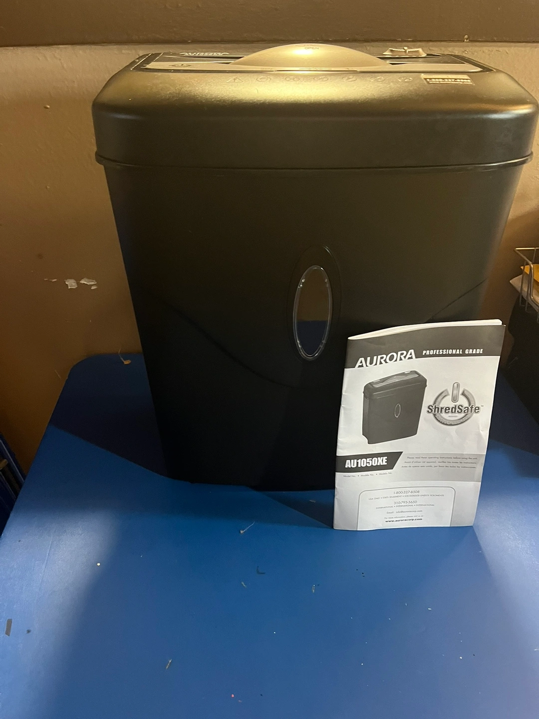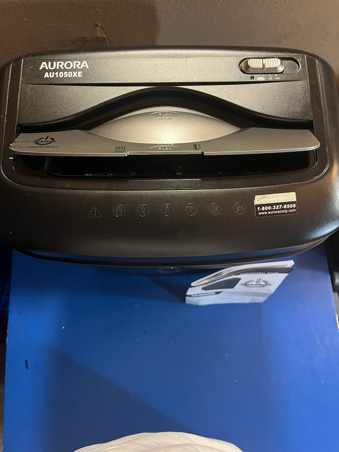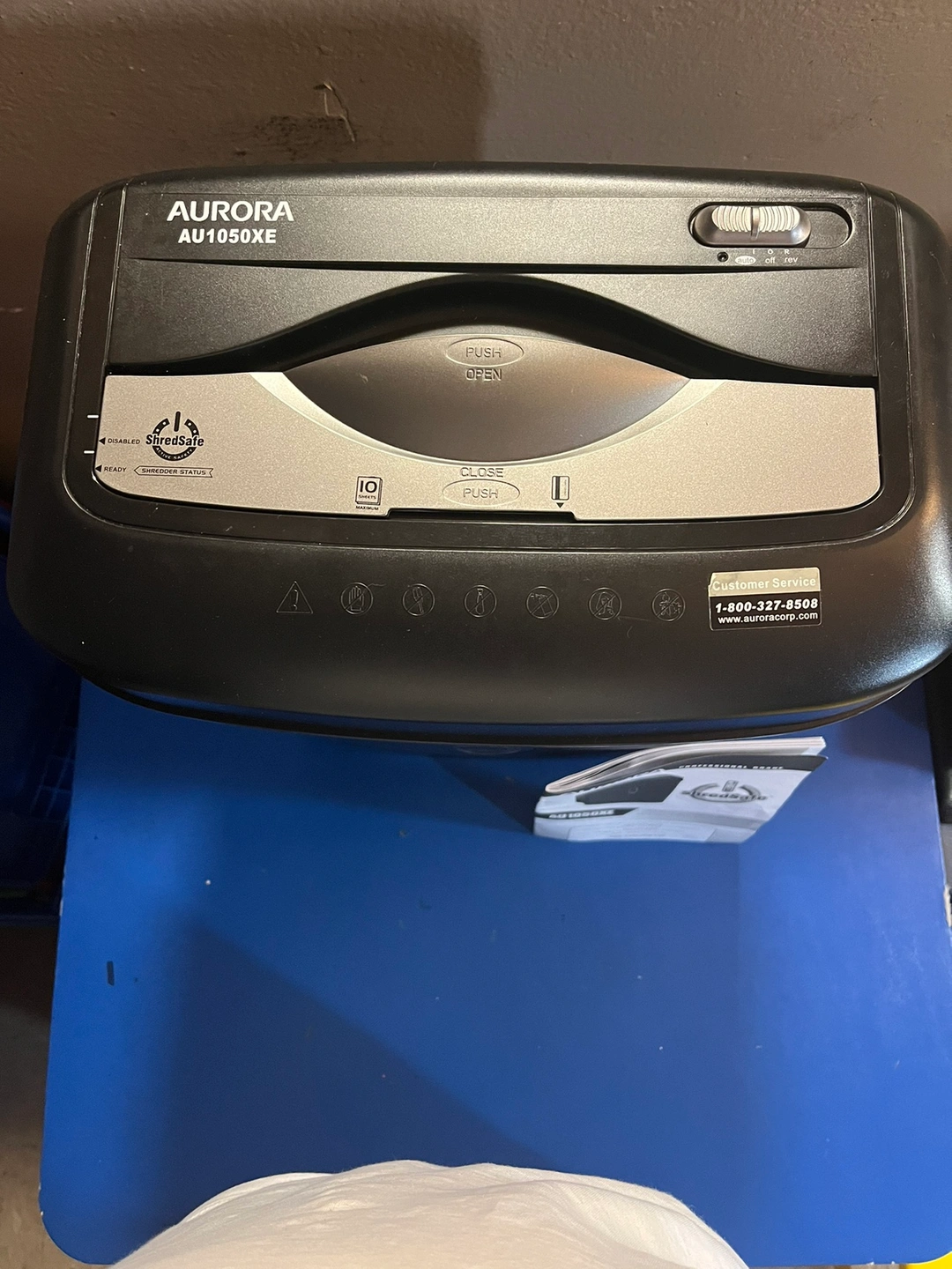 Black paper shredder with a 10-sheet capacity. It is a cross-cut shredder with a safety feature that automatically stops the machine when the bin is full.