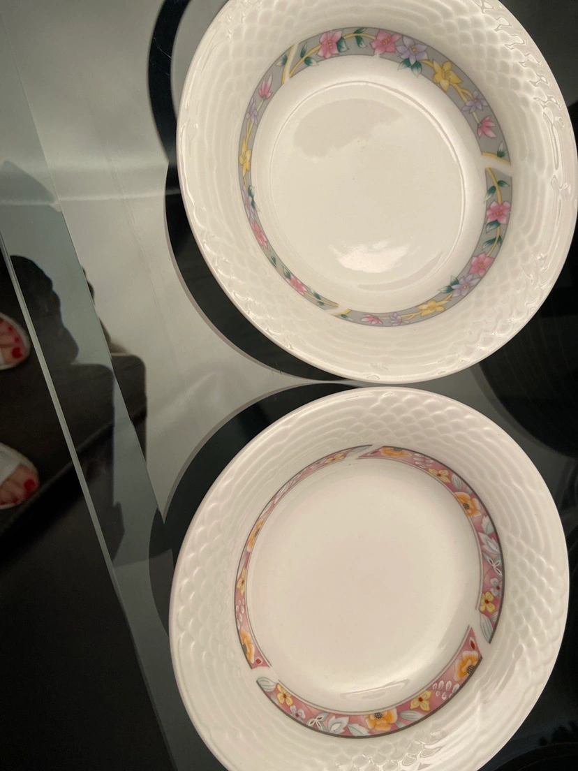 Set of plates and bowls. Matching set includes 10 dinner plates, 6 salad plates, 5 pasta plates, 3 bowls.