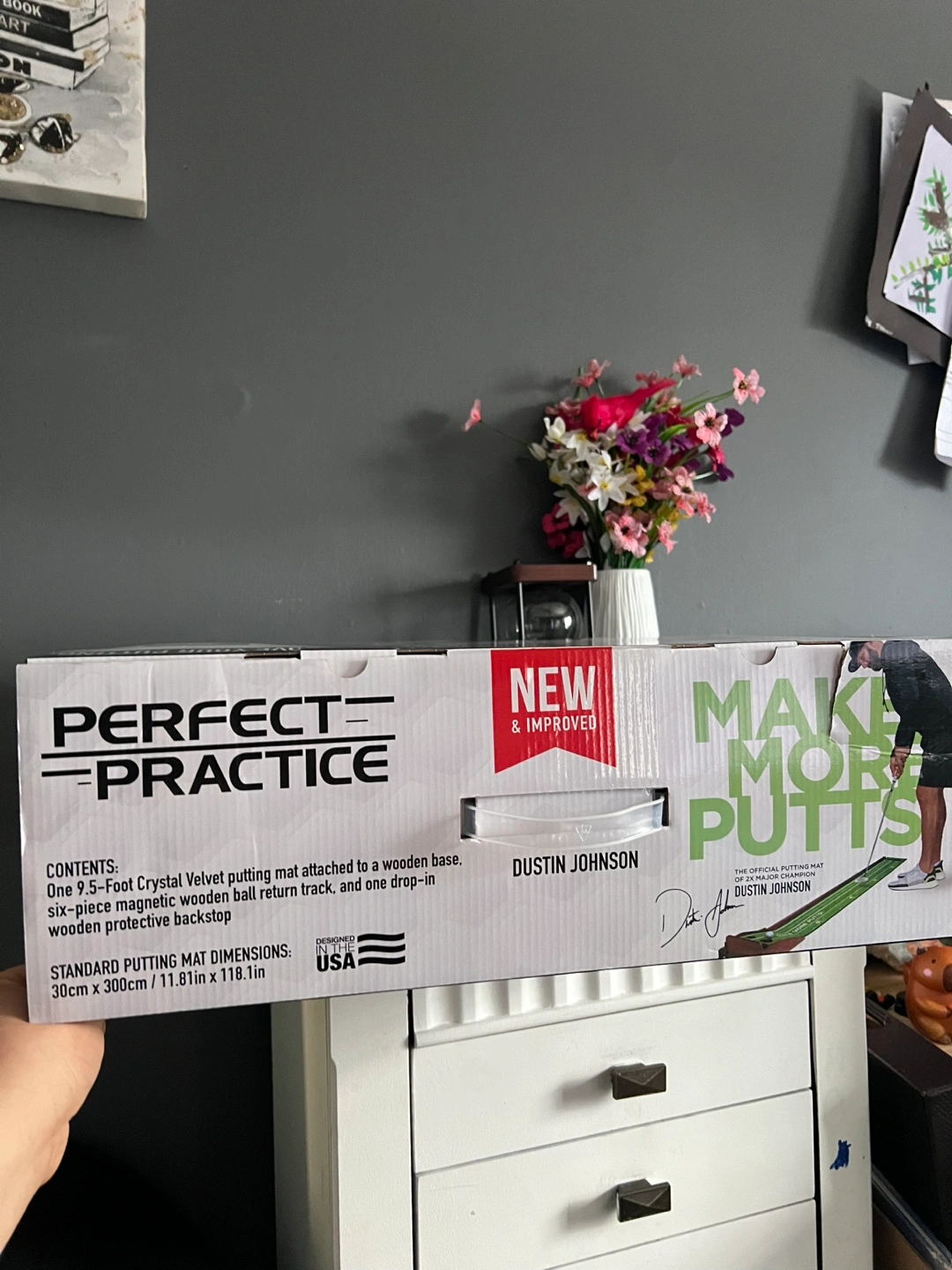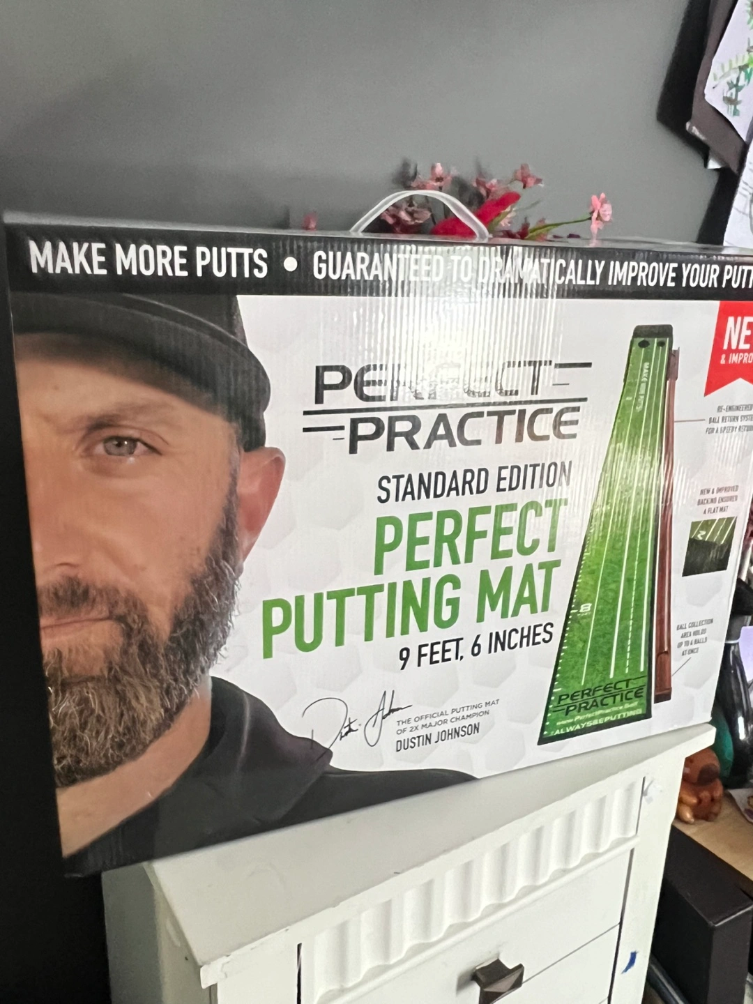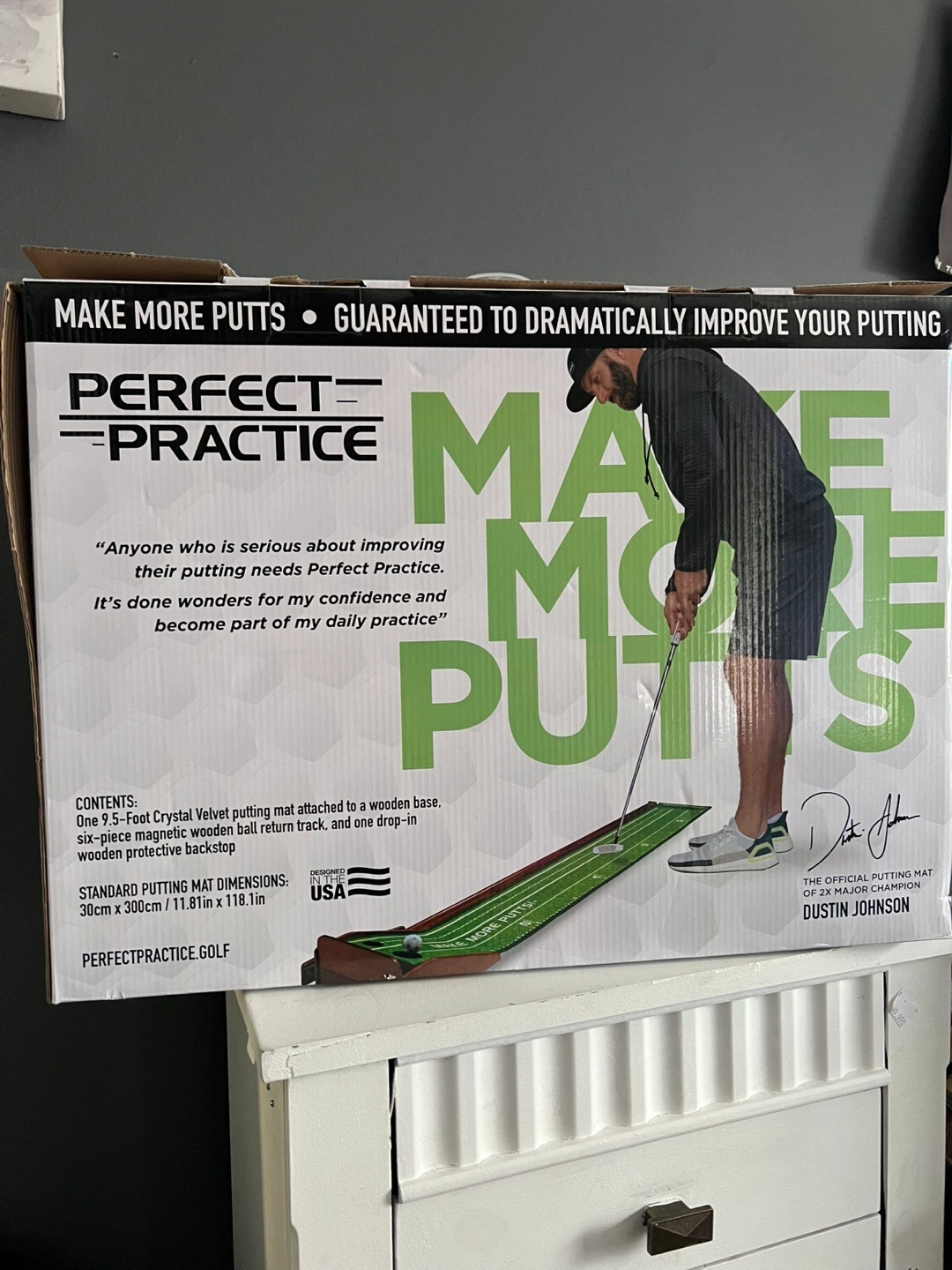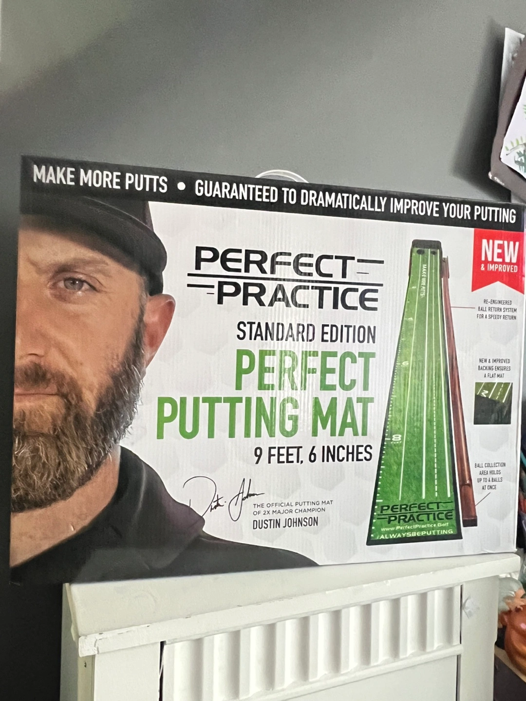 This Perfect Practice putting mat is the standard edition and measures 9 feet 6 inches. It's made with crystal velvet and includes a wooden base, a six-piece magnetic wooden ball return track, and a drop-in wooden protective backstop. Use it to improve your putting game anytime!