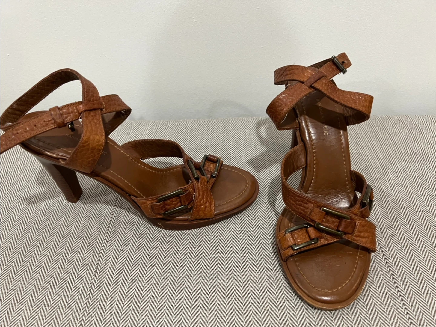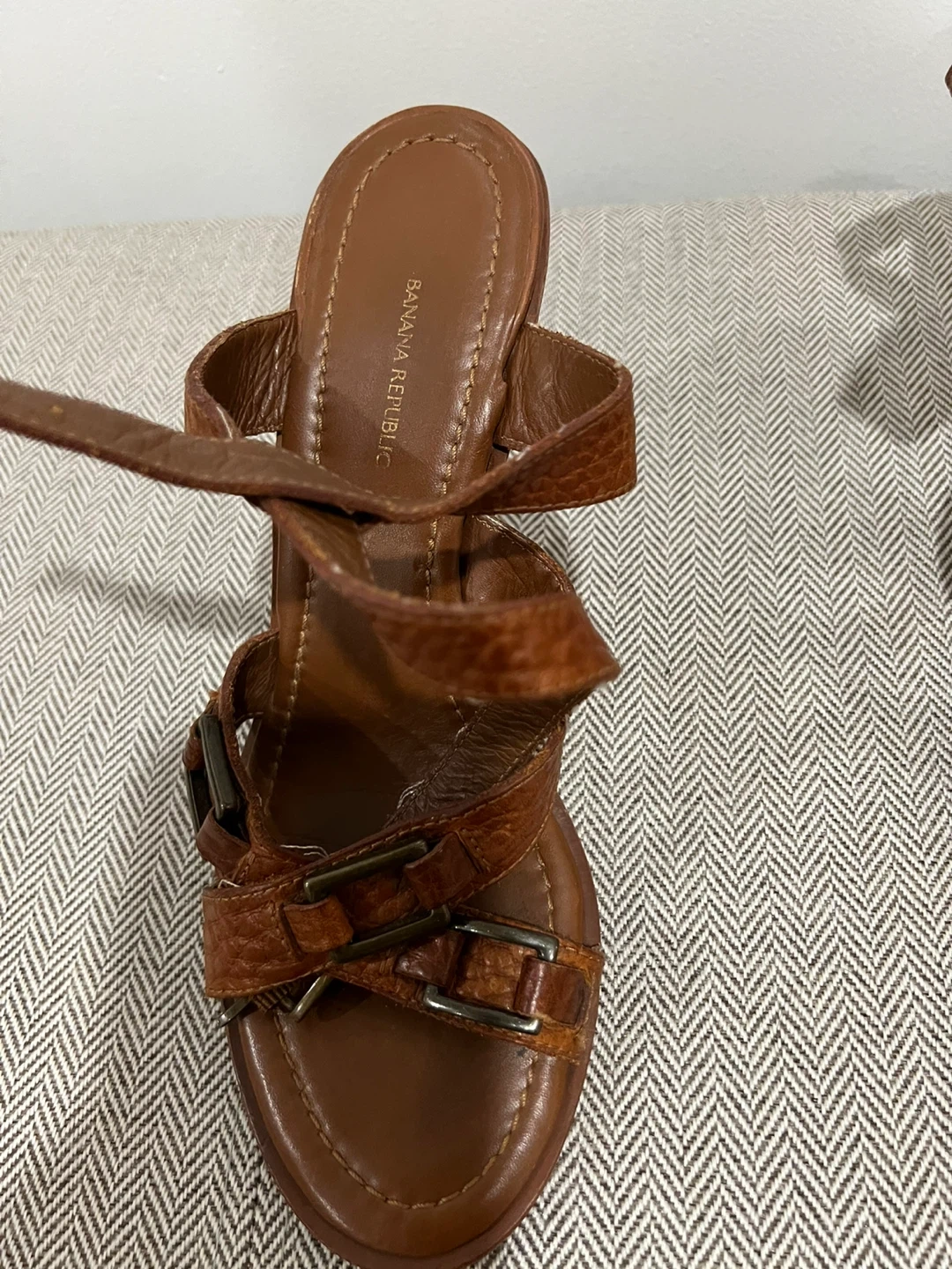 Selling a pair of Banana Republic brown leather heels. They're in great condition and feature a stylish strappy design with buckle accents. Perfect for adding a touch of sophistication to any outfit!