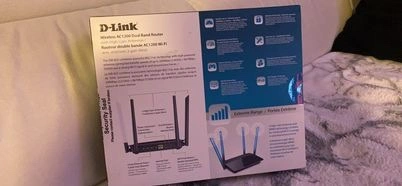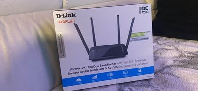 10D-Link AC1200 Dual Band Router. Includes high-gain antennas and a quick setup guide.