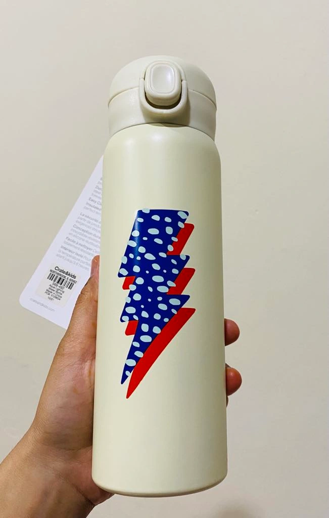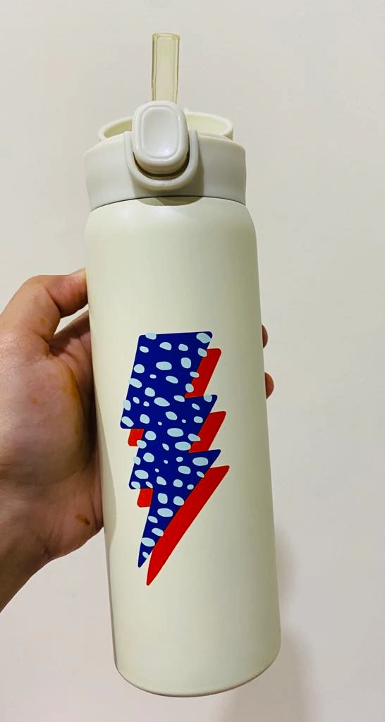 50White stainless steel water bottle with a blue and red lightning bolt design and a straw lid.