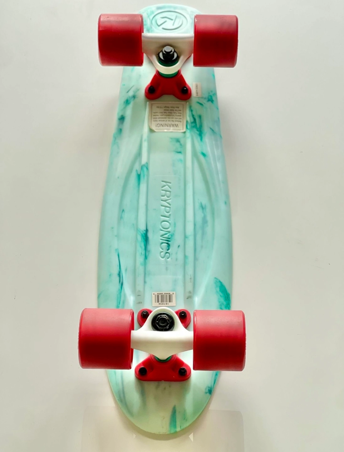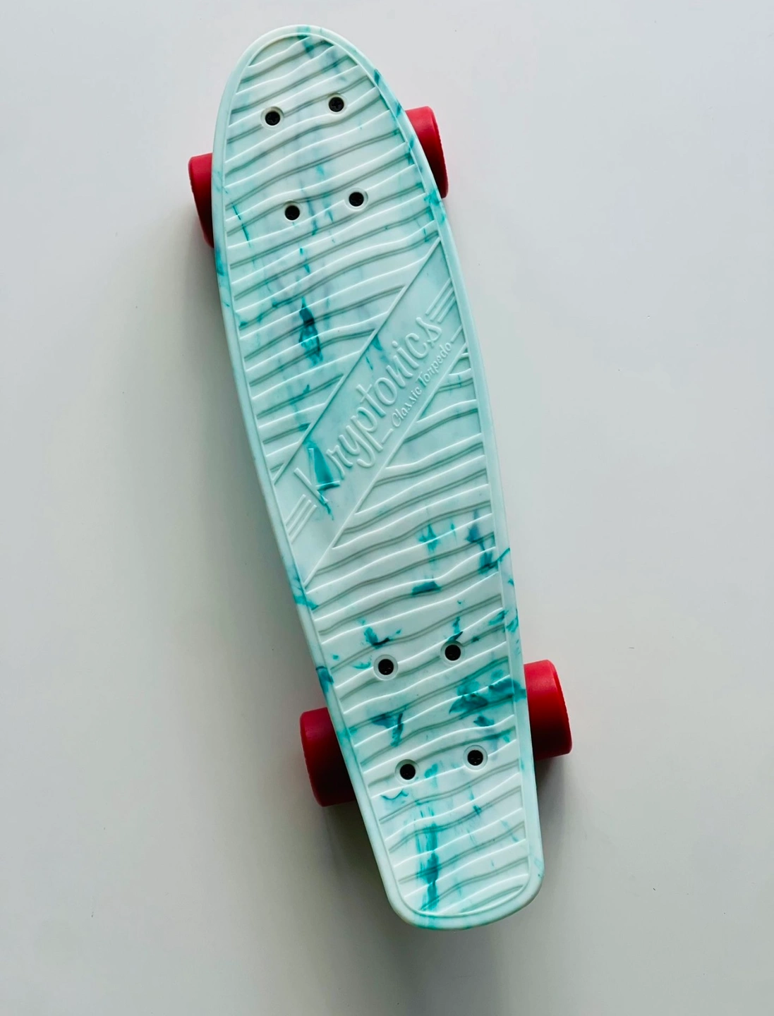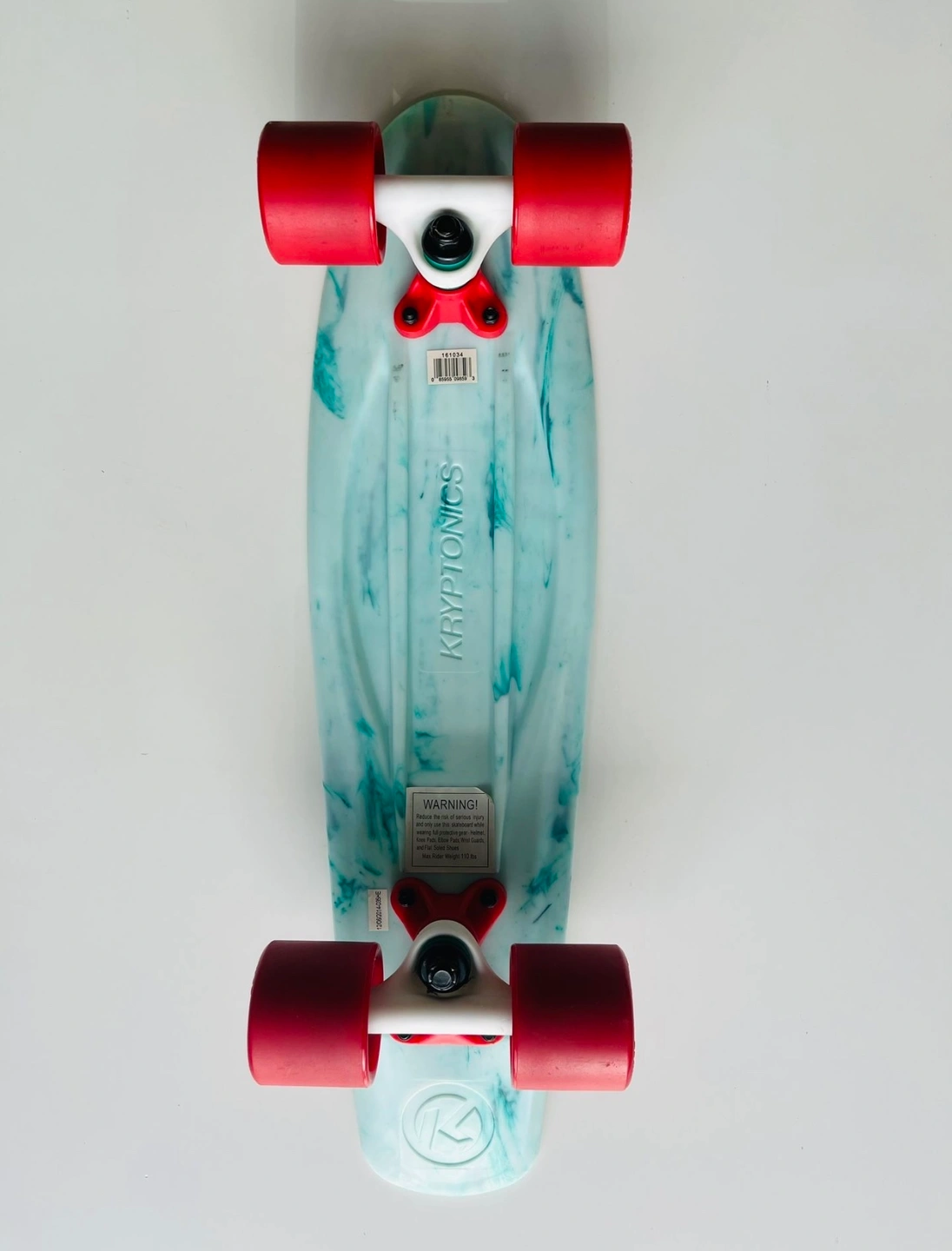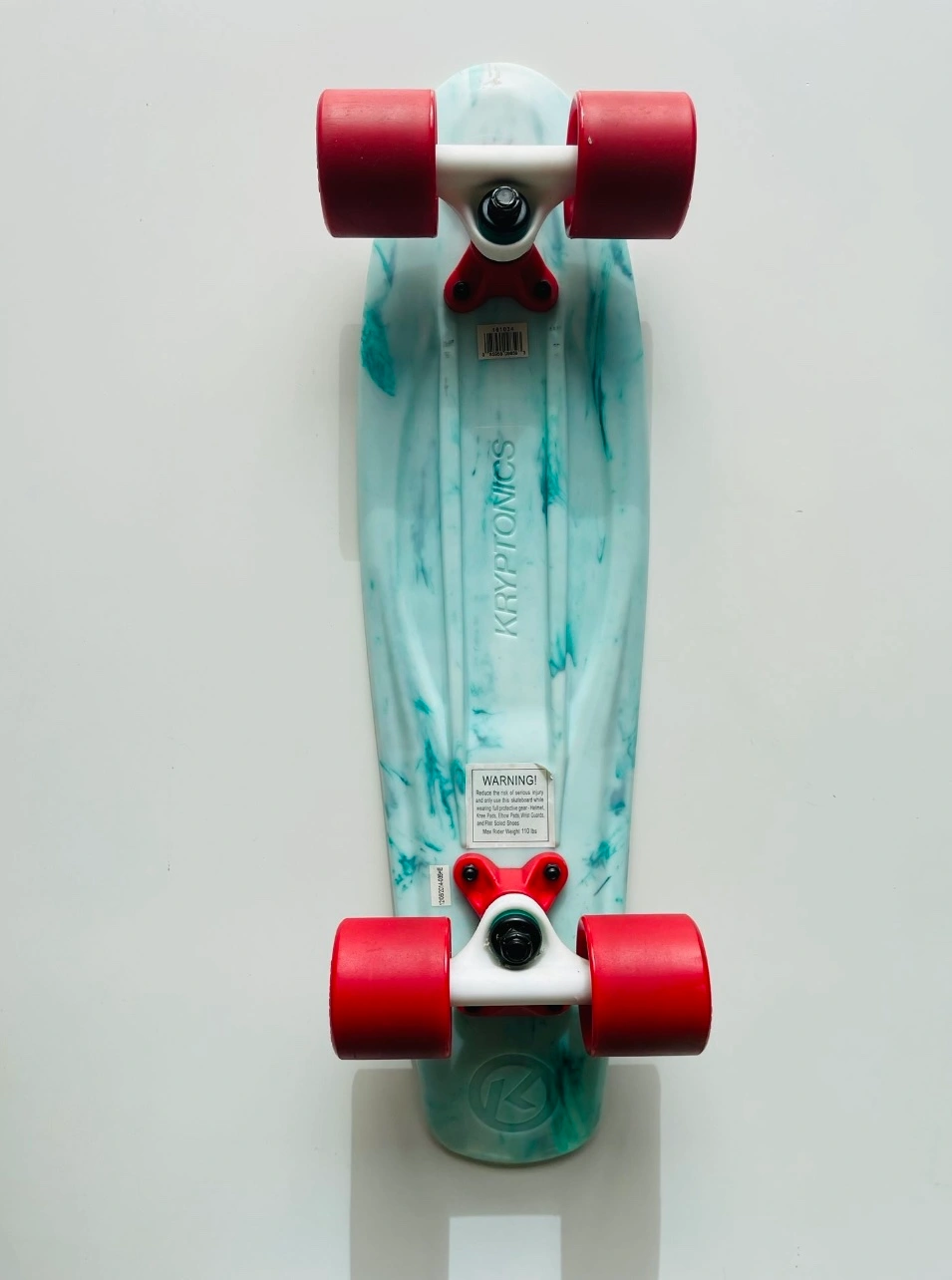 1000+New Variflex Kryptonics Classic Skateboard in Marbled Green-white finish with red wheels Description: Established in 1965, Kryptonics is one of the most authentic brands in skateboarding and changed the game in 1976 by developing the first urethane skateboard wheel, and the innovation hasn’t stopped since. Every detailed construction of deck, truck, bearing and wheel is considered to reach all age groups and riding styles. Come fully assembled, make sure to adjust trucks based on skating preference and ability. Features & details: COMPLETE SKATEBOARD: Complete skateboard with included trucks and wheels so you can hit the skatepark as soon as you're ready SMOOTH RIDE: 60mm x 51mm polyurethane-injected wheels and carbon steel ABEC-3 bearings deliver a smooth ride on any surface DURABLE CONSTRUCTION: Made of polyurethane and Steel FOR THE YOUNG SKATER: Accommodates skaters age 13 and up, ideal for heights 5'3" or taller DIMENSIONS: 22.5'' x 6''