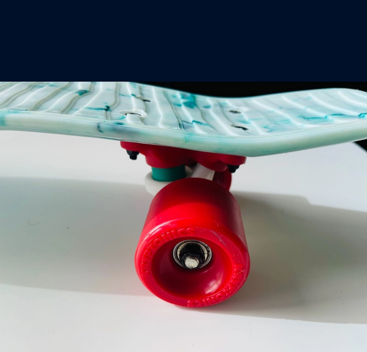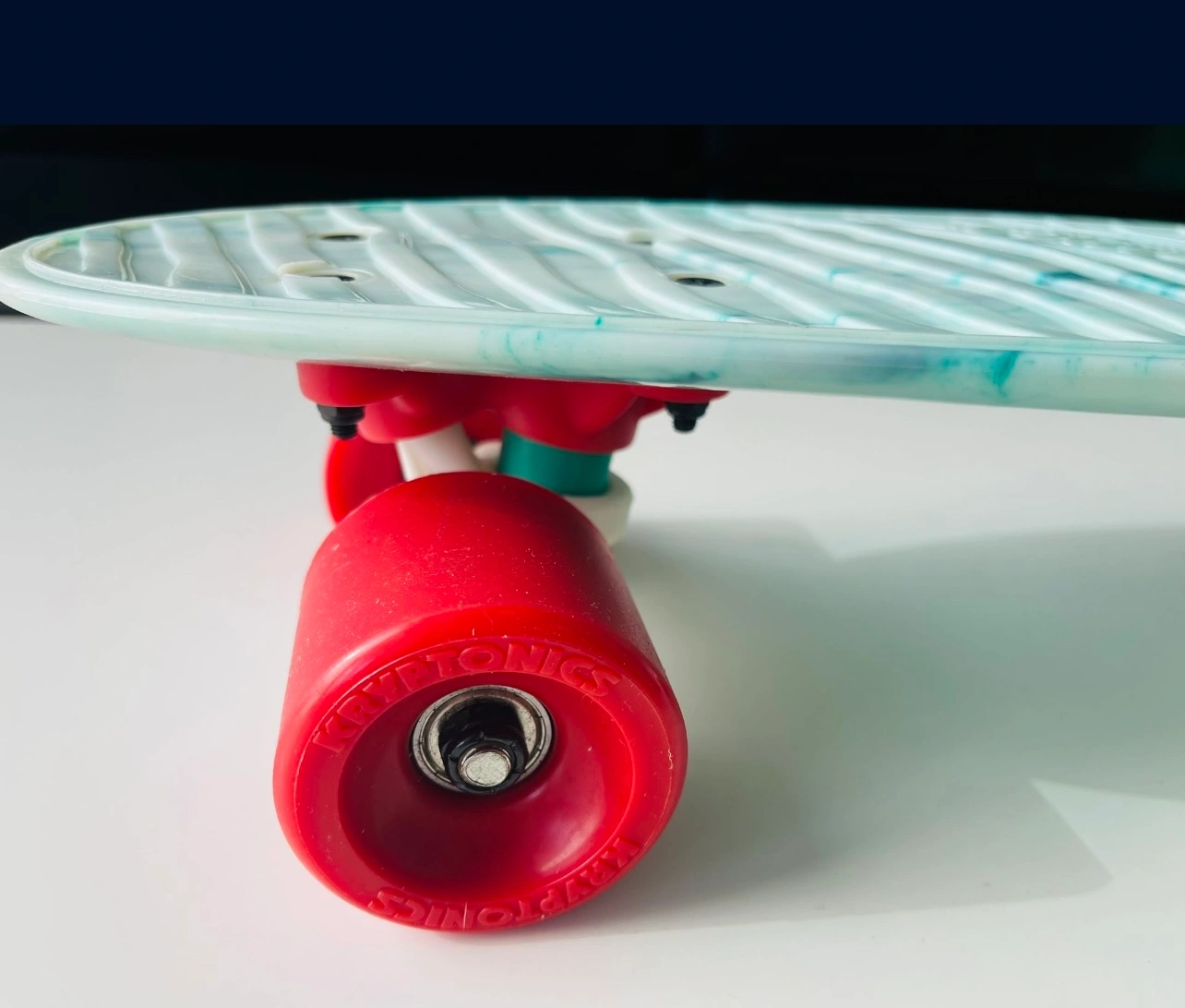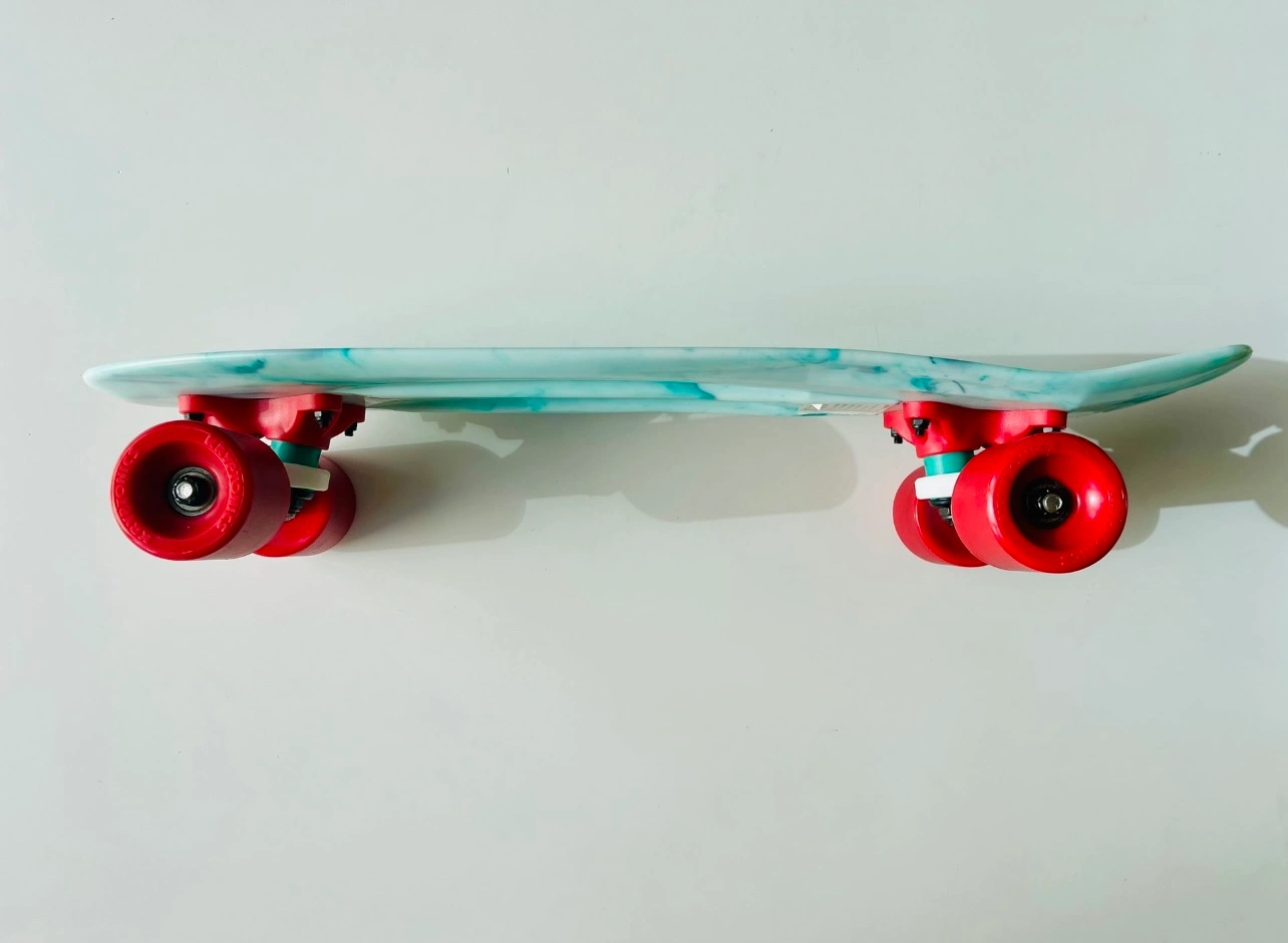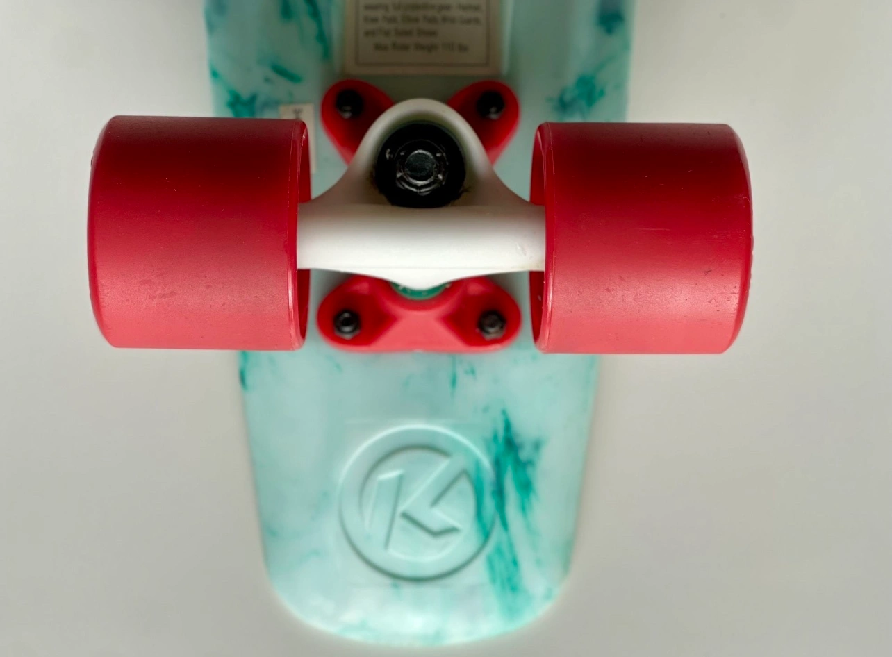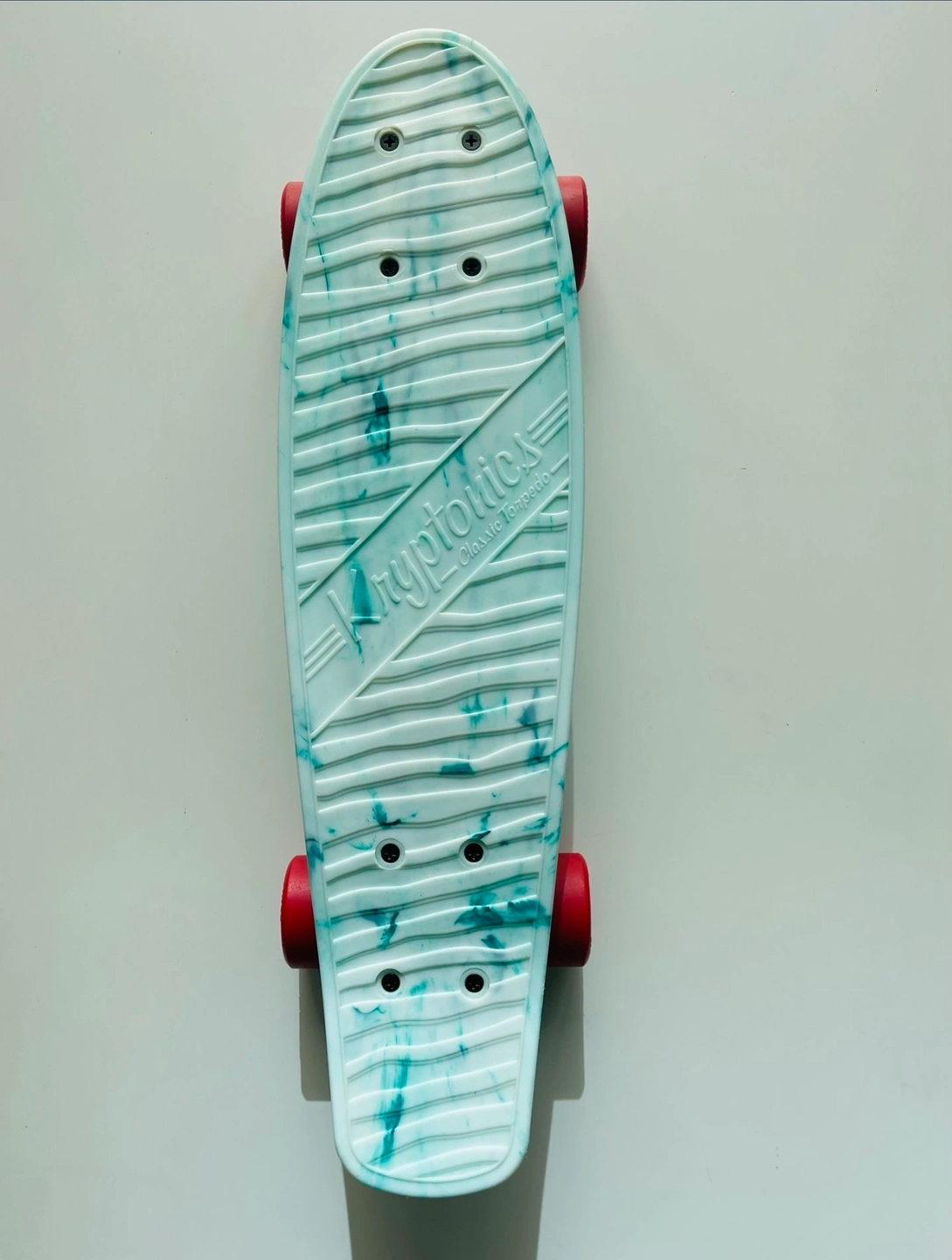 1000+New Variflex Kryptonics Classic Skateboard in Marbled Green-white finish with red wheels Description: Established in 1965, Kryptonics is one of the most authentic brands in skateboarding and changed the game in 1976 by developing the first urethane skateboard wheel, and the innovation hasn’t stopped since. Every detailed construction of deck, truck, bearing and wheel is considered to reach all age groups and riding styles. Come fully assembled, make sure to adjust trucks based on skating preference and ability. Features & details: COMPLETE SKATEBOARD: Complete skateboard with included trucks and wheels so you can hit the skatepark as soon as you're ready SMOOTH RIDE: 60mm x 51mm polyurethane-injected wheels and carbon steel ABEC-3 bearings deliver a smooth ride on any surface DURABLE CONSTRUCTION: Made of polyurethane and Steel FOR THE YOUNG SKATER: Accommodates skaters age 13 and up, ideal for heights 5'3" or taller DIMENSIONS: 22.5'' x 6''