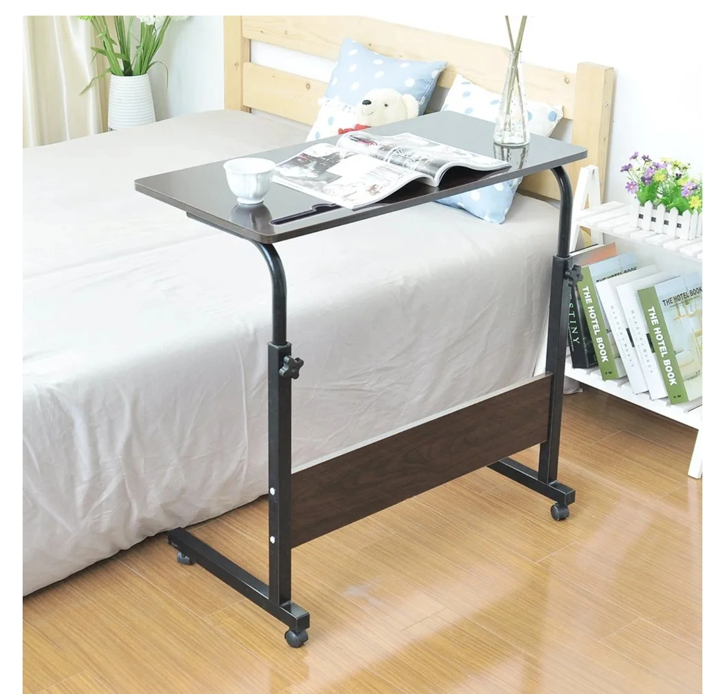 A rolling desk with a height-adjustable table that is perfect for working from home or using in bed.