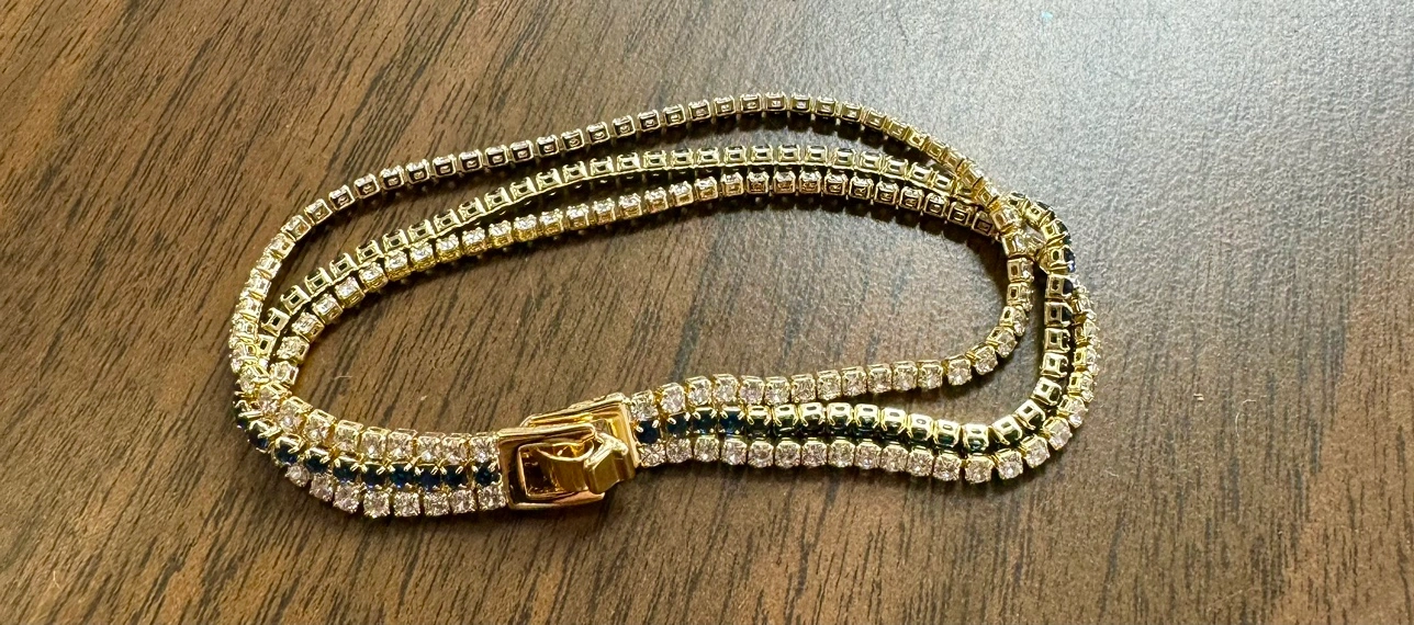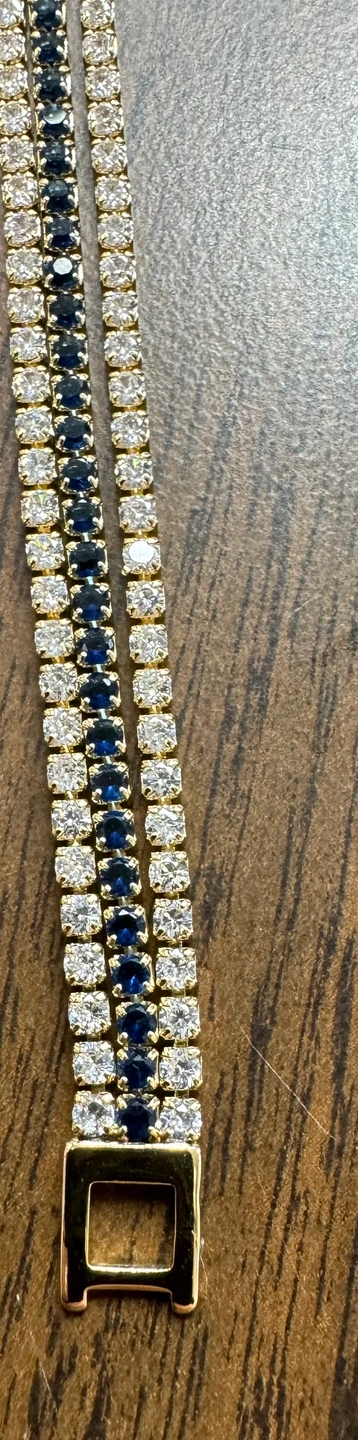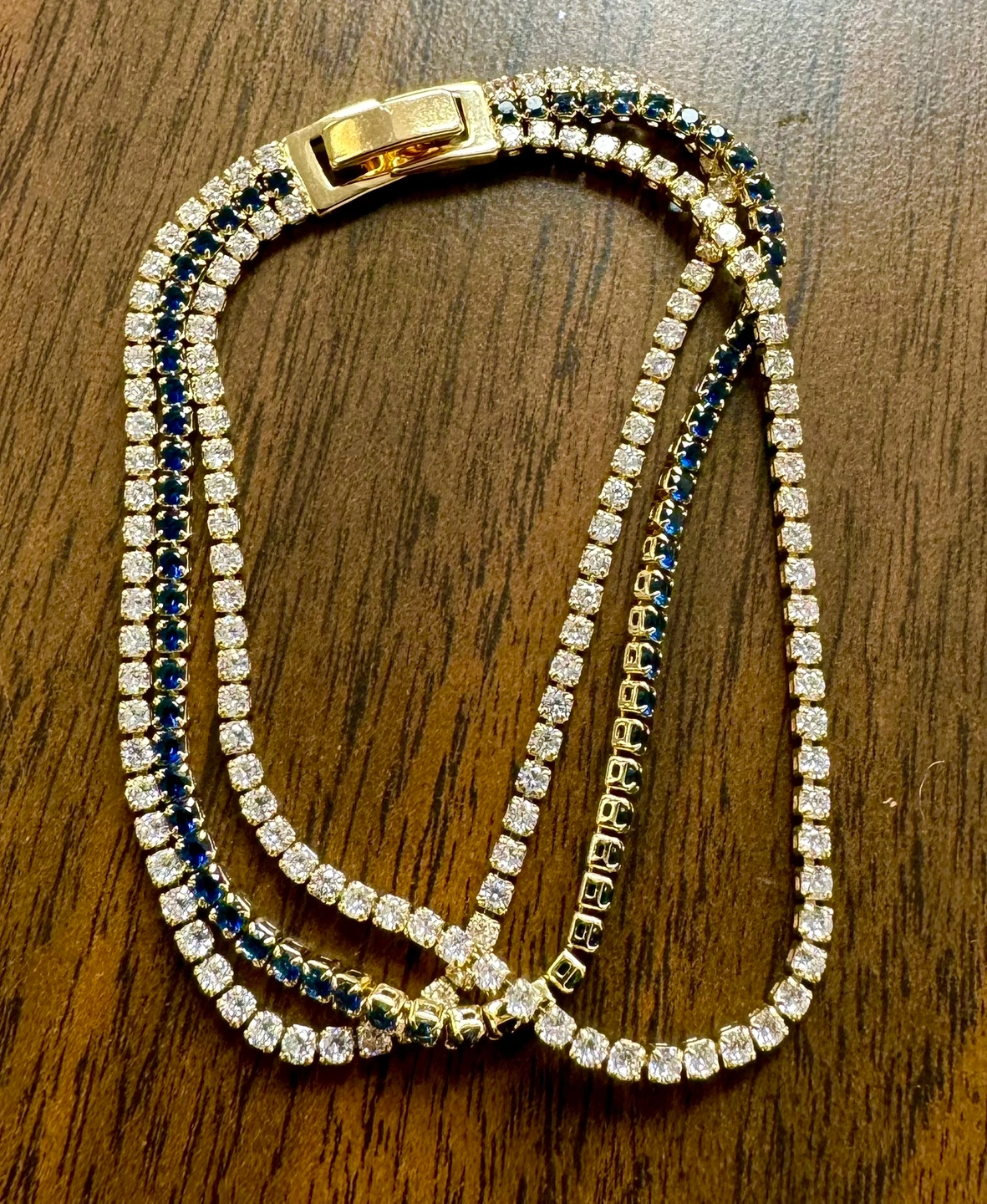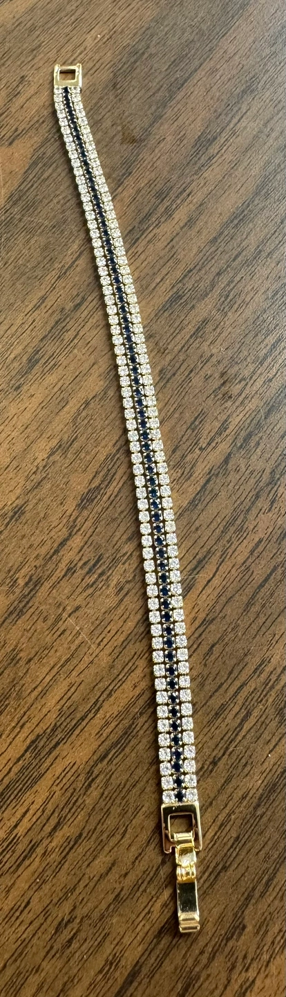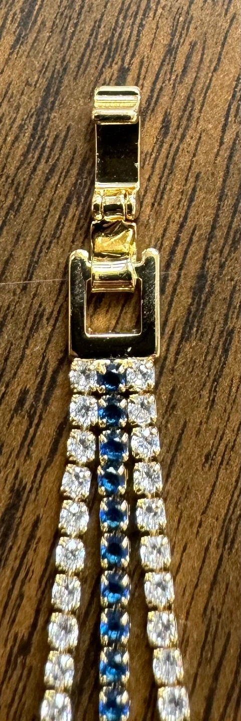 This is a gold-toned bracelet that features multiple rows of clear and blue rhinestones. It has a lobster claw clasp.