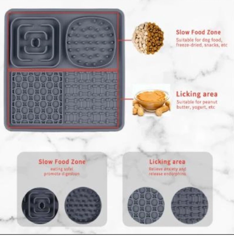 A multi-functional puzzle mat that can help slow down your dog's eating, relieve anxiety, and release endorphins. The mat has multiple sections, including a slow food zone and a licking area.