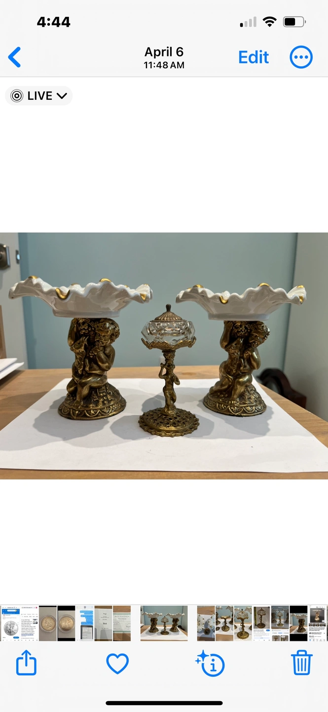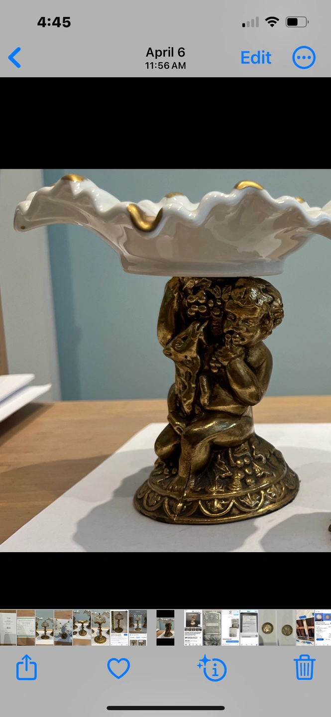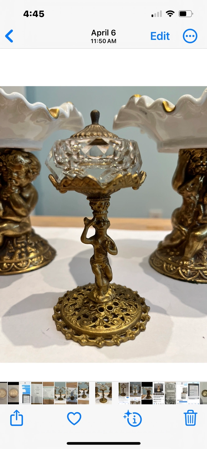 98Set of 2 vintage soap dishes with porcelain trays. Each tray has a cherub figurine holding a lamb and grapes. Each base is ornately decorated. 5.25”H x 5.5” W The Rare miniature Pedestal has a clear crystal topped piece with an ornately decorated metal base. 4.75” H -Soap Dishes sell for $34.03 each + S/H - Rare vintage Pedestal sells for $155.75 + S/H Ave U and East 66th Street, Brooklyn Local pickup Only