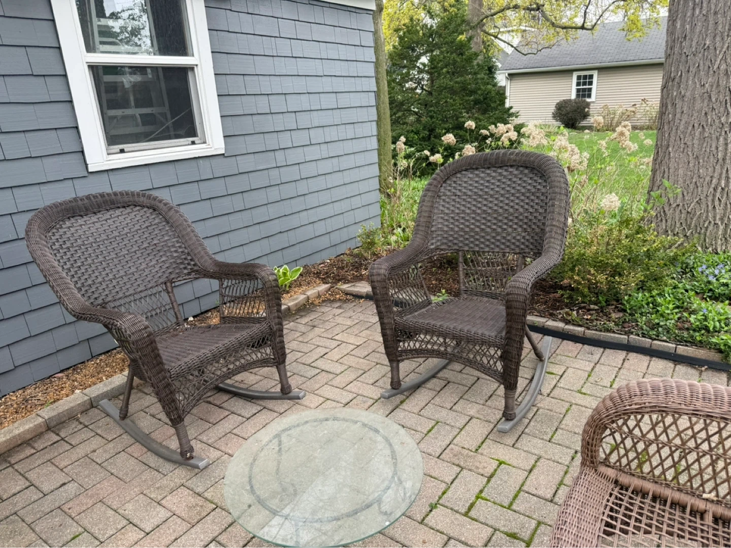 Brown wicker rocking chair with metal base. It's great for your patio or porch! Enjoy a relaxing evening outdoors. Both are great one needs a bit of work on the bottom