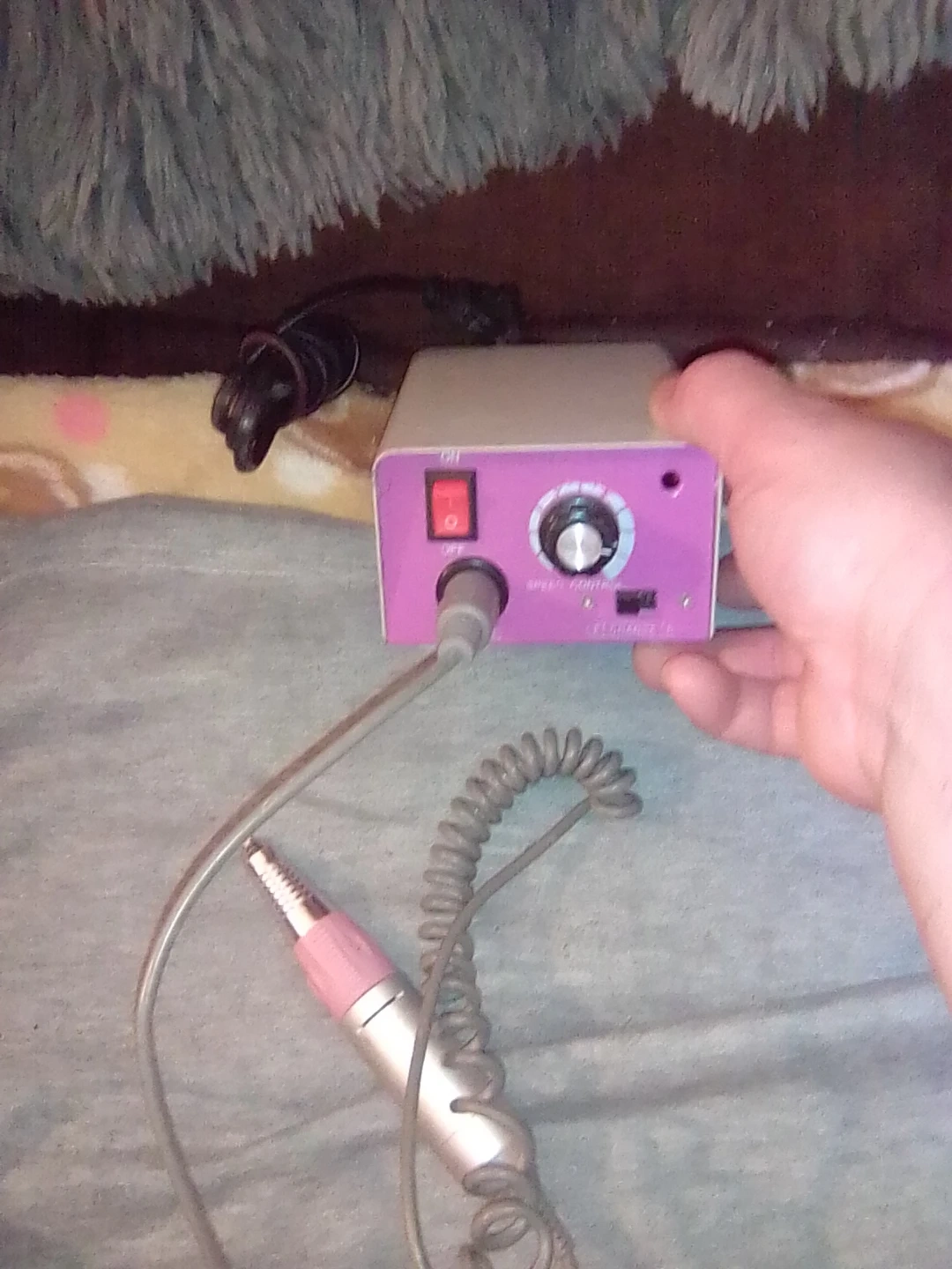 This is an electric nail file machine for manicures. It has a speed control dial on the unit. The handpiece is connected via a coiled cord.