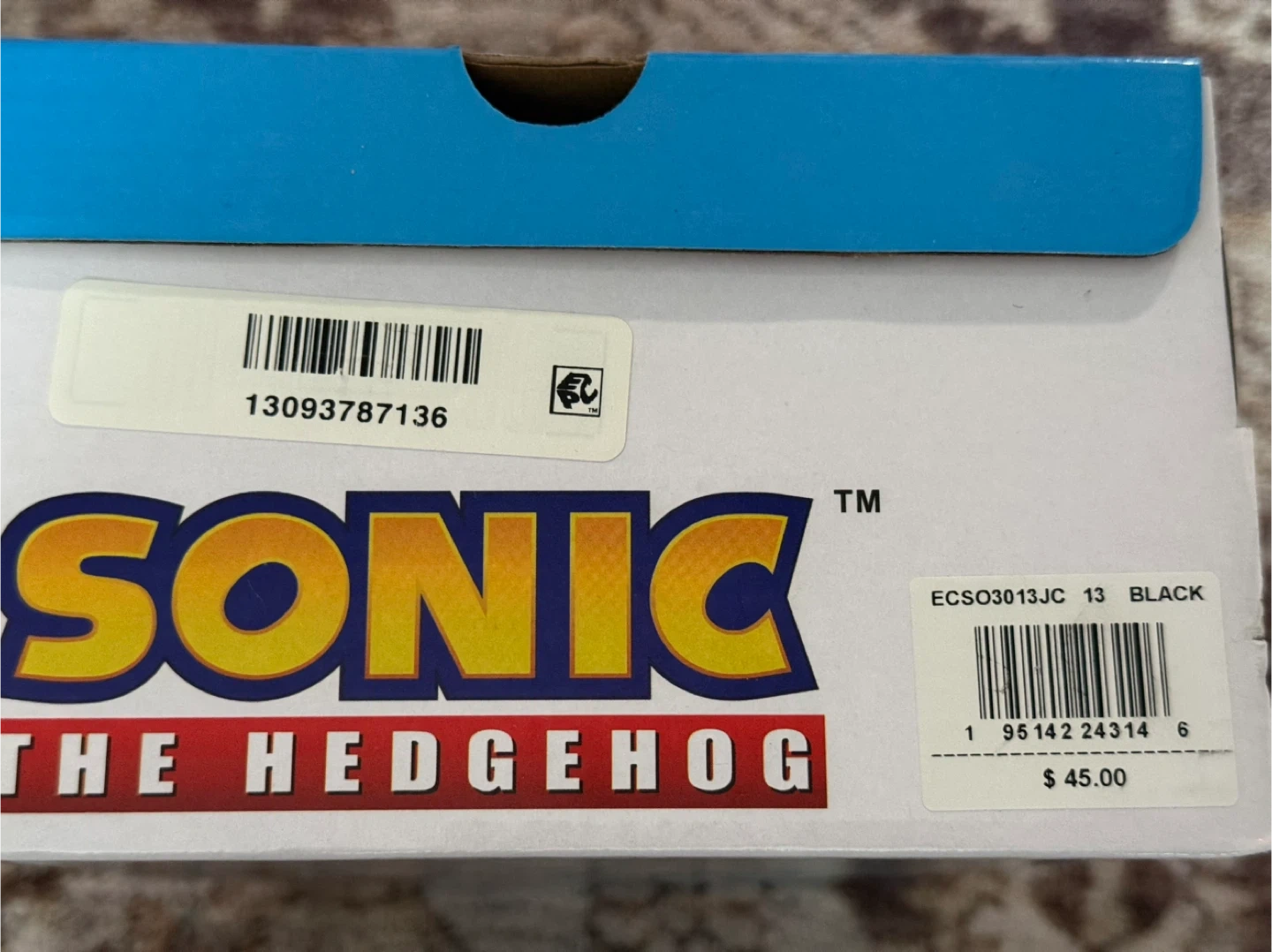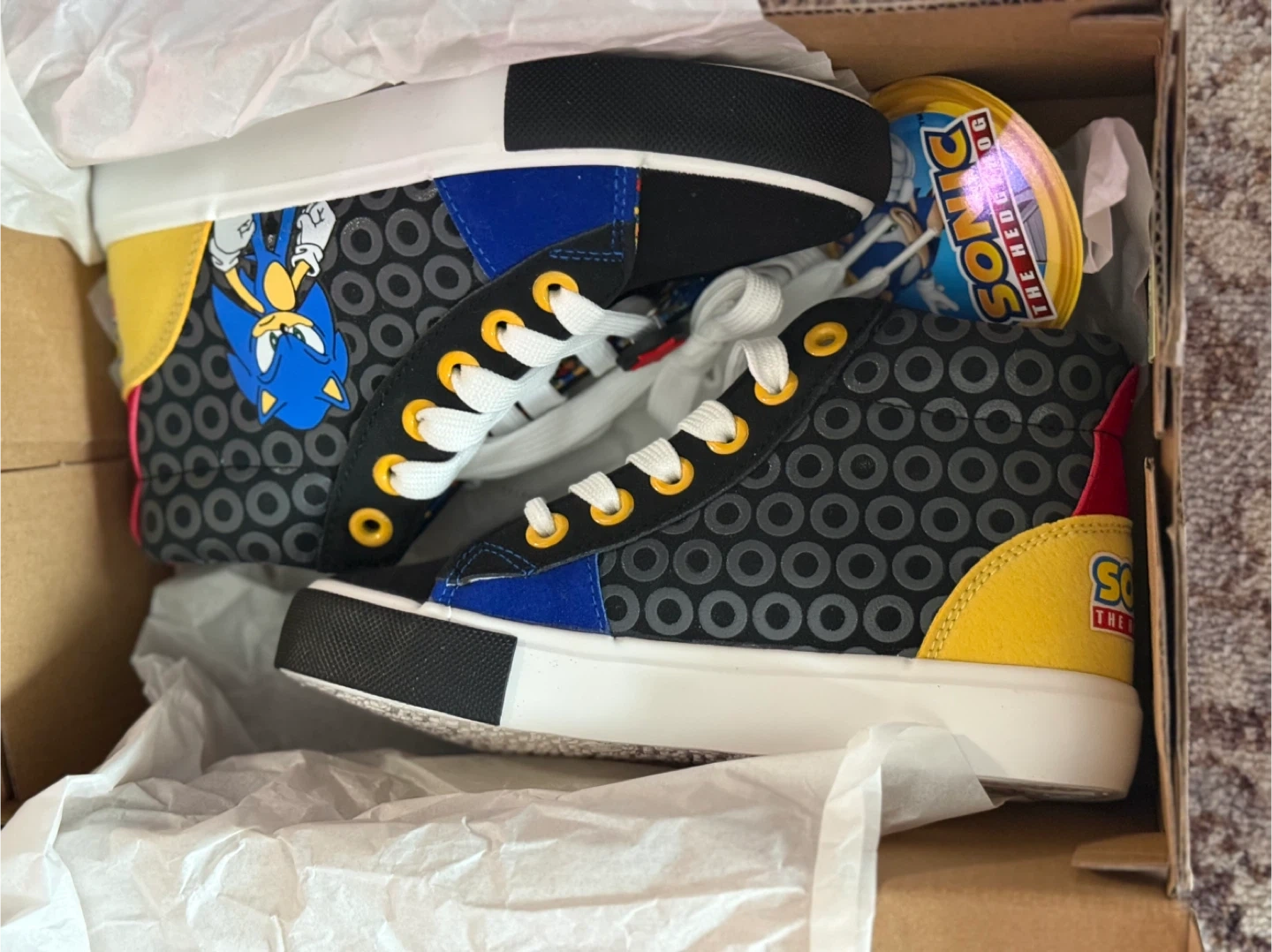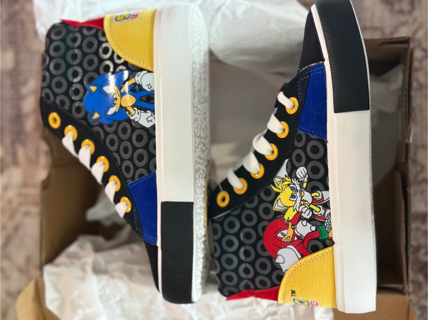 Selling a pair of brand new Sonic the Hedgehog high top sneakers! These come in the original box and feature Sonic, Tails, and Knuckles. The shoes are black with colorful accents and fun character designs. The box indicates the original price was $45.00