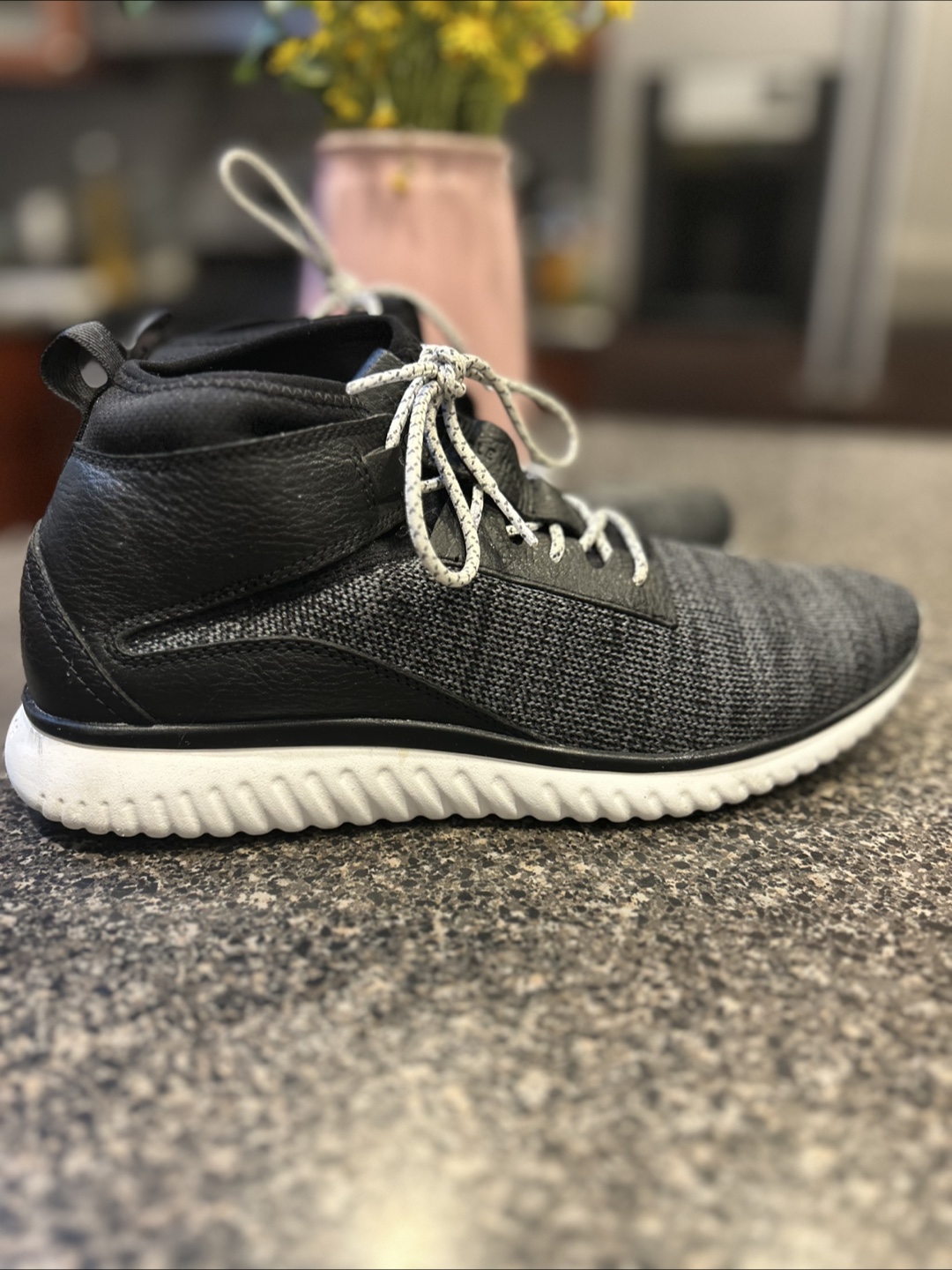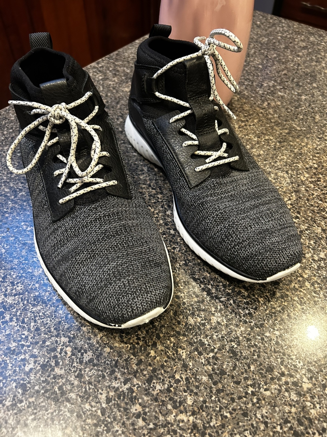 Black and gray mid-top sneakers. Comfortable, stylish, and perfect for everyday wear. Features a unique design and a cushioned sole.
